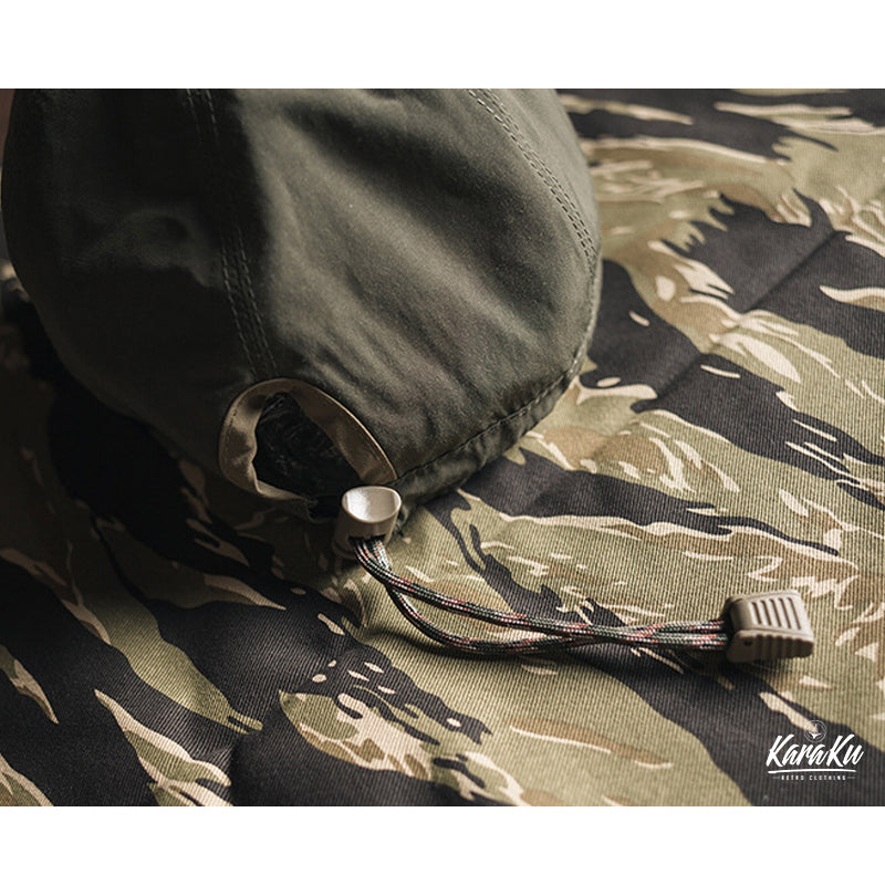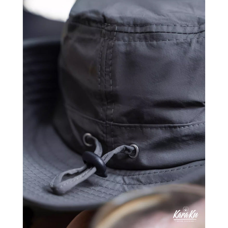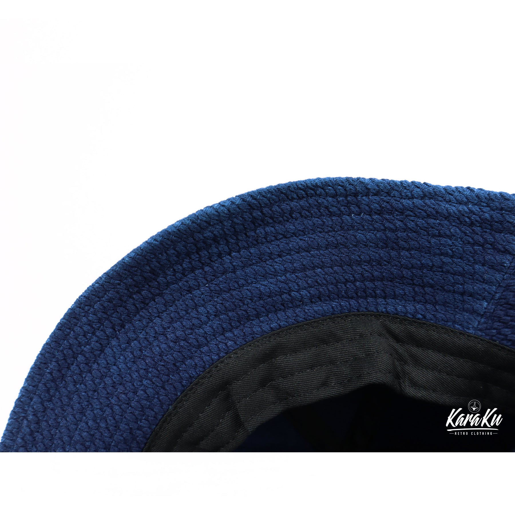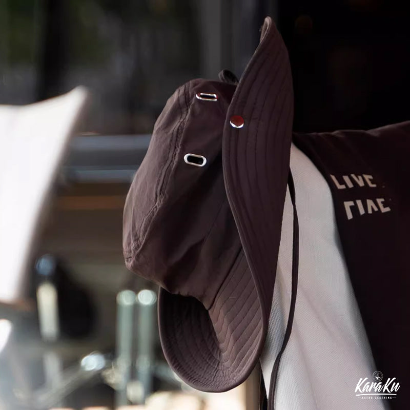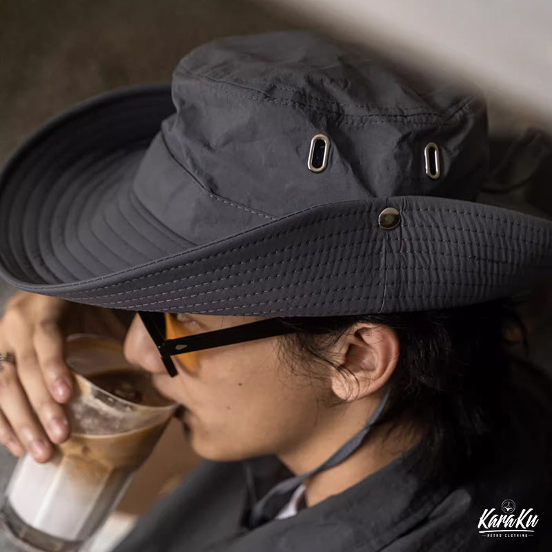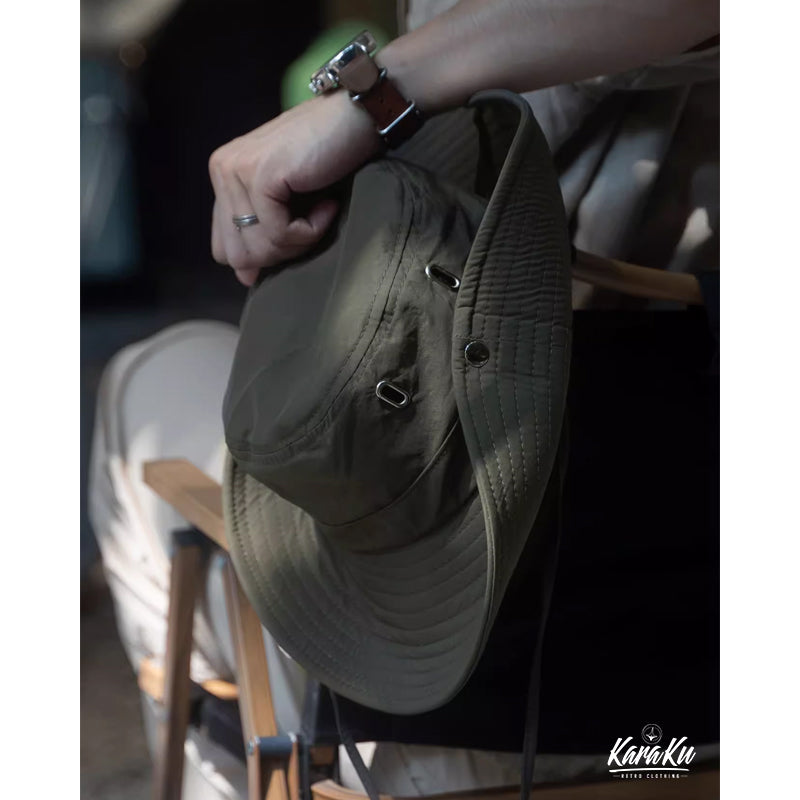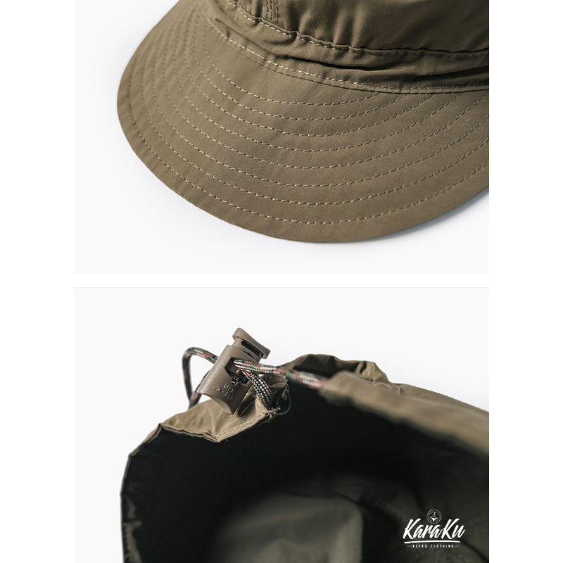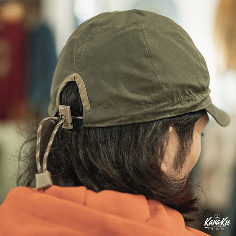 調整できる紐が付いていて、引き締めることで簡単なウォレットの形になる機能性満載のバケットハット。