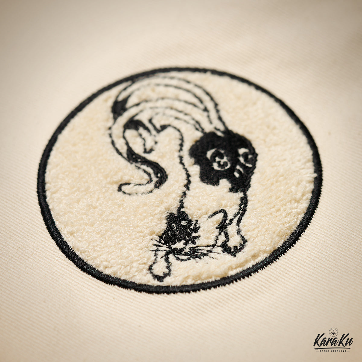 猫又の刺繍は、古くから語り継がれる妖怪伝説を大胆に表現し、