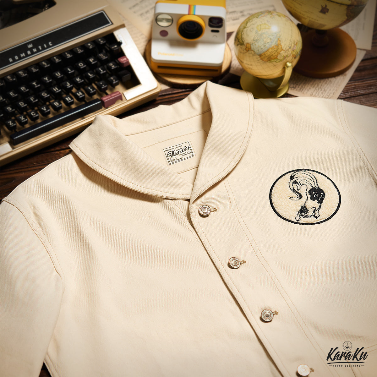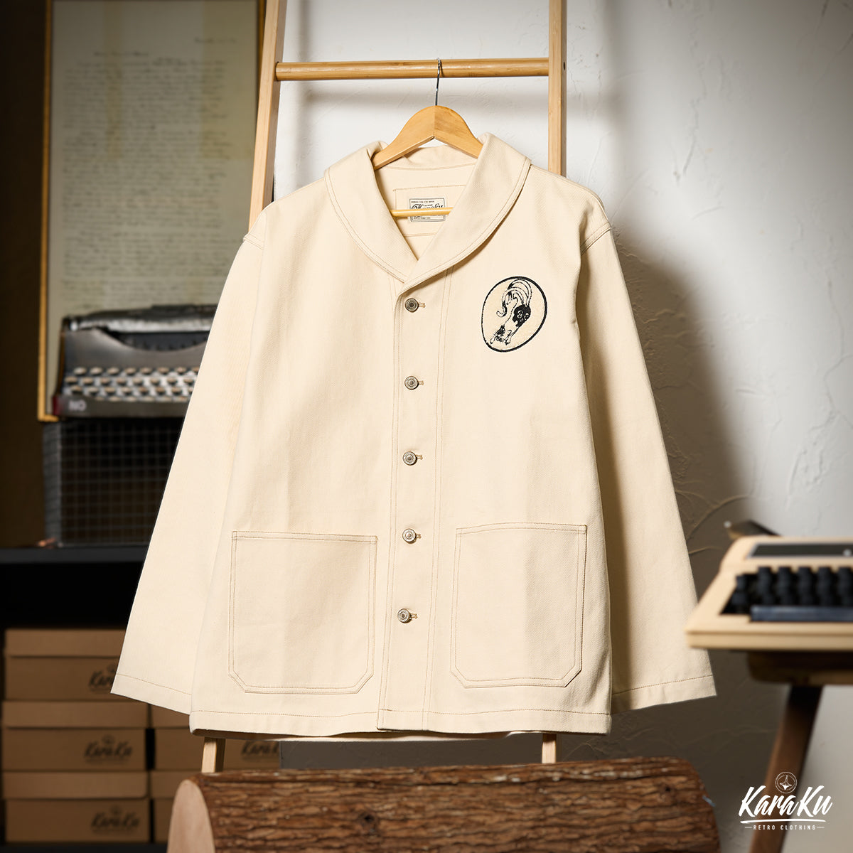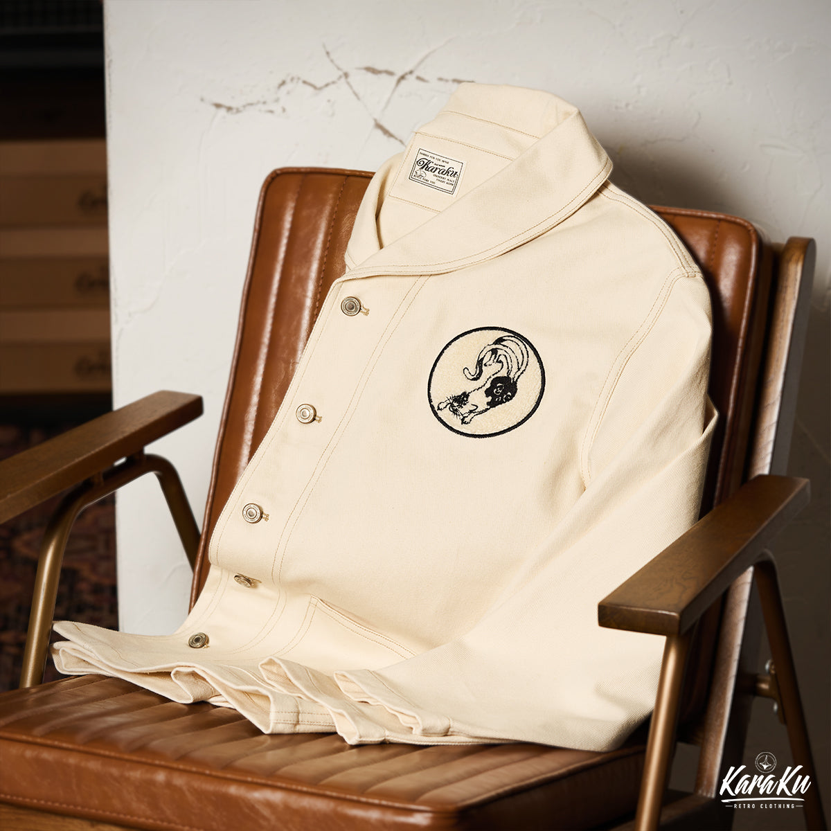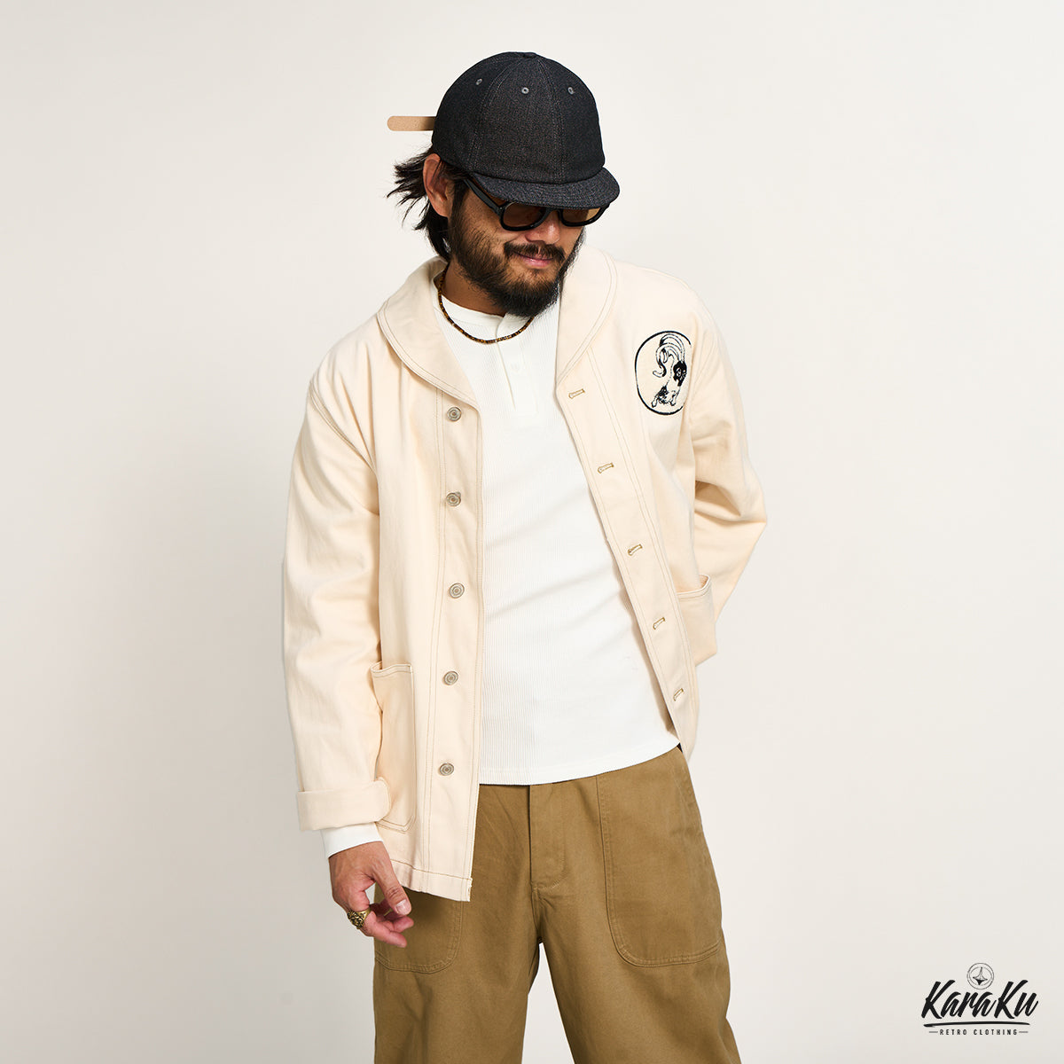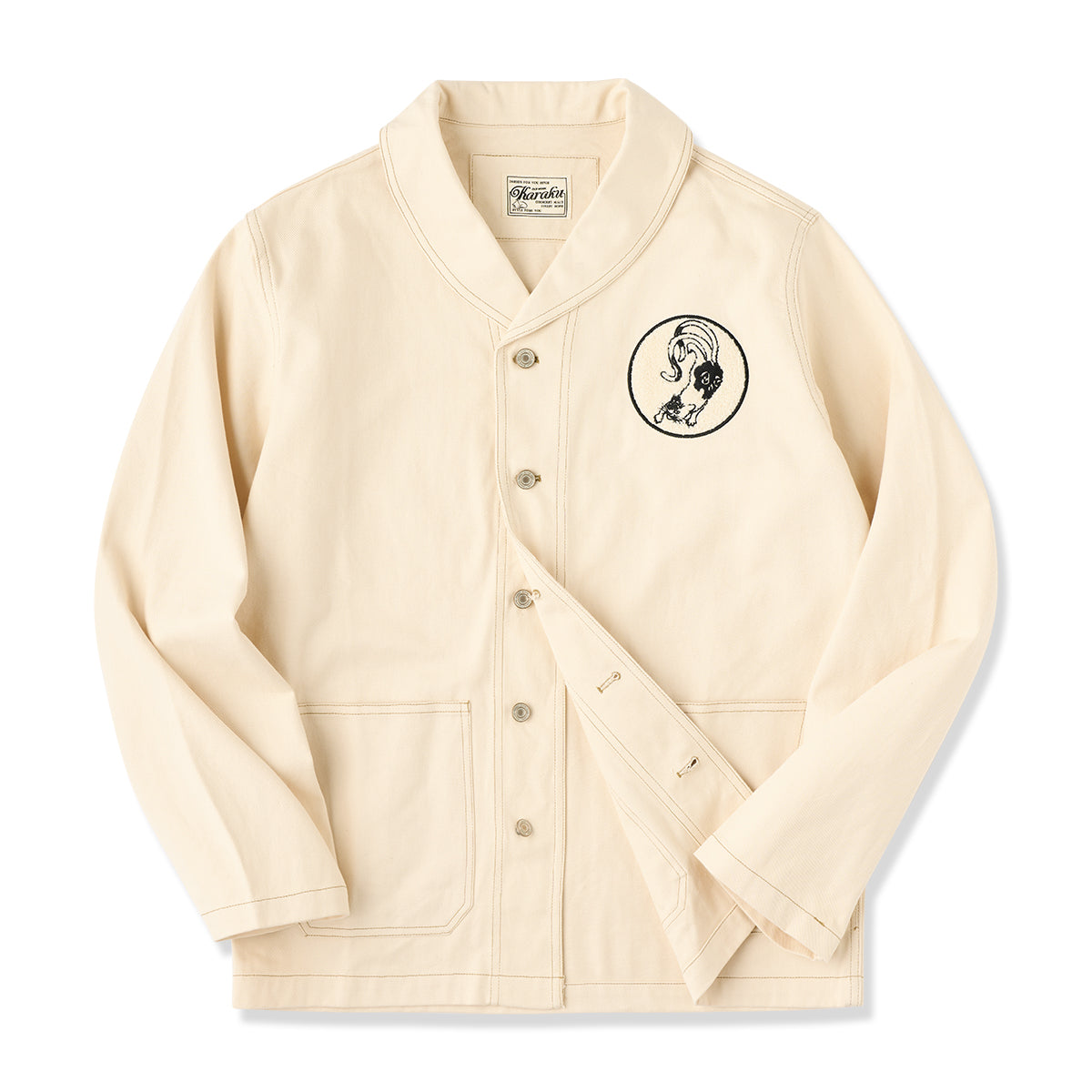 03.「妖怪・猫又」サガラ刺繍入りショールカラーデニムカバーオール