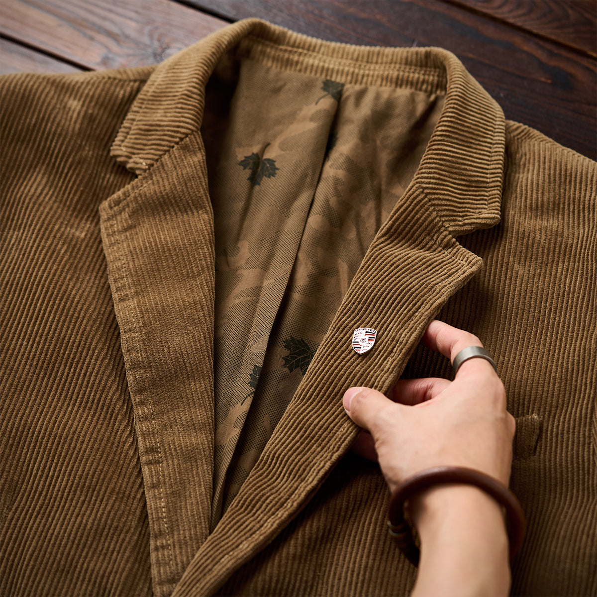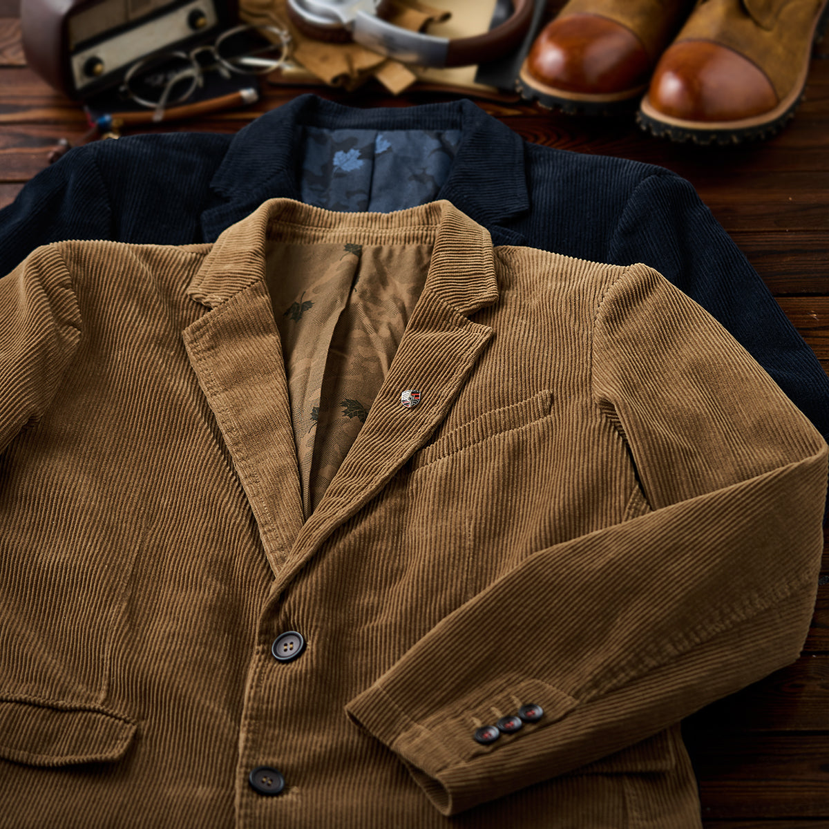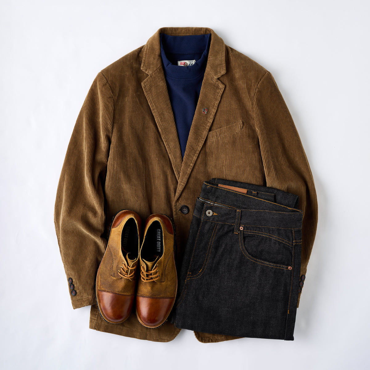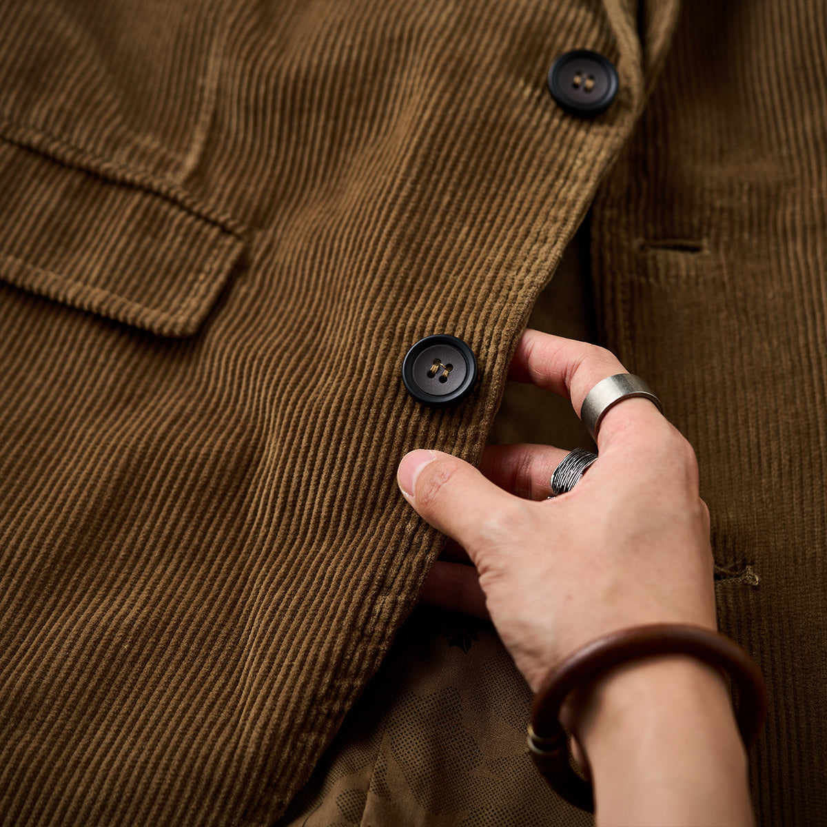 秋冬シーズンの定番アウターであるコーデュロイジャケットは、カジュアルさと上品さを兼ね備えています。ベージュやブラウンなどの温かみのある色合いは秋らしい雰囲気を簡単に演出できます。KARAKUが一押しのアイテムはこちらのブルーのコーデュロイジャケットです。どんなスタイルにもマッチし、重ね着もしやすく、オフィスにもカジュアルシーンにも活用できる万能アイテムです。