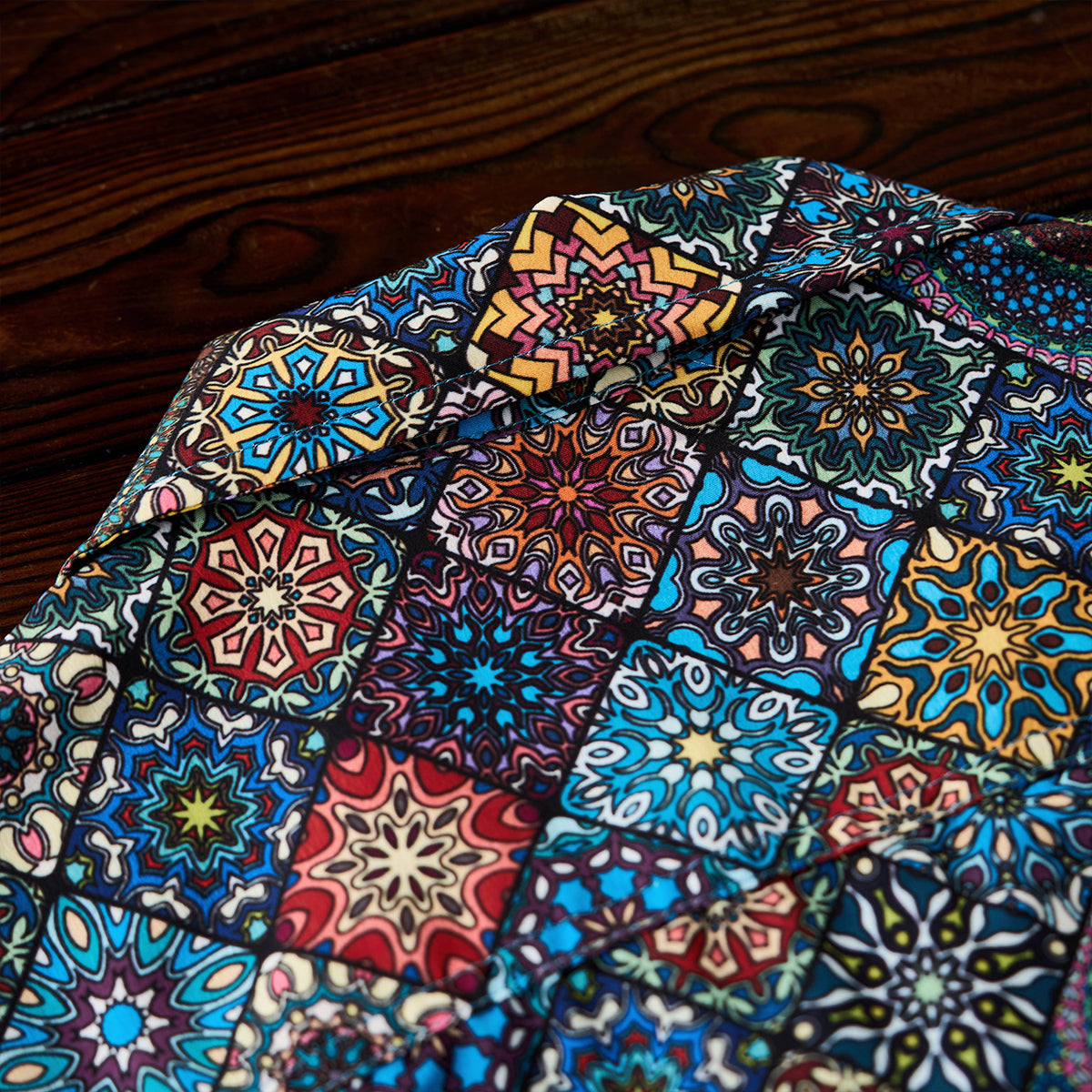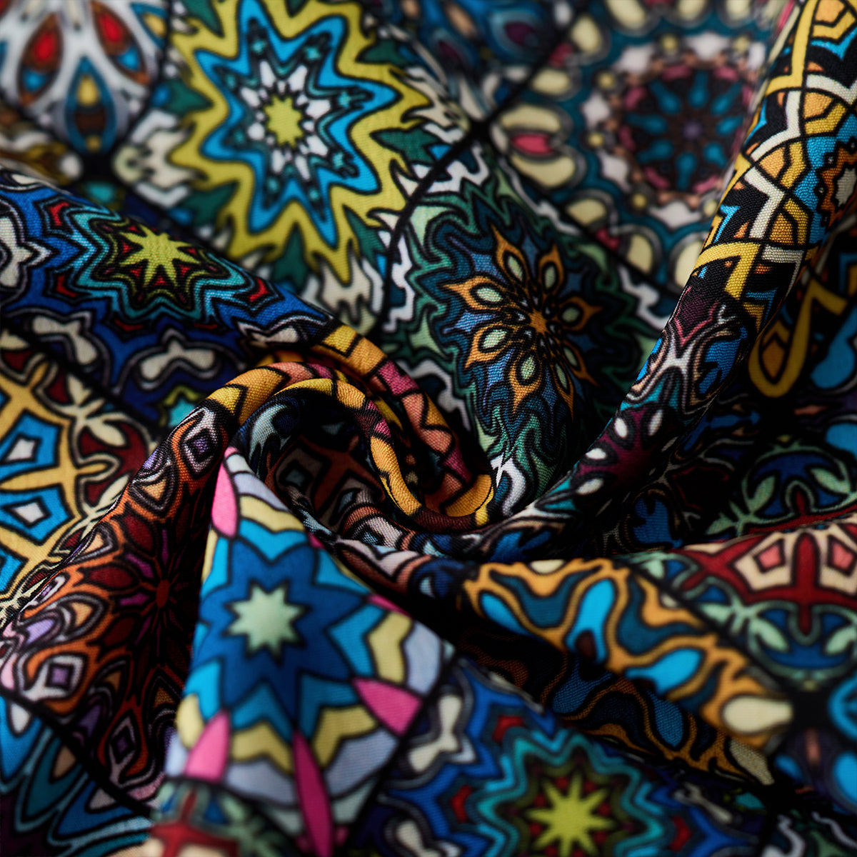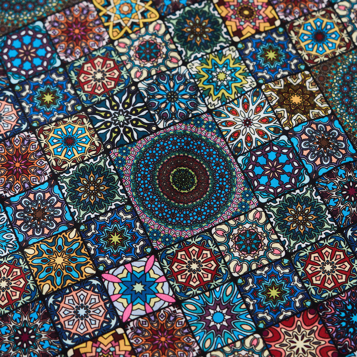 万華鏡総柄のデザインは、回転、反射、拡大縮小などの変形を組み合わせて作られ、