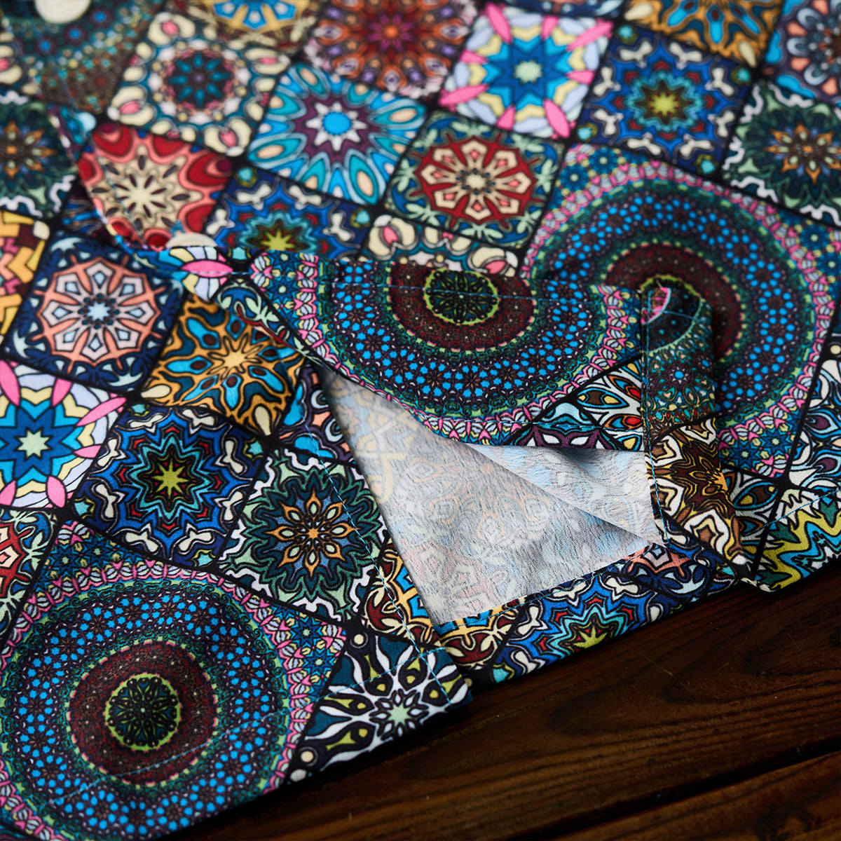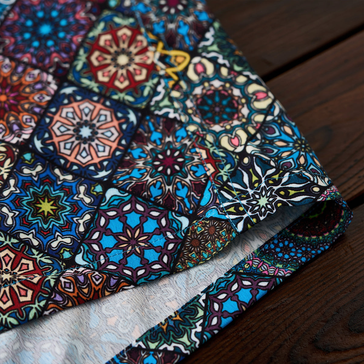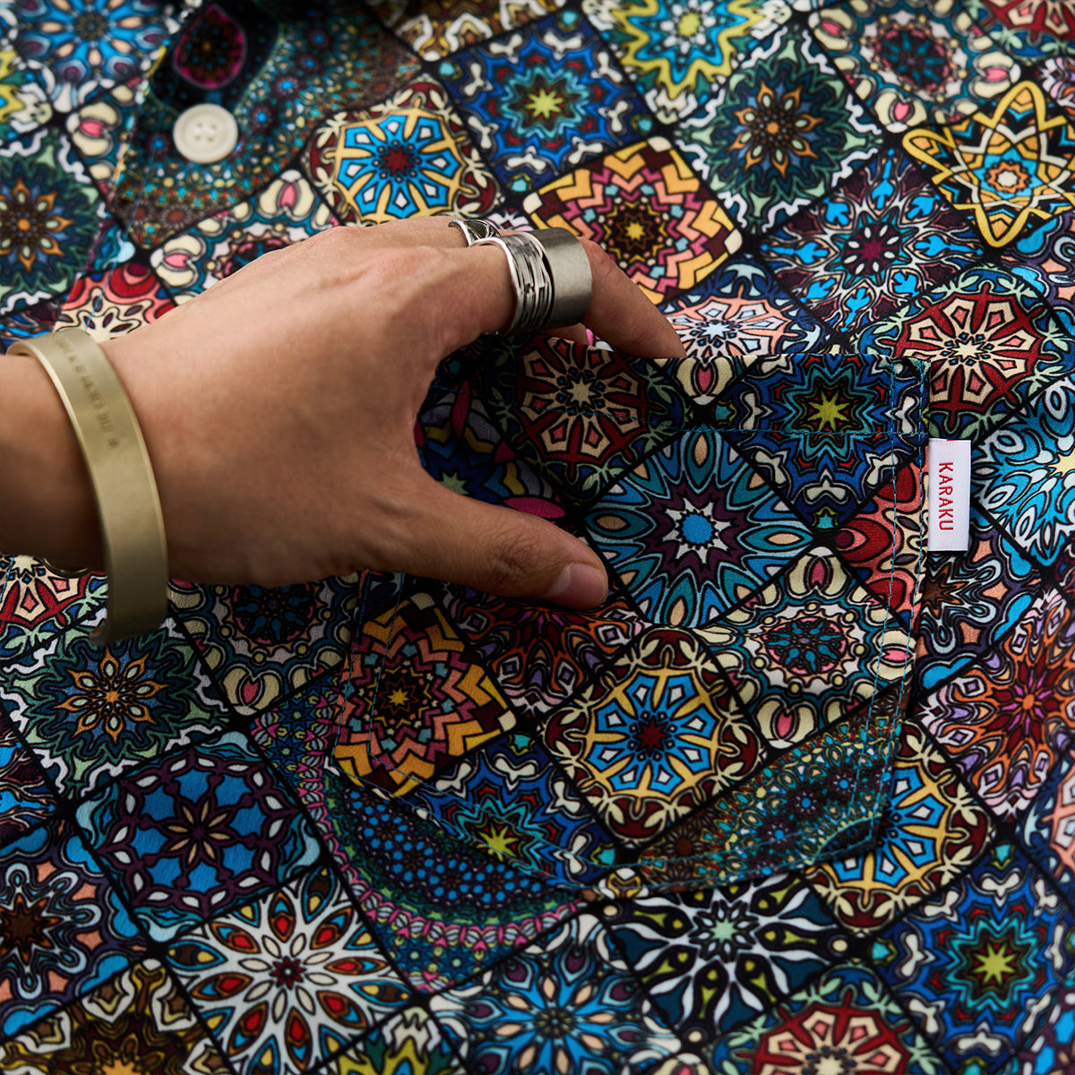 万華鏡総柄のデザインは、回転、反射、拡大縮小などの変形を組み合わせて作られ、