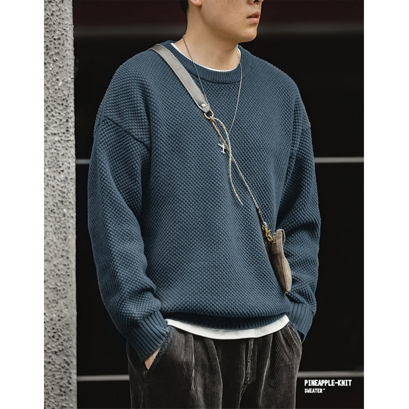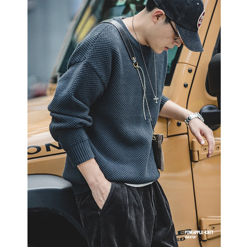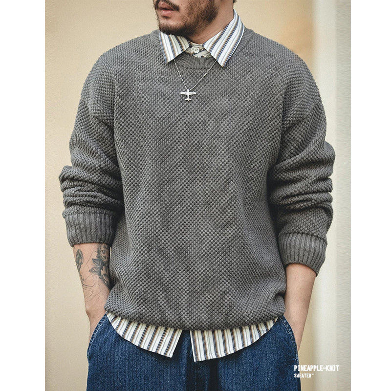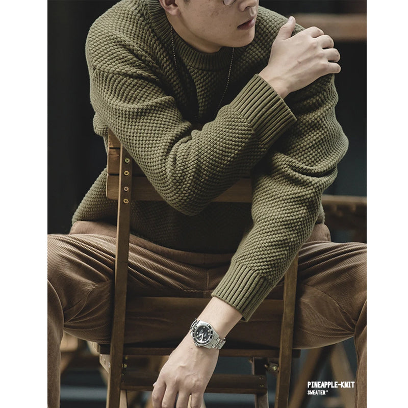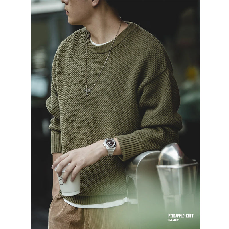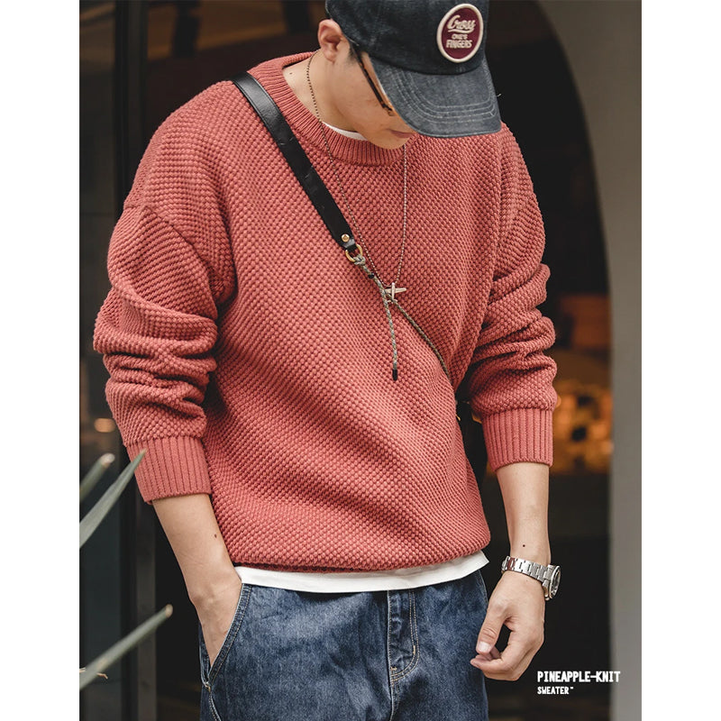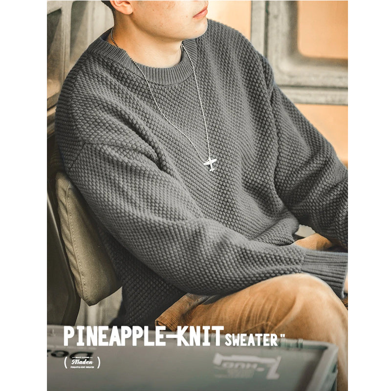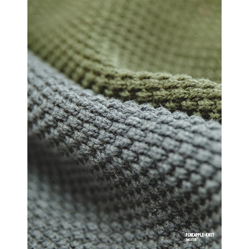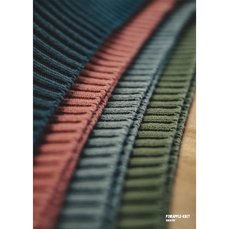全体は立体感で表現してるパイナップルパイルニットセーターは、凹凸のテキスチャーがあり。太めの毛糸を使用し、繊細と綺麗な織り方で作られ、しっかりとしています。