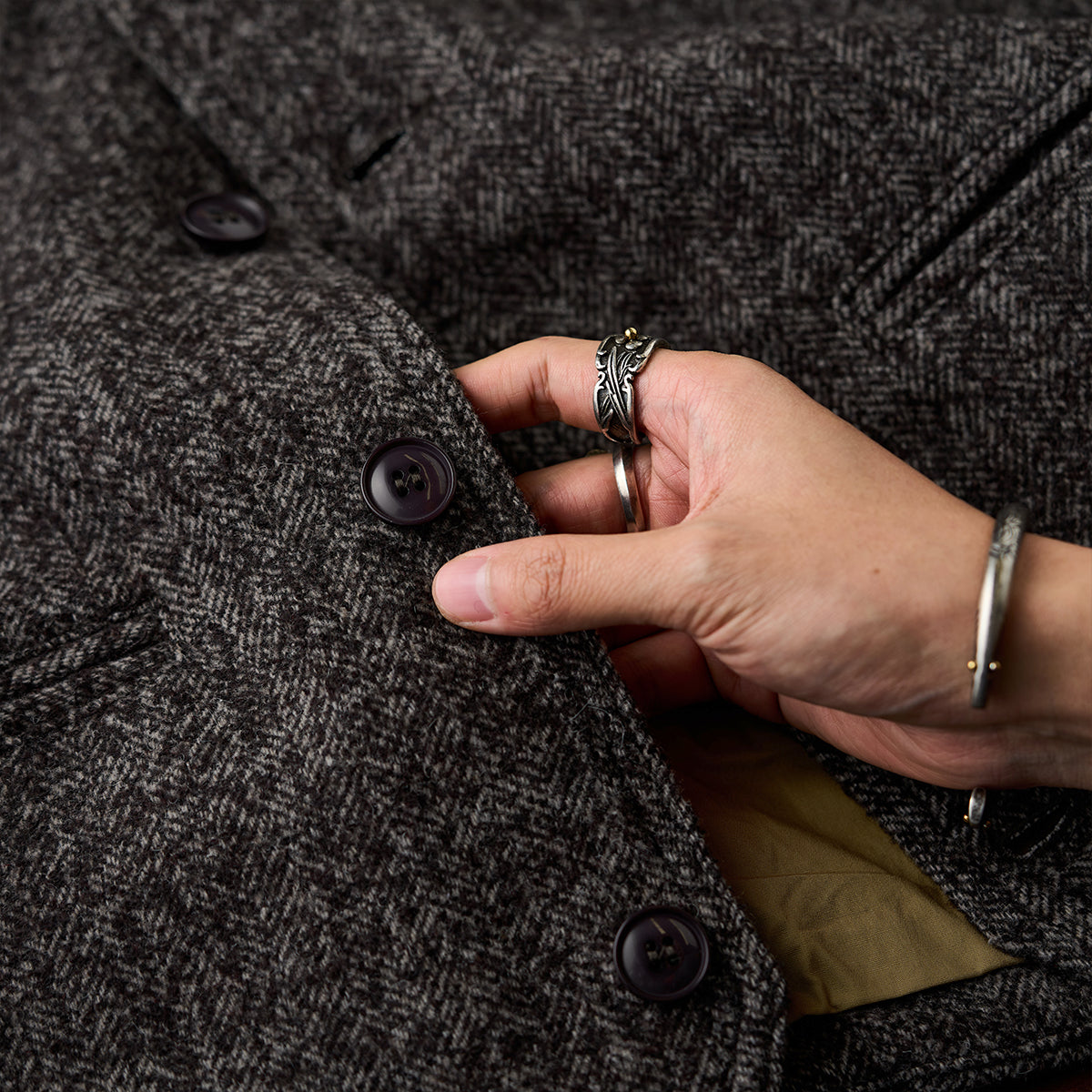 高級の手織りのウール混ツイード素材を贅沢に使い、品格あるジャケットに仕上げました。クラシックな雰囲気を持ち合わせるざっくりとした生地は、軽量で絶妙なツイルとカラーの高級感溢れるデザインです。