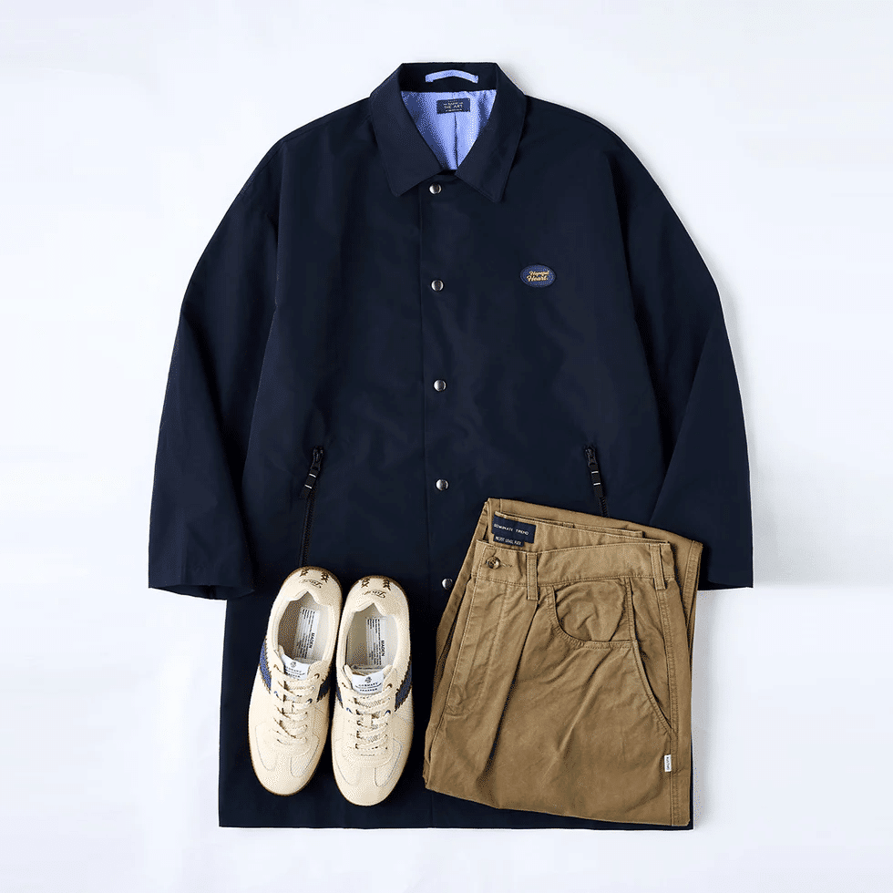 Teflon加工の高機能バルマカーンは“都会的 × 実用性”が魅力なので、カーキのチノパンと合わせると上品さとワーク感のバランスがとれた大人コーデ に仕上がります。
