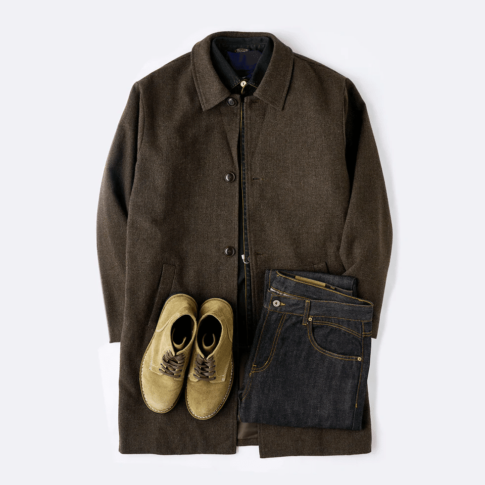 コートは 都会的で上品な機能アウター なので、デニムパンツとスエードワークブーツと組み合わせると 大人のカジュアルミリタリーコーデ に仕上がります。