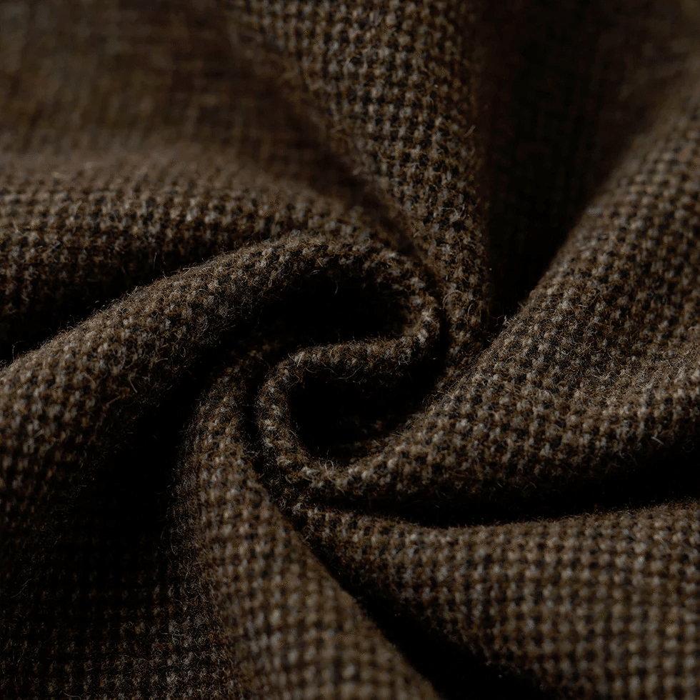 ウール混紡が使用されて、ツイード織り特有の温かみと耐久性が感じられます。チェック柄が控えめに織り込まれていることで、クラシックで落ち着いた印象を与えます。