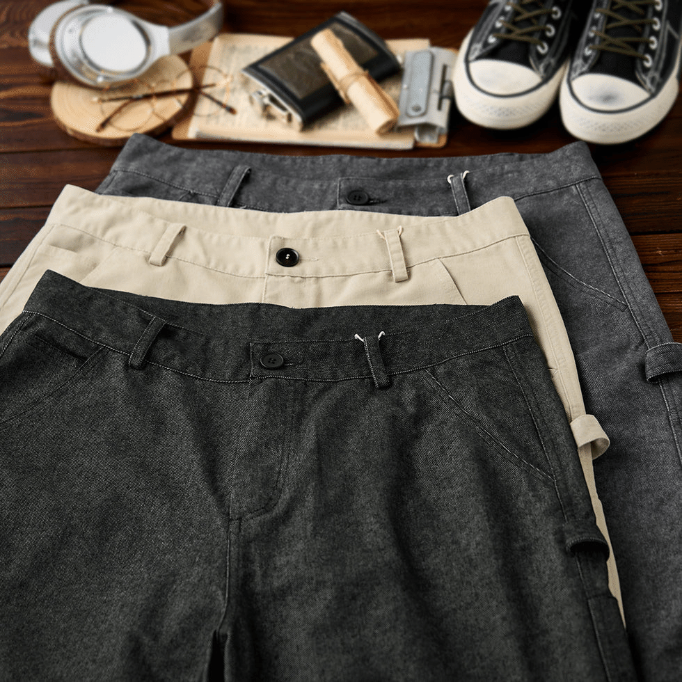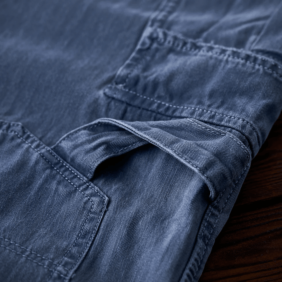 ヘリンボーンツイルのしっかりとした生地感と、ハンマーループ付きのディテールがワークスタイルを引き立てる一本。カーゴポケットの実用性とデザイン性が両立しており、ブーツやスニーカーとの相性も抜群。ラフに穿いても、どこか存在感を放ちます。