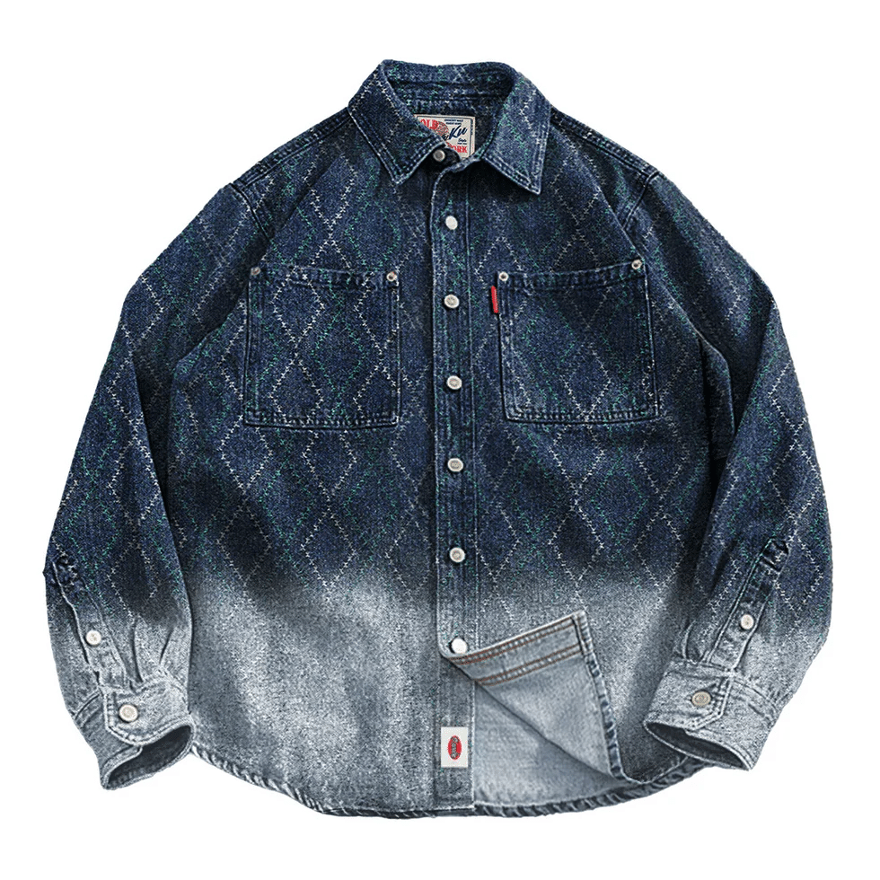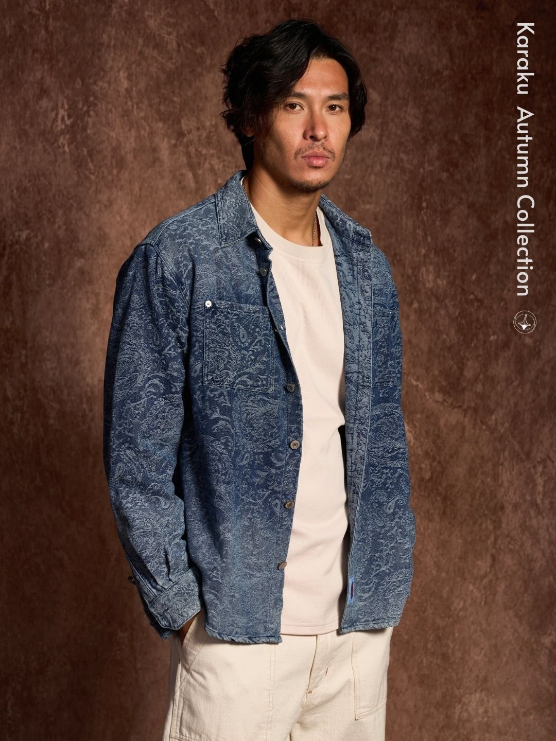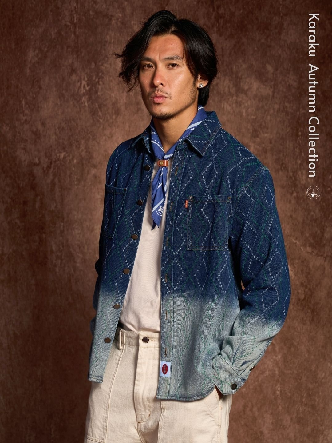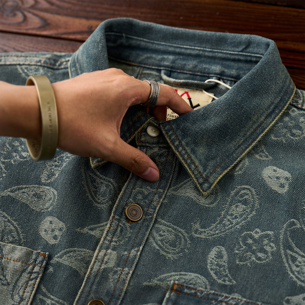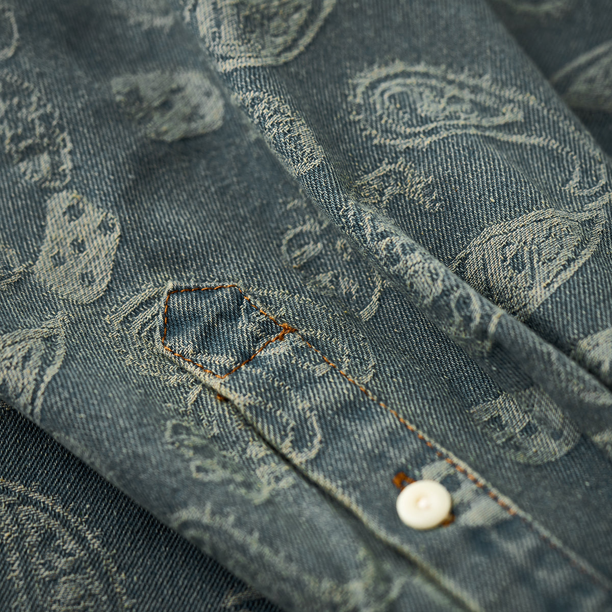 モンキーワッシュ加工による大胆なグラデーションが印象的なデニムシャツ。上から下へと自然に移ろう色落ちが、スタイリングに立体感と躍動感を与えます。さらに、ダイヤジャカード織りの幾何学模様が加わることで、ヴィンテージ感とモダンなエッセンスを融合。