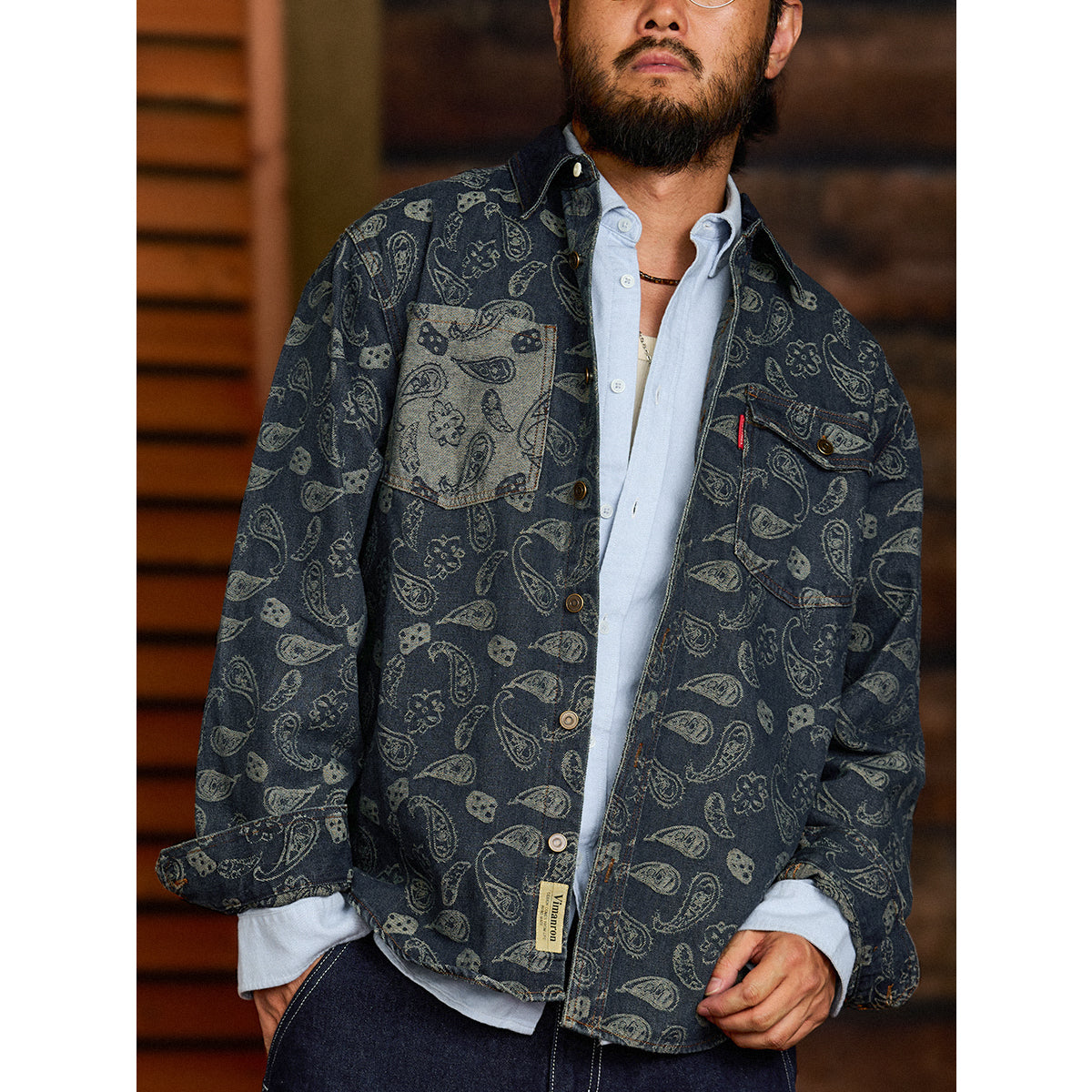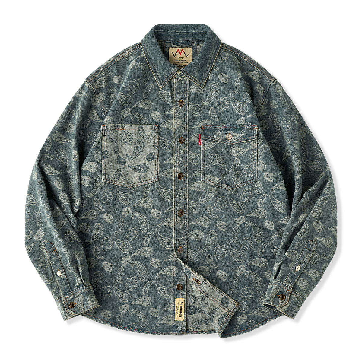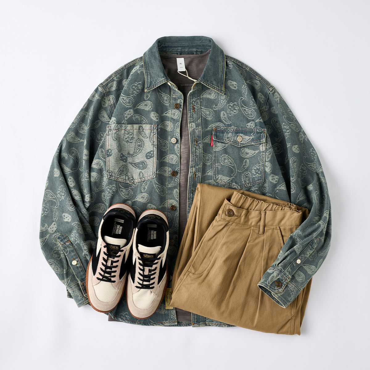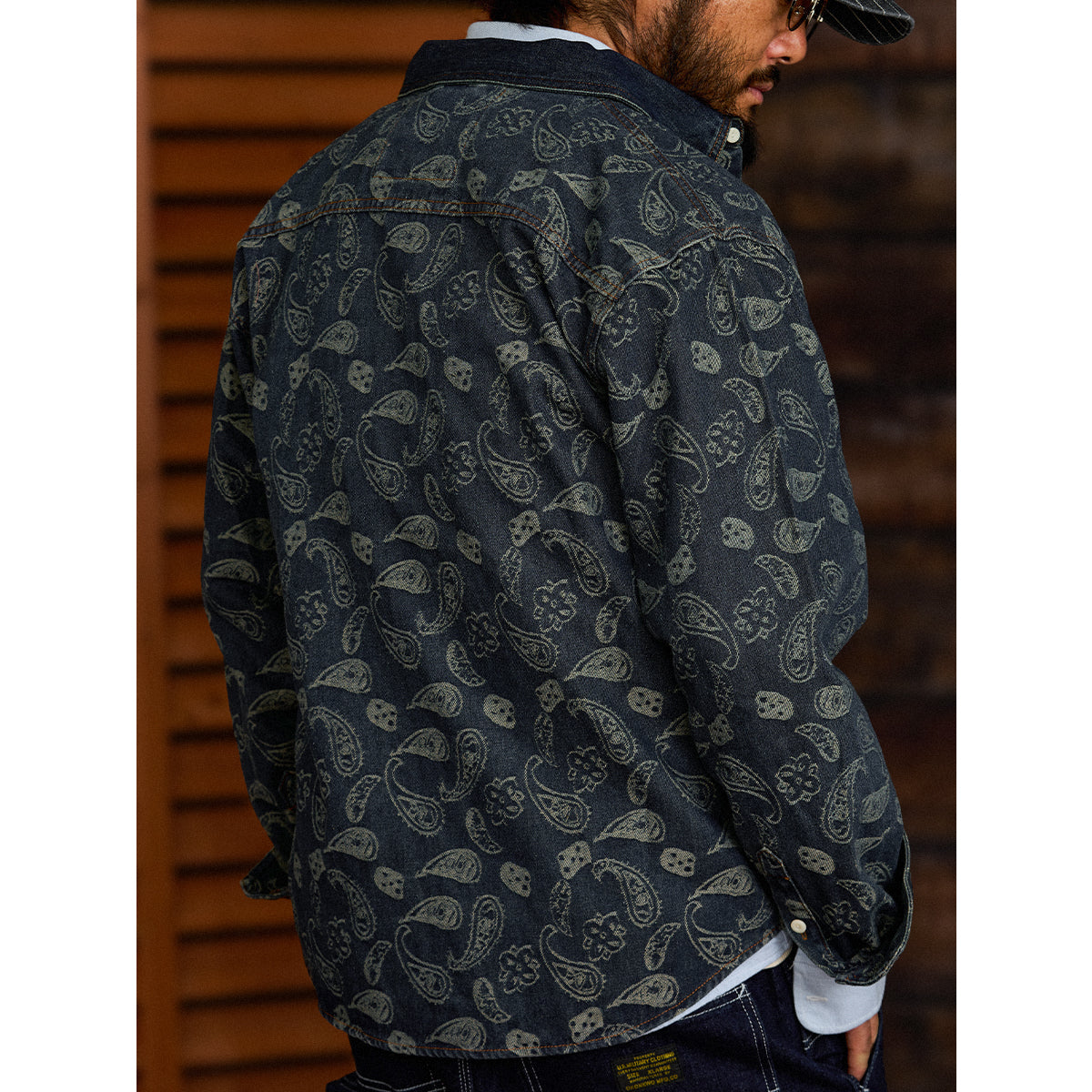 モンキーワッシュ加工による大胆なグラデーションが印象的なデニムシャツ。上から下へと自然に移ろう色落ちが、スタイリングに立体感と躍動感を与えます。さらに、ダイヤジャカード織りの幾何学模様が加わることで、ヴィンテージ感とモダンなエッセンスを融合。