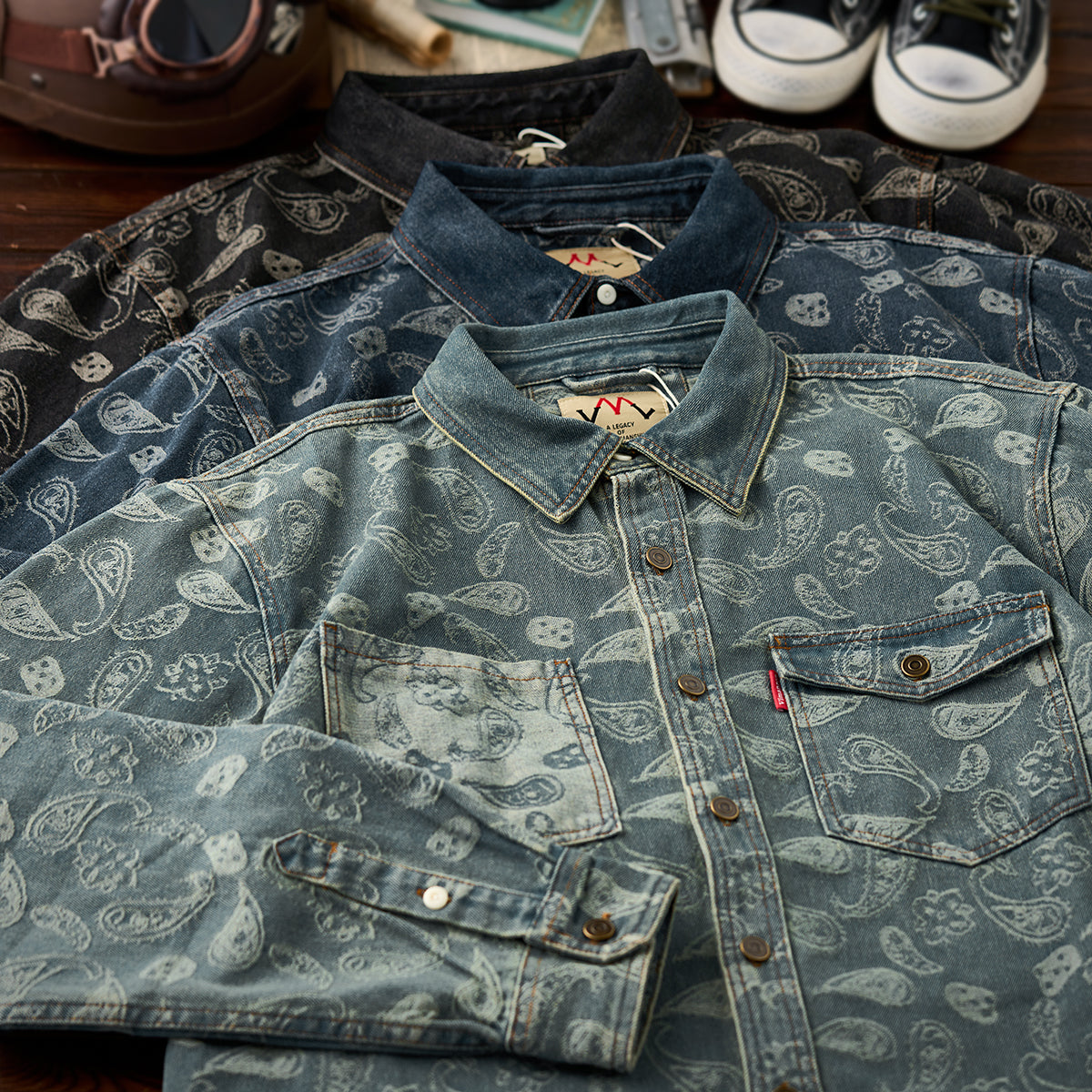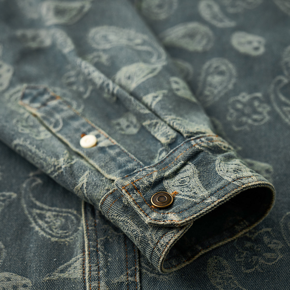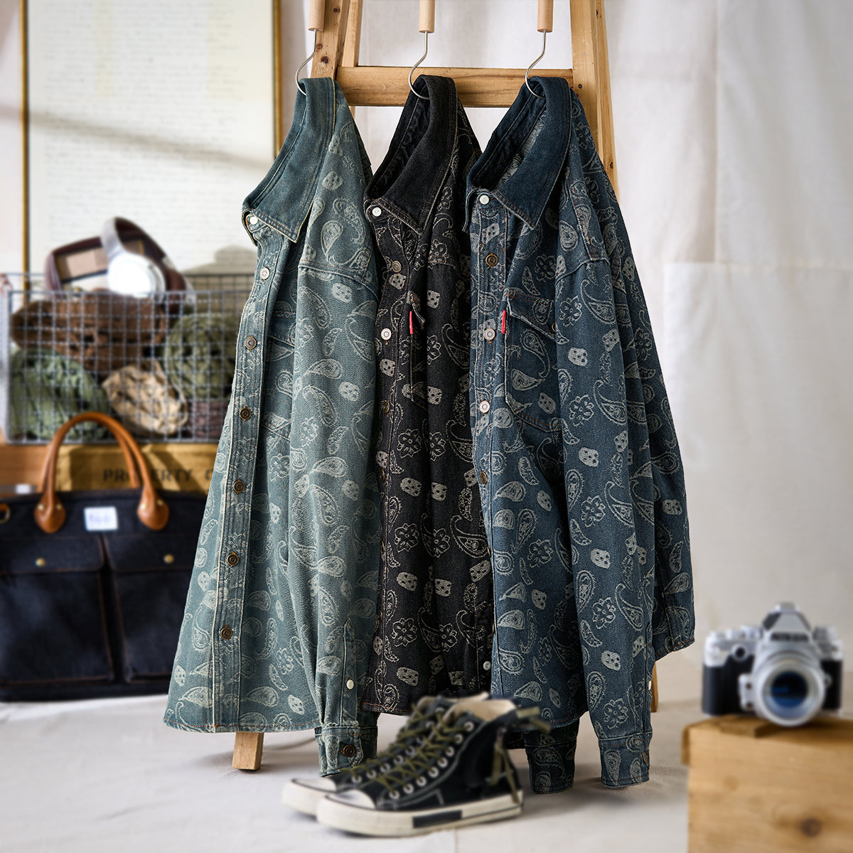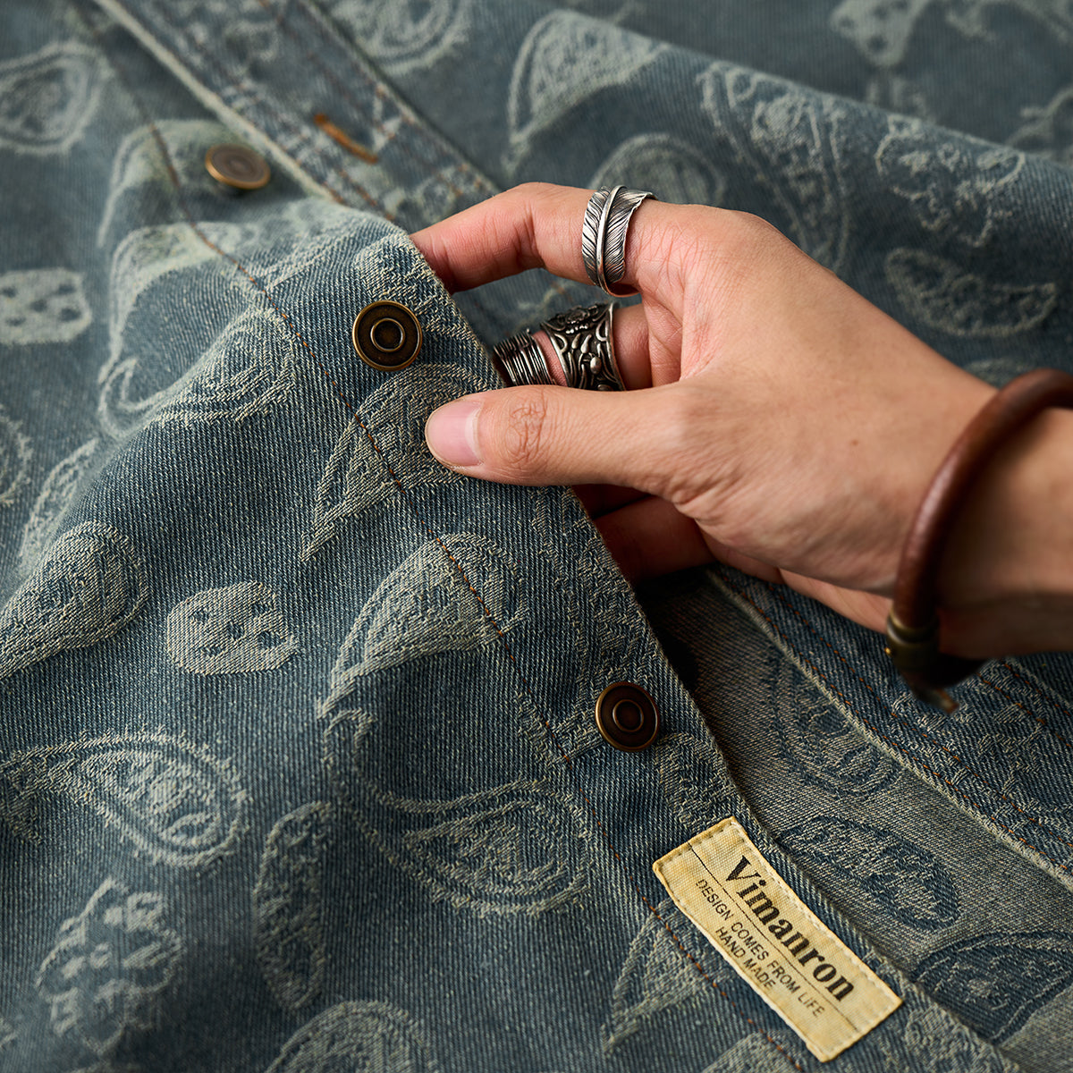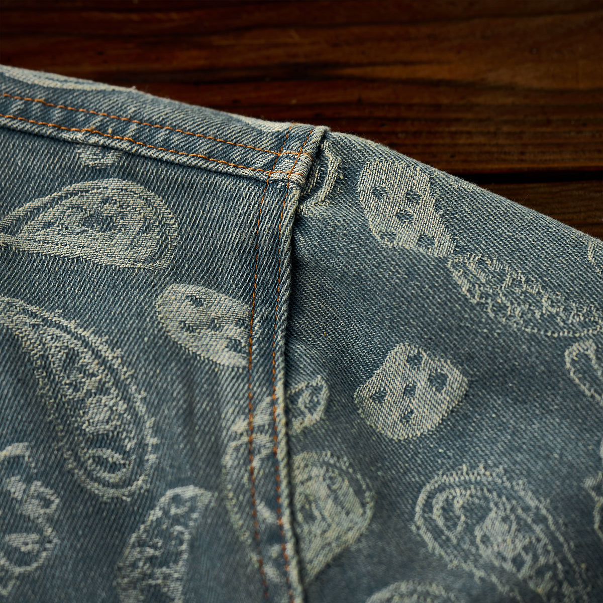 モンキーワッシュ加工による大胆なグラデーションが印象的なデニムシャツ。上から下へと自然に移ろう色落ちが、スタイリングに立体感と躍動感を与えます。さらに、ダイヤジャカード織りの幾何学模様が加わることで、ヴィンテージ感とモダンなエッセンスを融合。