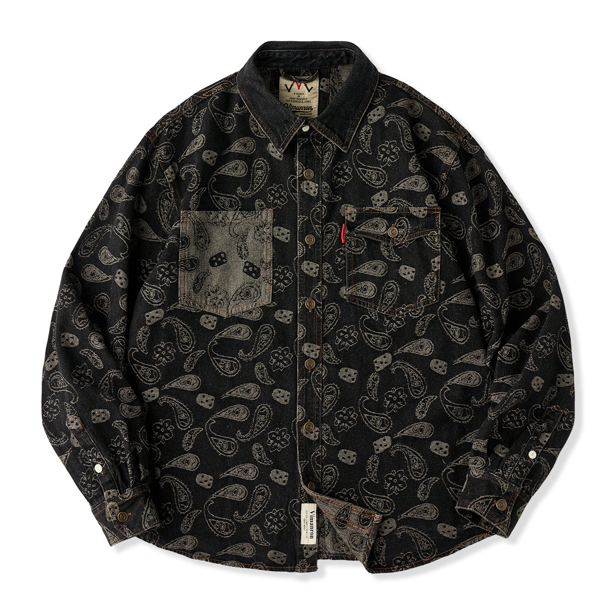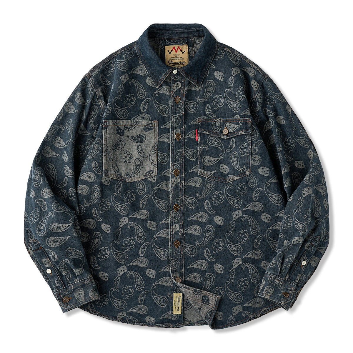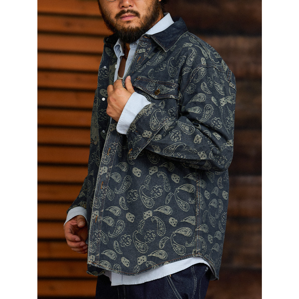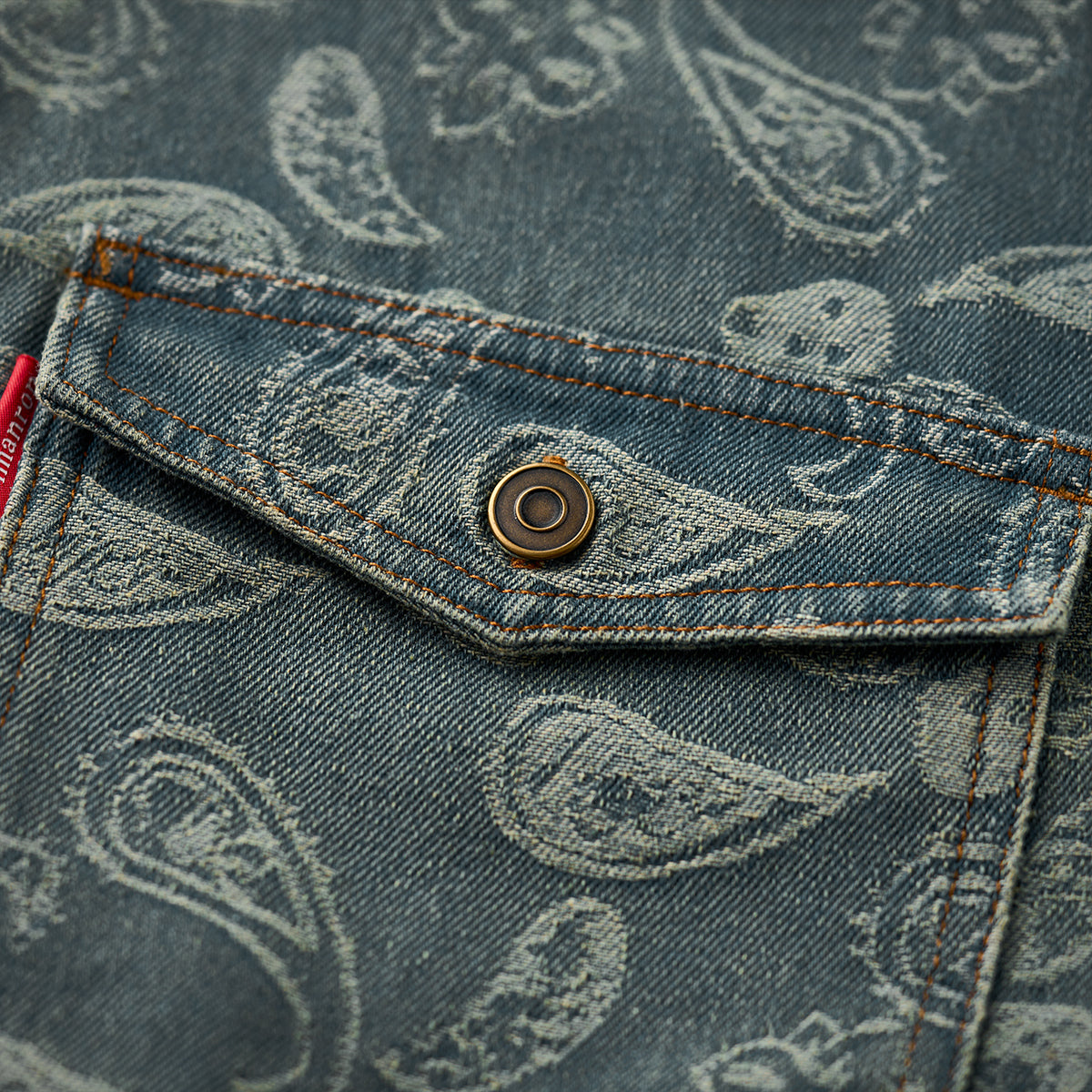 モンキーワッシュ加工による大胆なグラデーションが印象的なデニムシャツ。上から下へと自然に移ろう色落ちが、スタイリングに立体感と躍動感を与えます。さらに、ダイヤジャカード織りの幾何学模様が加わることで、ヴィンテージ感とモダンなエッセンスを融合。