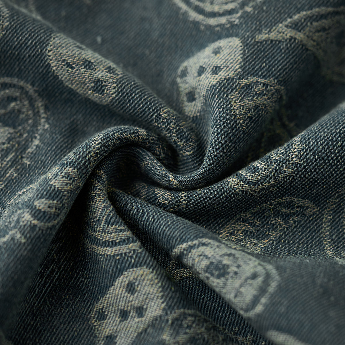 両肩から胸元にかけて、左右対称に配置されたエスニック調シェニール織りの生地が目を引く。シェニール素材は柔らかく起毛した質感が特徴で、デニムの粗さとの対比が際立っている。