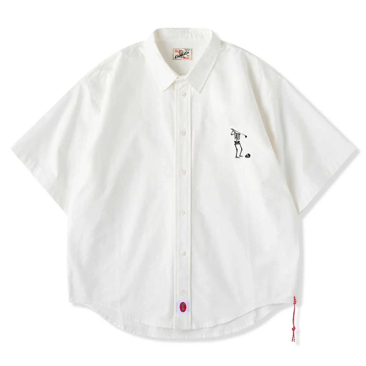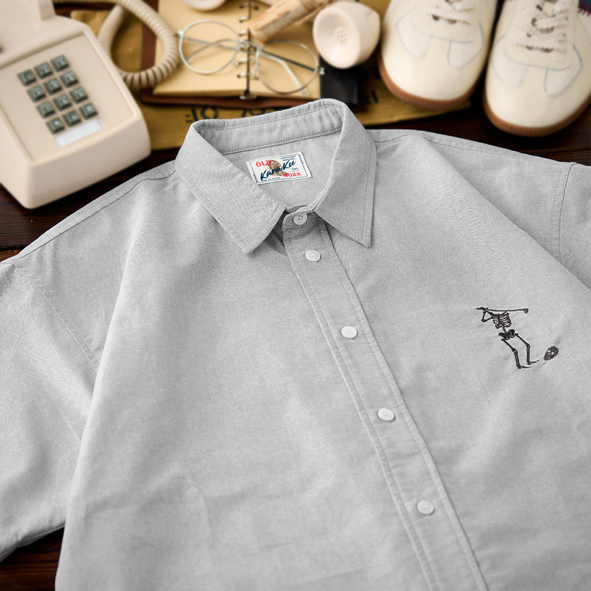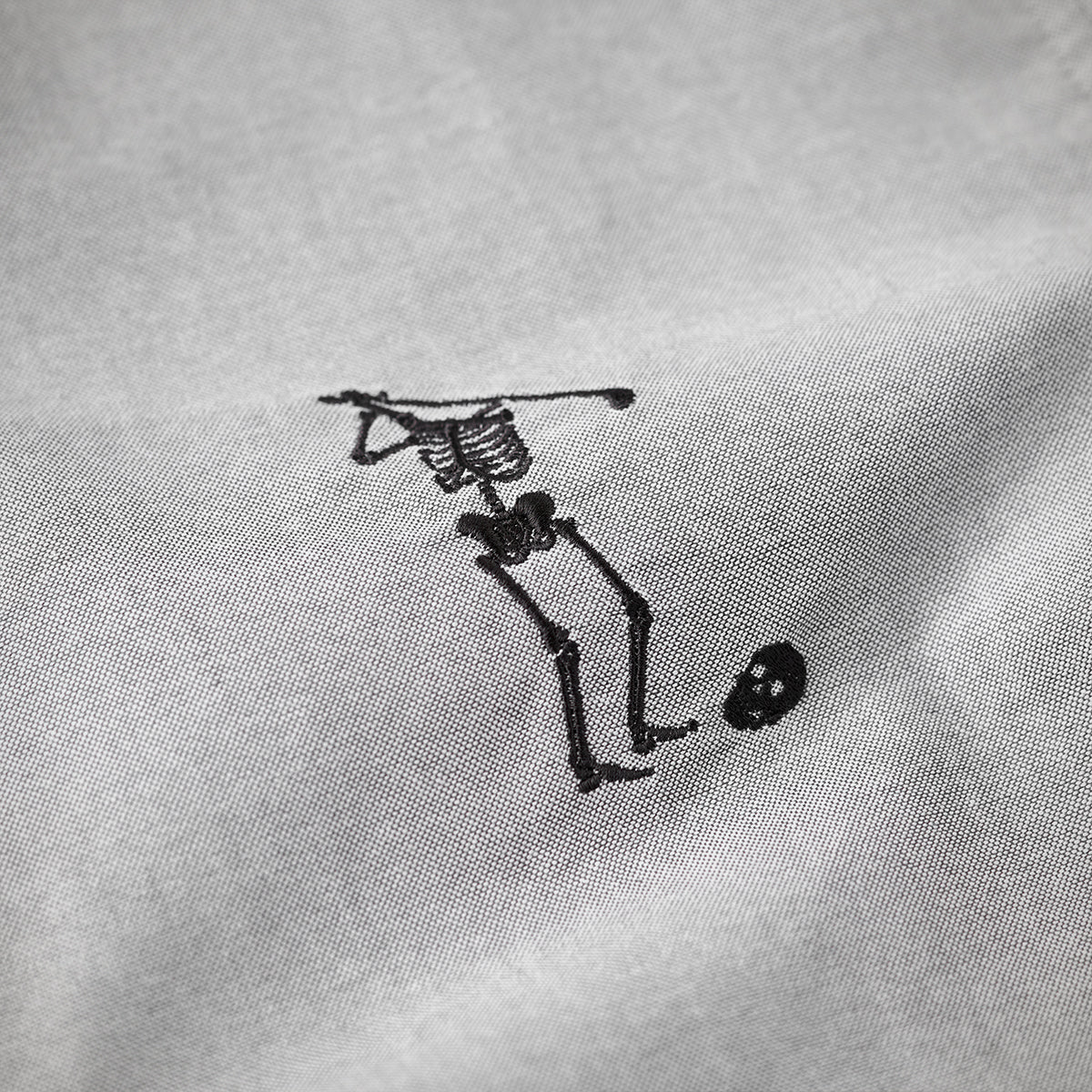 Item04.赤ヒモ付き 「ゴルフスイングの首が落ちた骸骨」刺繍入りオックスフォード長袖シャツ