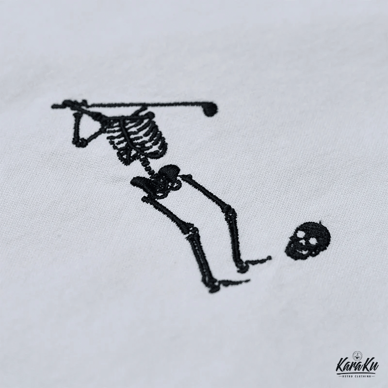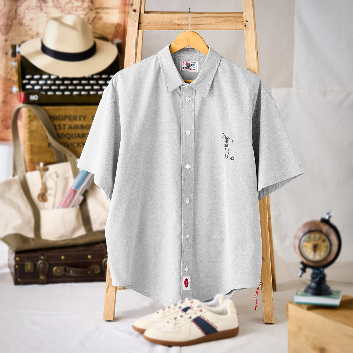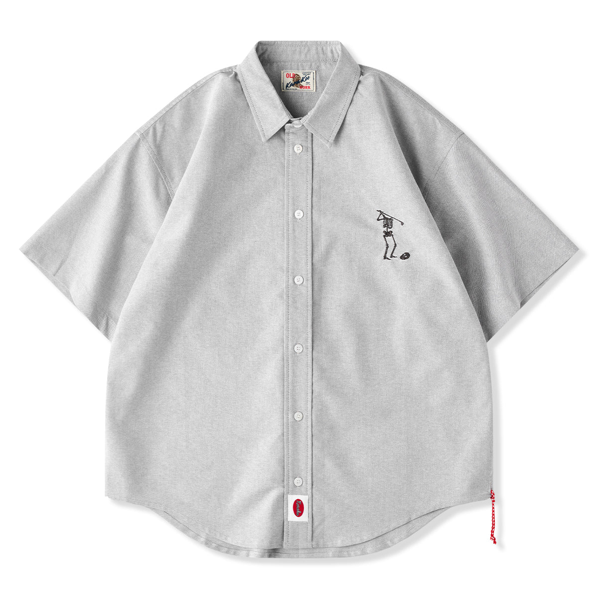 Item04.赤ヒモ付き 「ゴルフスイングの首が落ちた骸骨」刺繍入りオックスフォード長袖シャツ