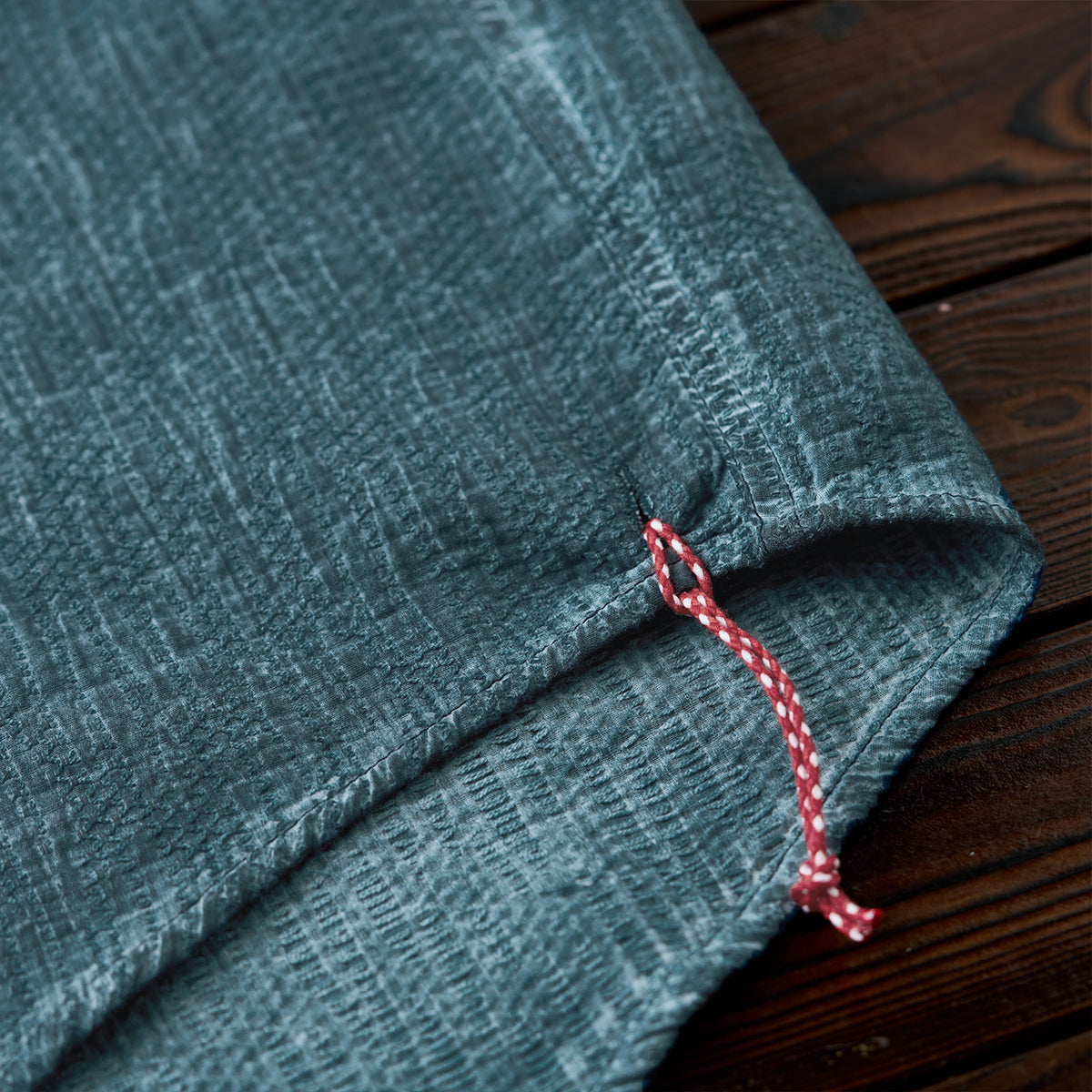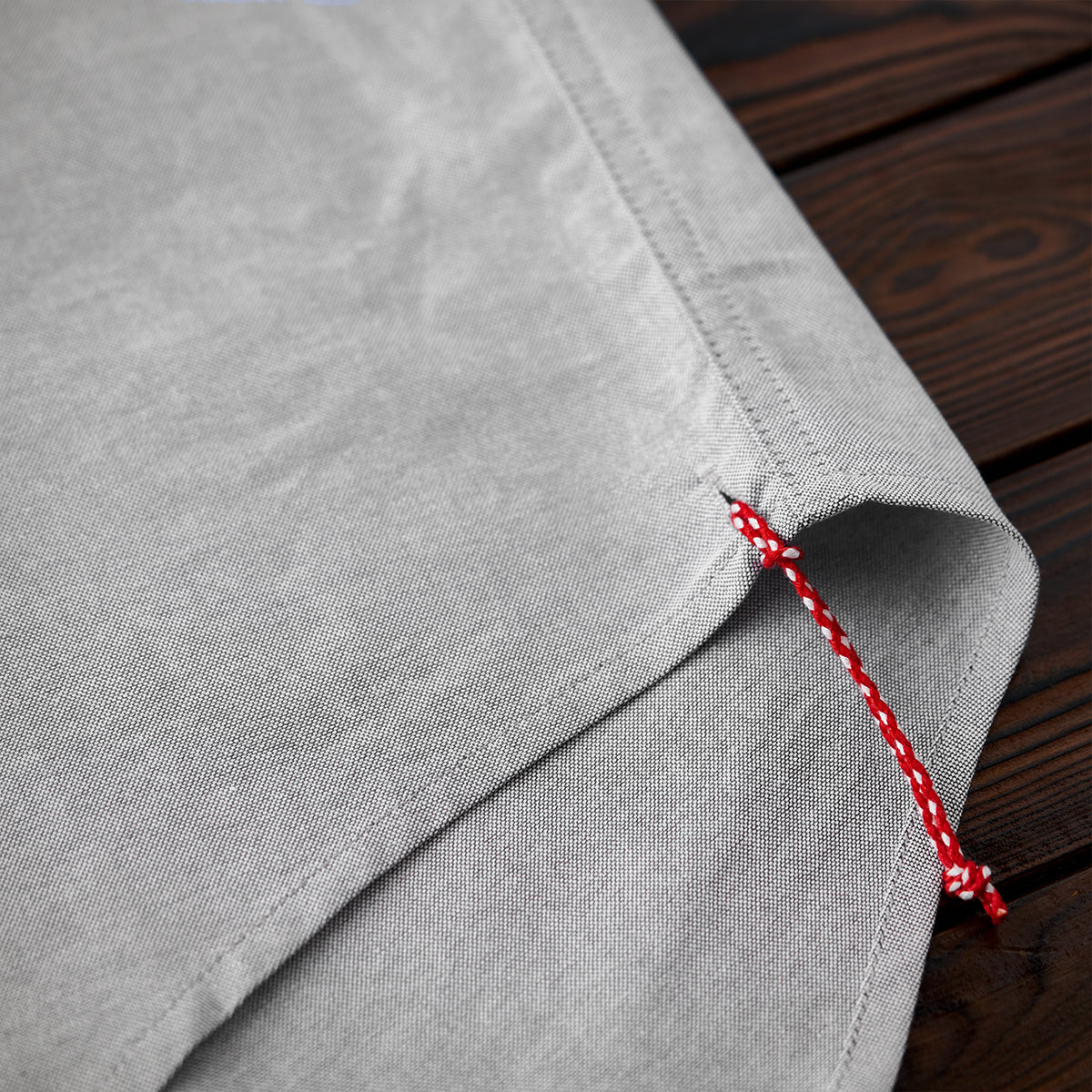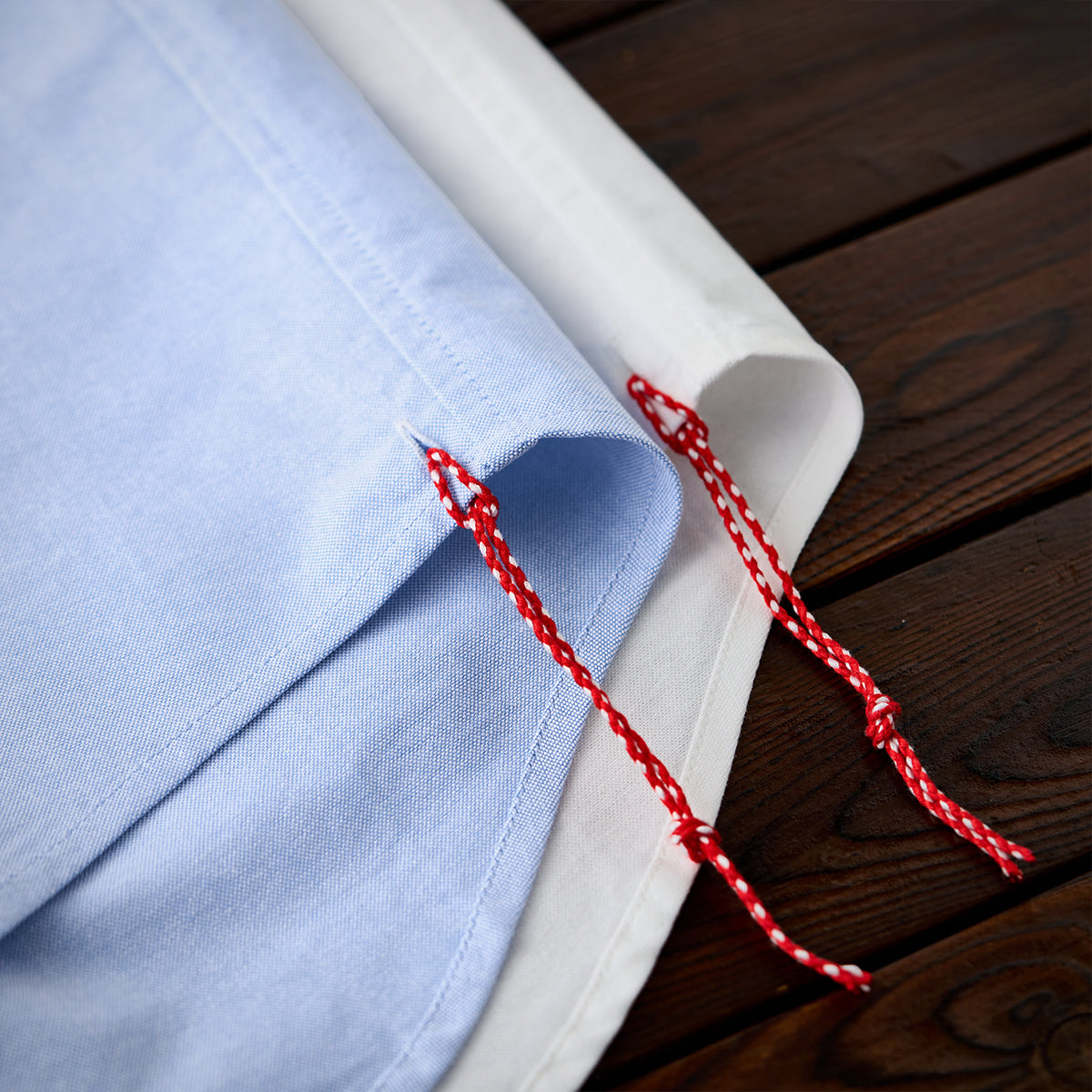 KARAKU PLUSのラインナップを見ていると、ふと目につく“ある共通点”があります。それは、裾にさりげなく施された「赤いヒモ」。