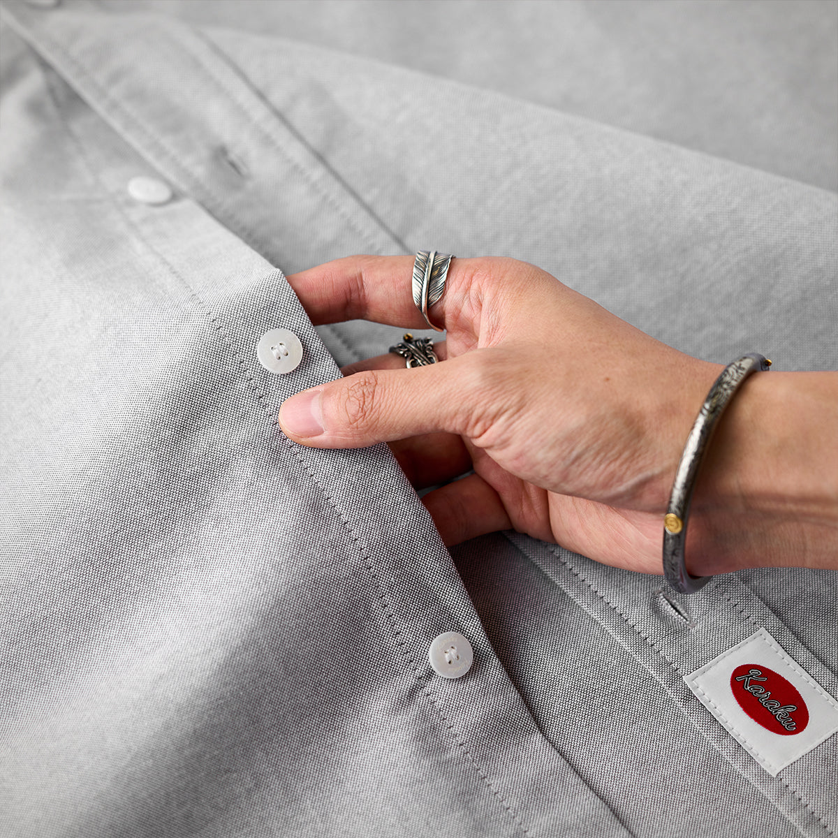 一見すると控えめなディテールながら、よく見ると複数のシャツに使われていて、スタイリングにも独特の存在感を添えています。