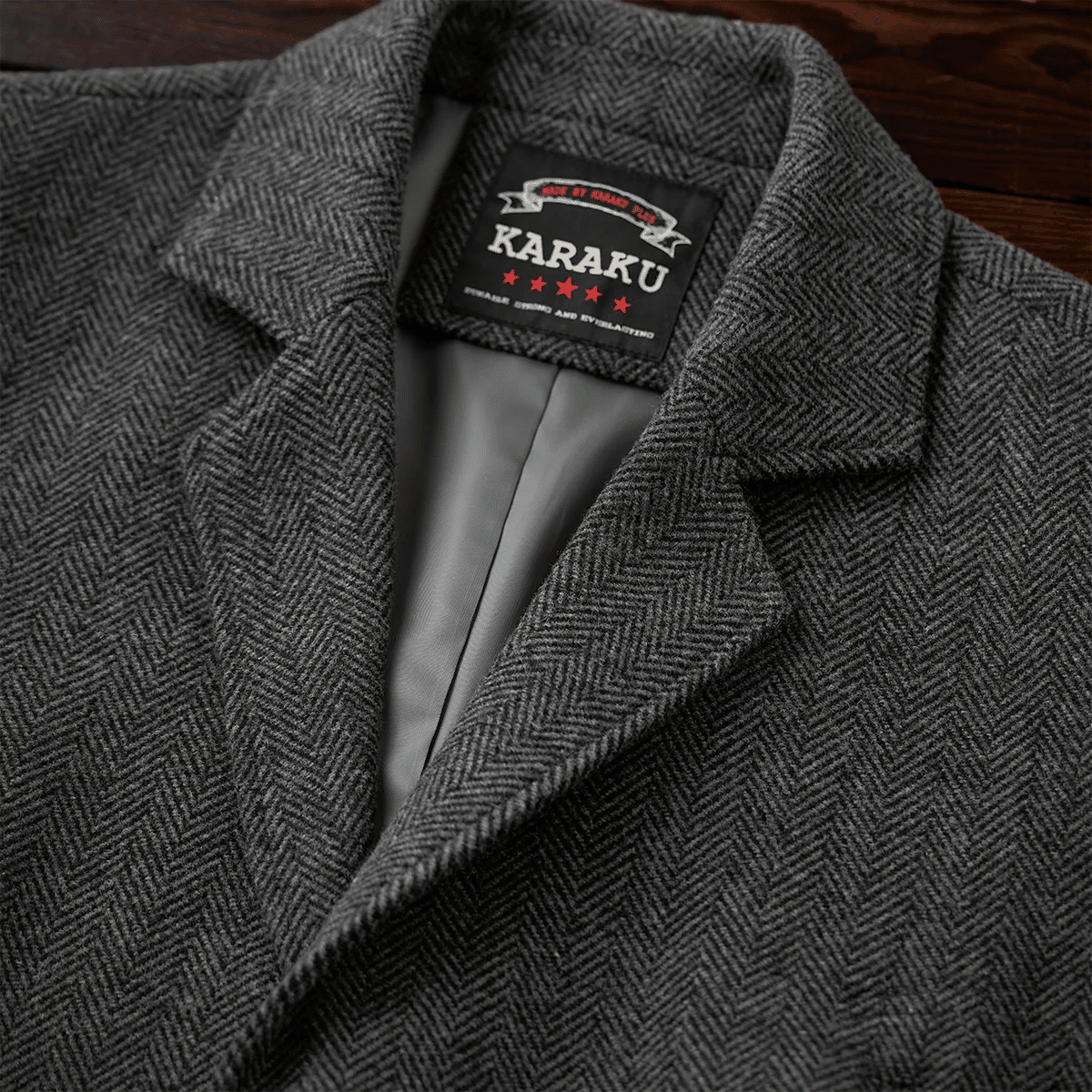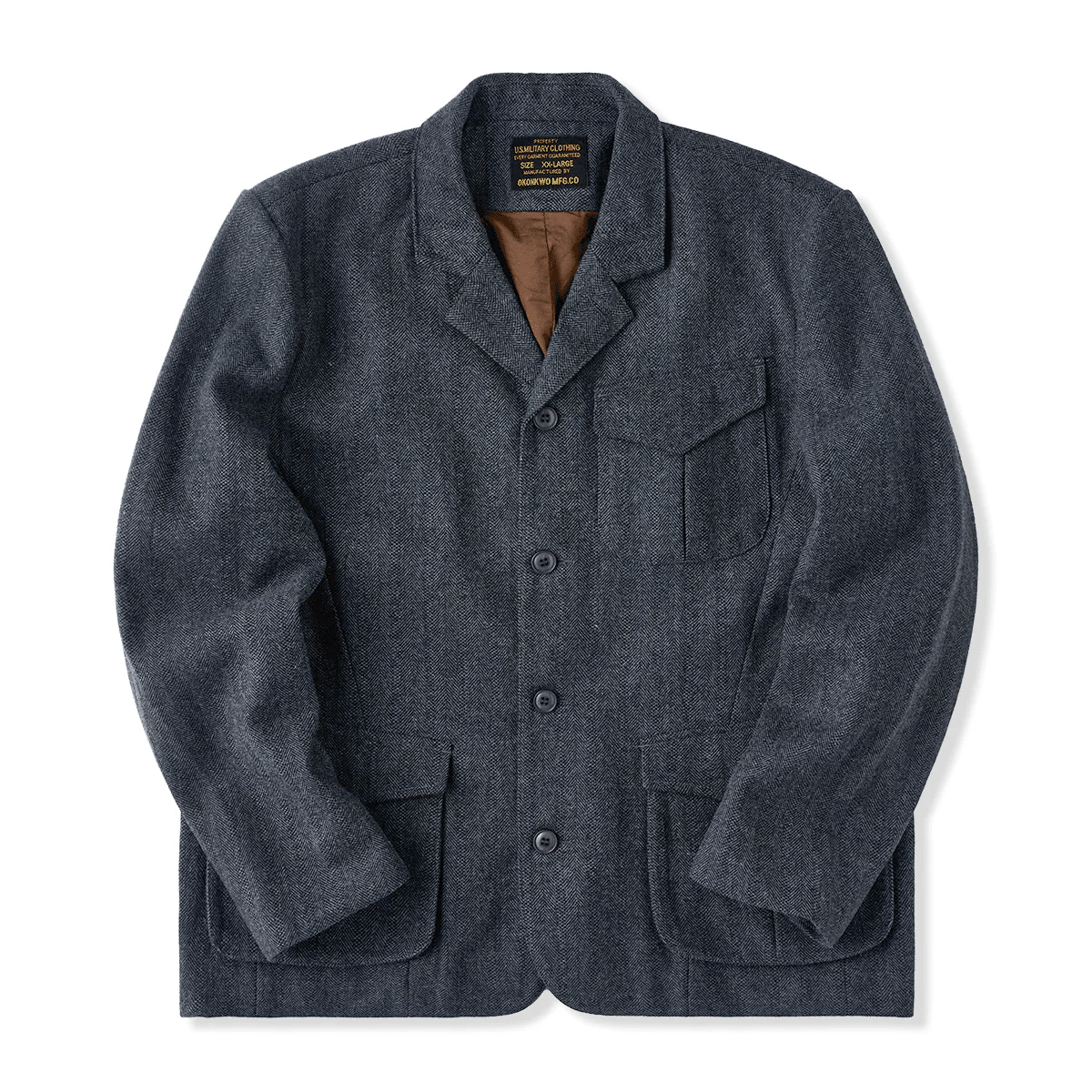 上質なウール混紡素材を用い、クラシカルなヘリンボーン織りで仕立てたテーラードジャケット。
