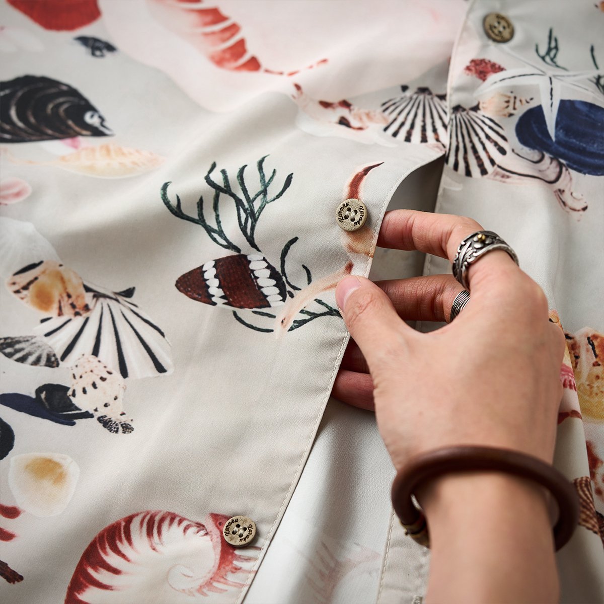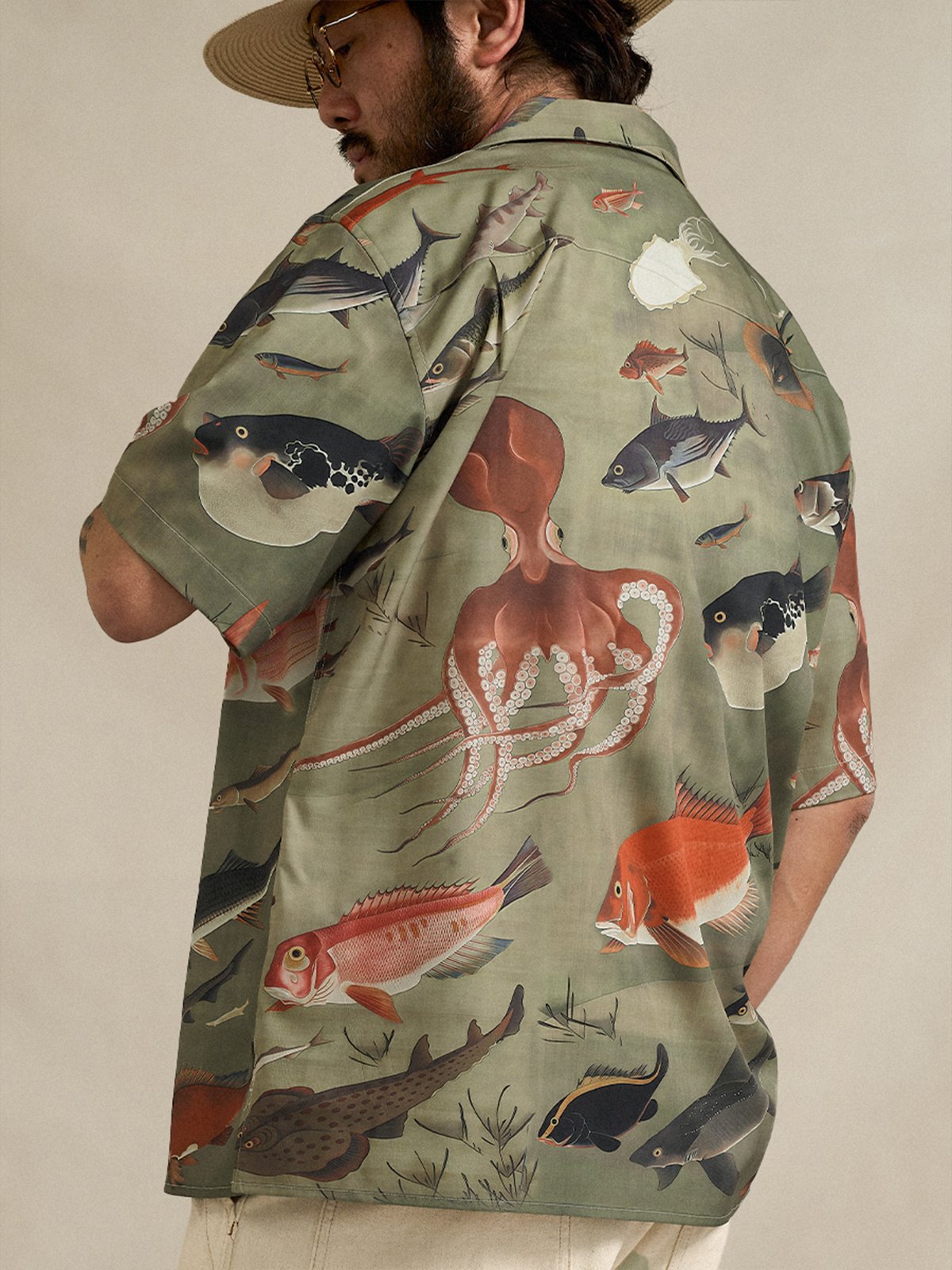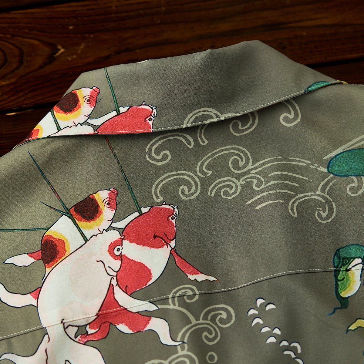 伊藤若冲が描いた「群魚図」の世界を、軽やかなアロハシャツに落とし込んだ一着。