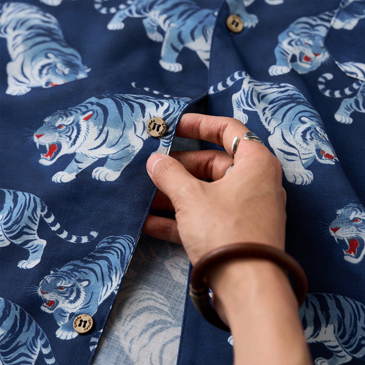 オープンカラー×ウッド調ボタンでリラックス感も。