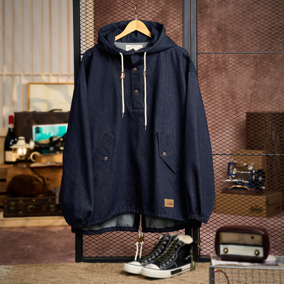 デニム素材で作られたパーカーは、