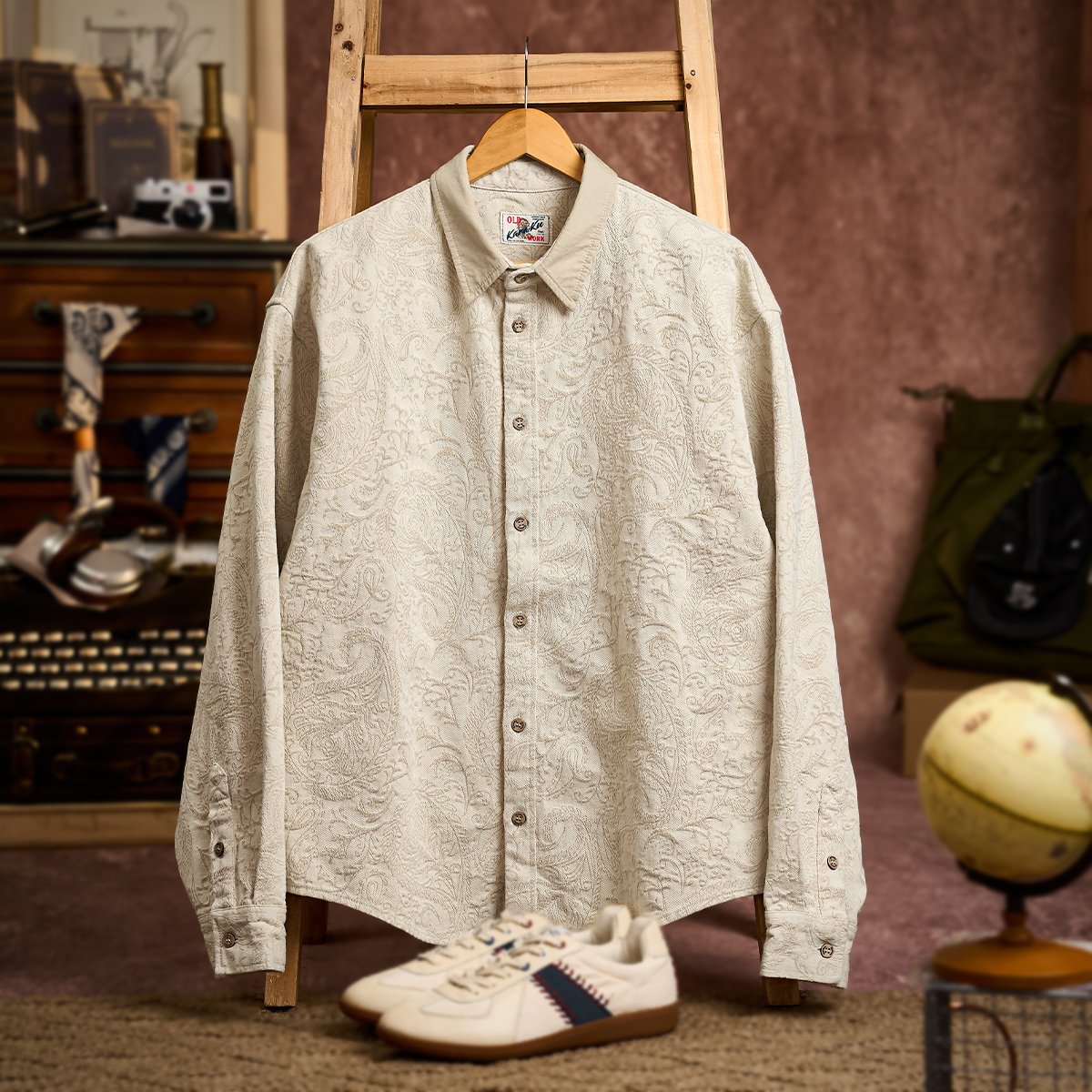 商品名称:襟配色 ジャガードペイズリー総柄コットンデニムシャツ