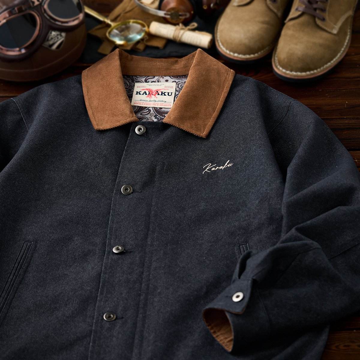 襟・袖裏コーデュロイ 「KaraKu」刺繡入り裏ペイズリー総柄デニムジャケット