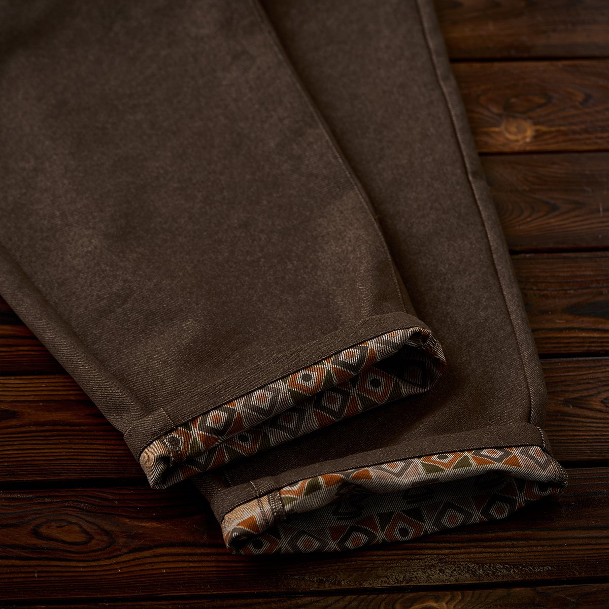 裏地のエスニック柄がデザインのポイントで、裾を折り返すと幾何学模様のオレンジやグリーンが視線を引き、春秋の季節感をプラスします。