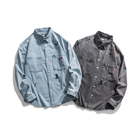 (クロネコ・フラワー)刺繍入り デニムワークシャツ