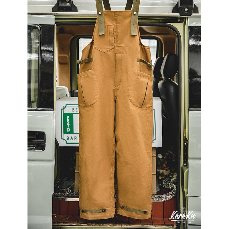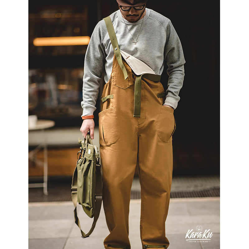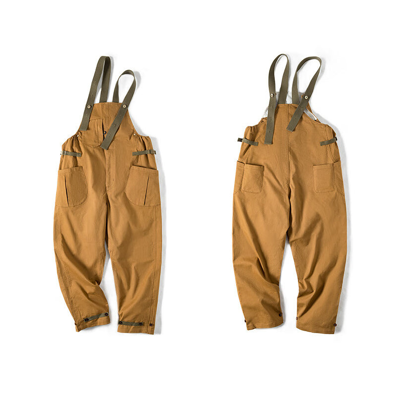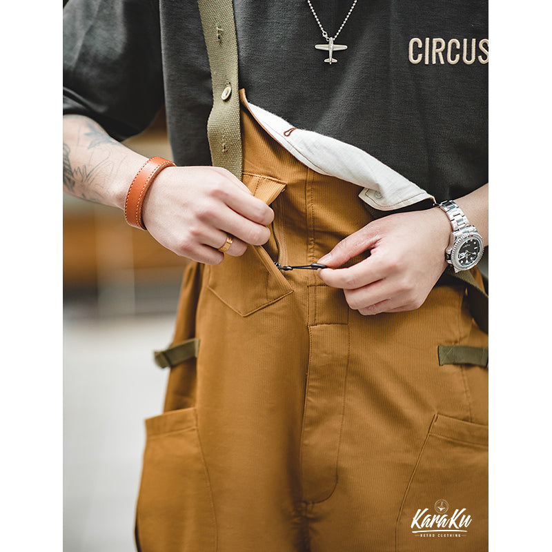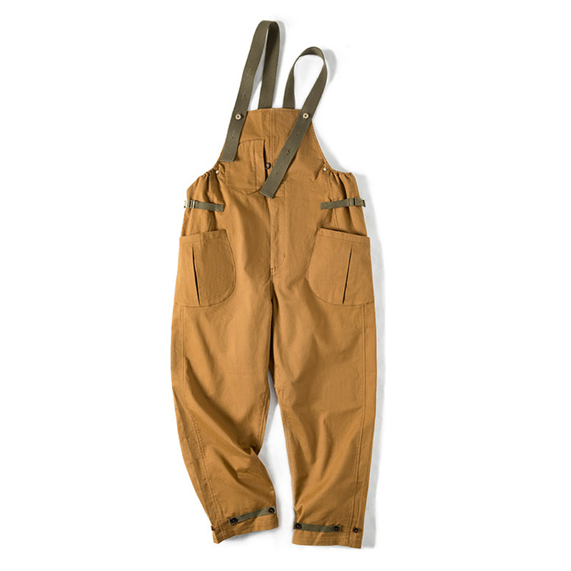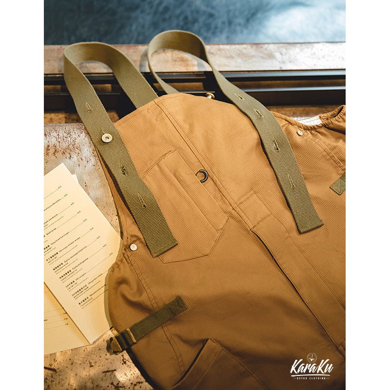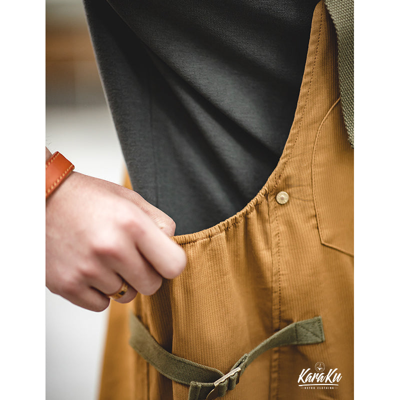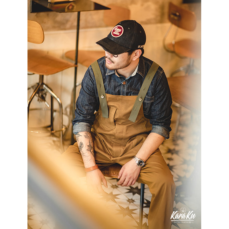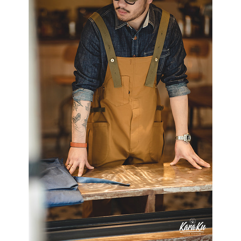 ・調節可能なショルダーストラップを胸の位置でオーダーメイドボタン留め、両腰でメタルバックルベルトを留め 、フロントにDポケット1つとジャバラポケットを2つ、背面にパッチポケット2つ を配置して機能性が満載。