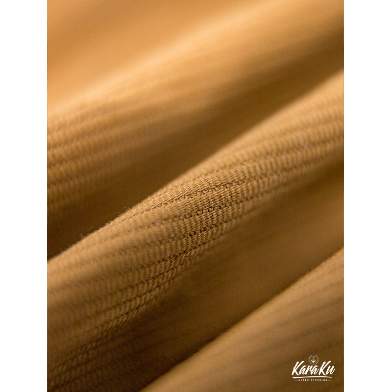 本アイテムはくっきりとした畝の細コーデュロイ素材を使用し、畝は極細ですが、起毛感もしっかりしていてベロアのようなきめ細かい密度の高い素材感。コーデュロイ素材の魅力は、パイル繊維の間に空気層が出来るため、保温吸湿効果に優れている。また縦糸にスパンデックスを用いる事により、程よい伸縮性を実現。シワになりにくいメリットがあり、経年変化による味わいもお楽しみ頂けるのもポイント。
