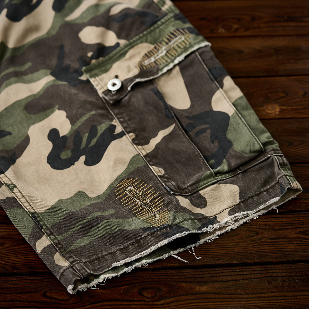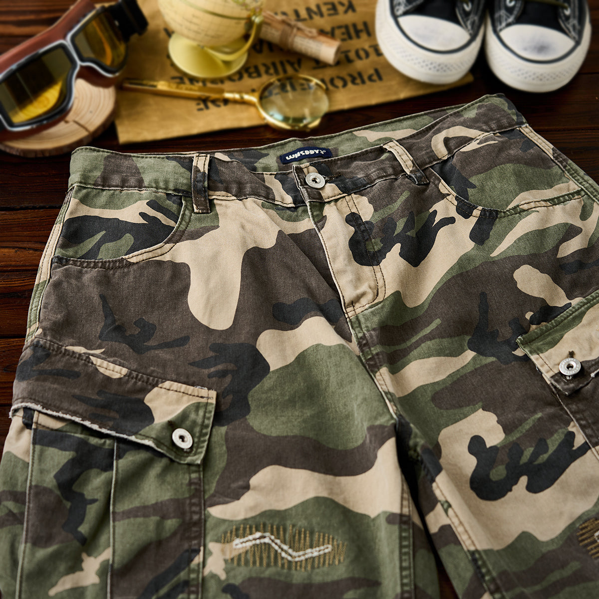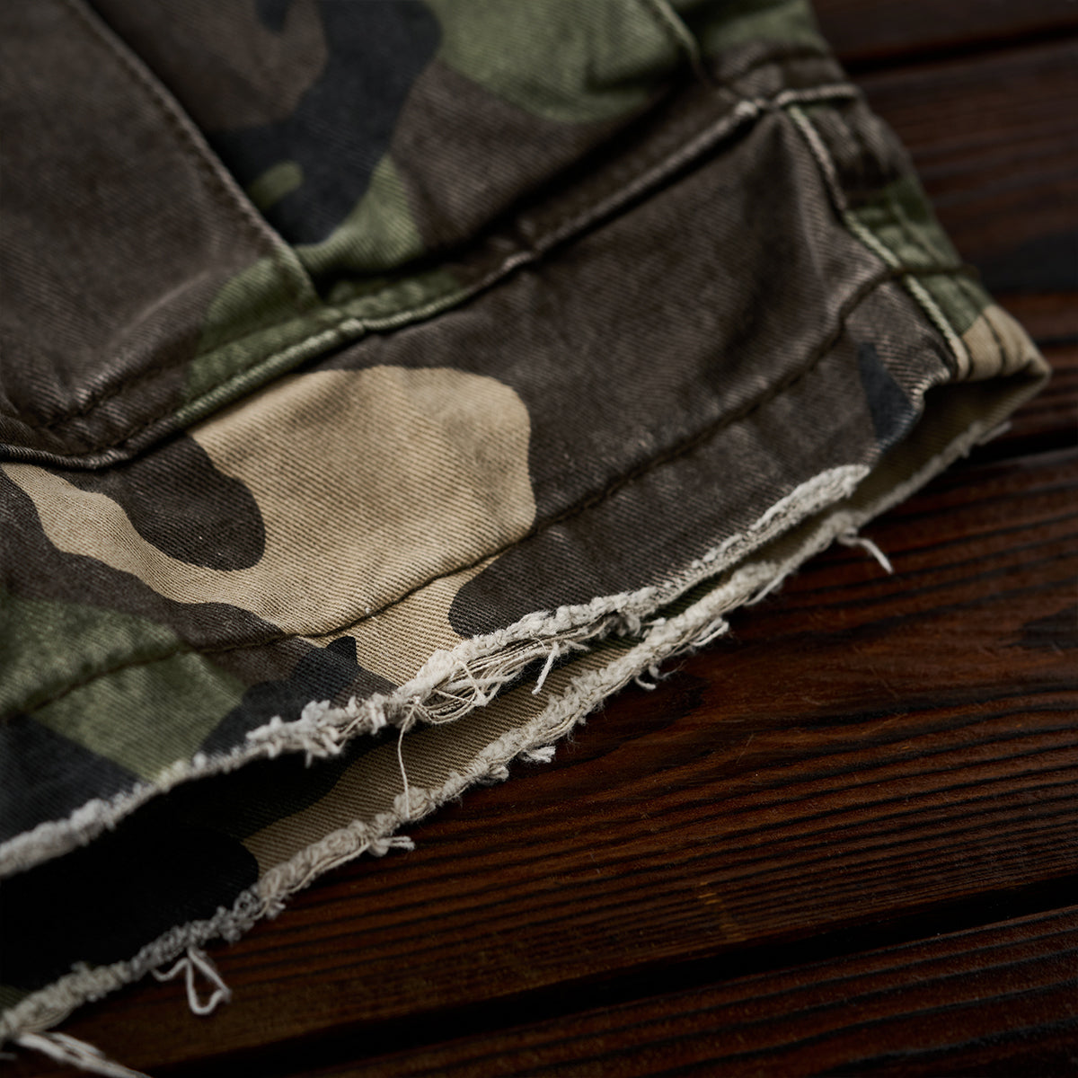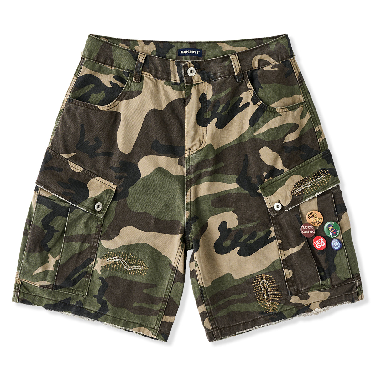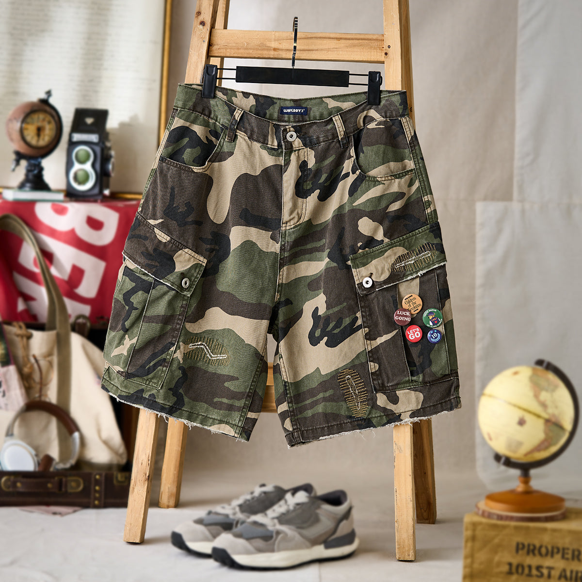 レトロバッジ付き 迷彩柄ショートカーゴパンツ