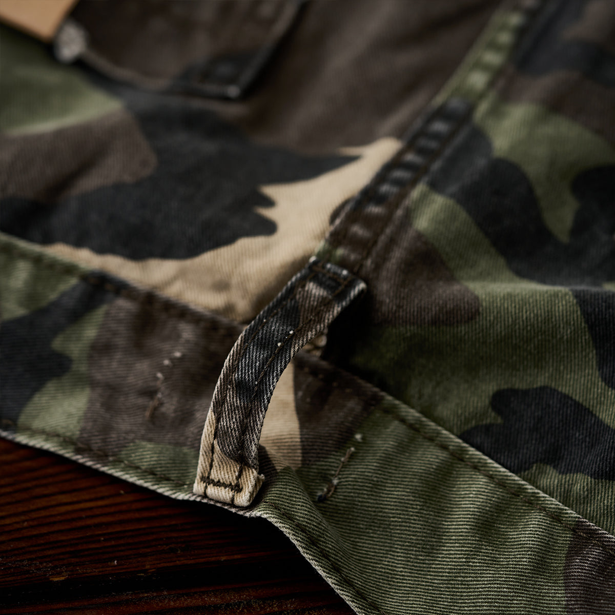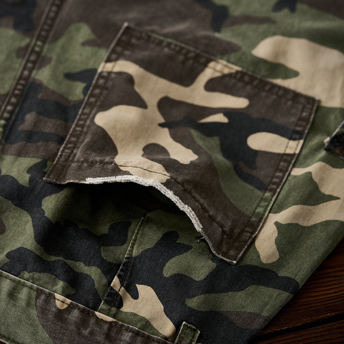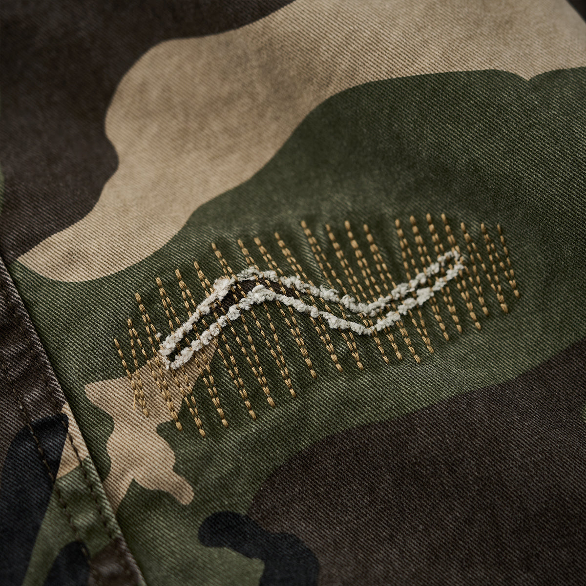 武骨な印象の迷彩柄に、どこか懐かしい“レトロバッジ”をあしらった、夏の主役ショートパンツ。程よく洗いをかけたコットン素材は、やわらかな風合いと通気性に優れ、汗ばむ季節も快適に着用できます。両サイドには容量たっぷりのカーゴポケットを配置し、アウトドアやフェス、ストリートにも頼れる実用性を確保。裾まわりはややワイドなリラックスフィットで、ブーツにもサンダルにも好相性。無地TからグラフィックTまで、どんなトップスとも好バランスな一本です。