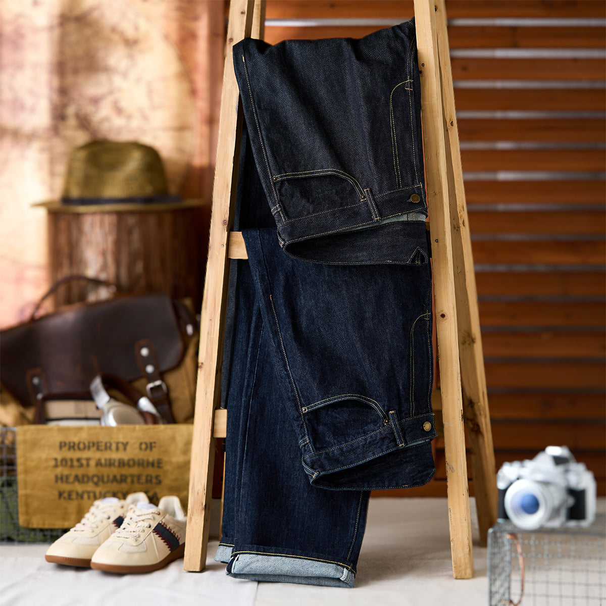 14.75ozのヘビーオンスデニムを使用した、クラシックな表情の一本。バックウエストには、かつてベルトの普及していなかった時代に腰回りをフィットさせるために考案されたシンチバックを装備。ワークウェアらしい機能性を備えると同時に、後ろ姿に独特の存在感を与えています。生地は、穿き込みながら色落ちを自分で育てていける「生デニム」と、自然な風合いを楽しめる「ワンウォッシュデニム」の2タイプ。時を重ねるほどに味わいを深め、ワーク由来のディテールとともに、自分だけの一本へと育っていきます。