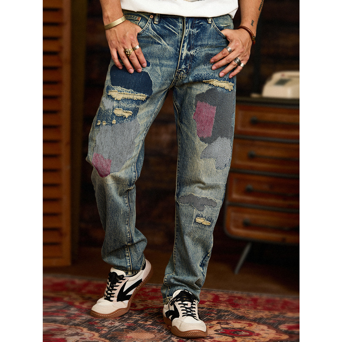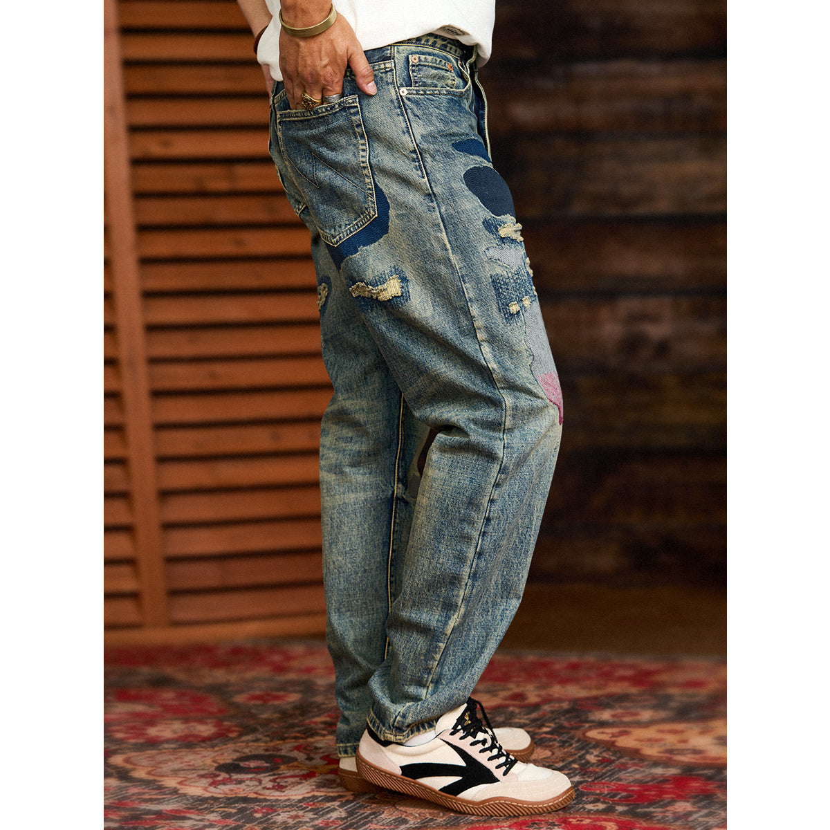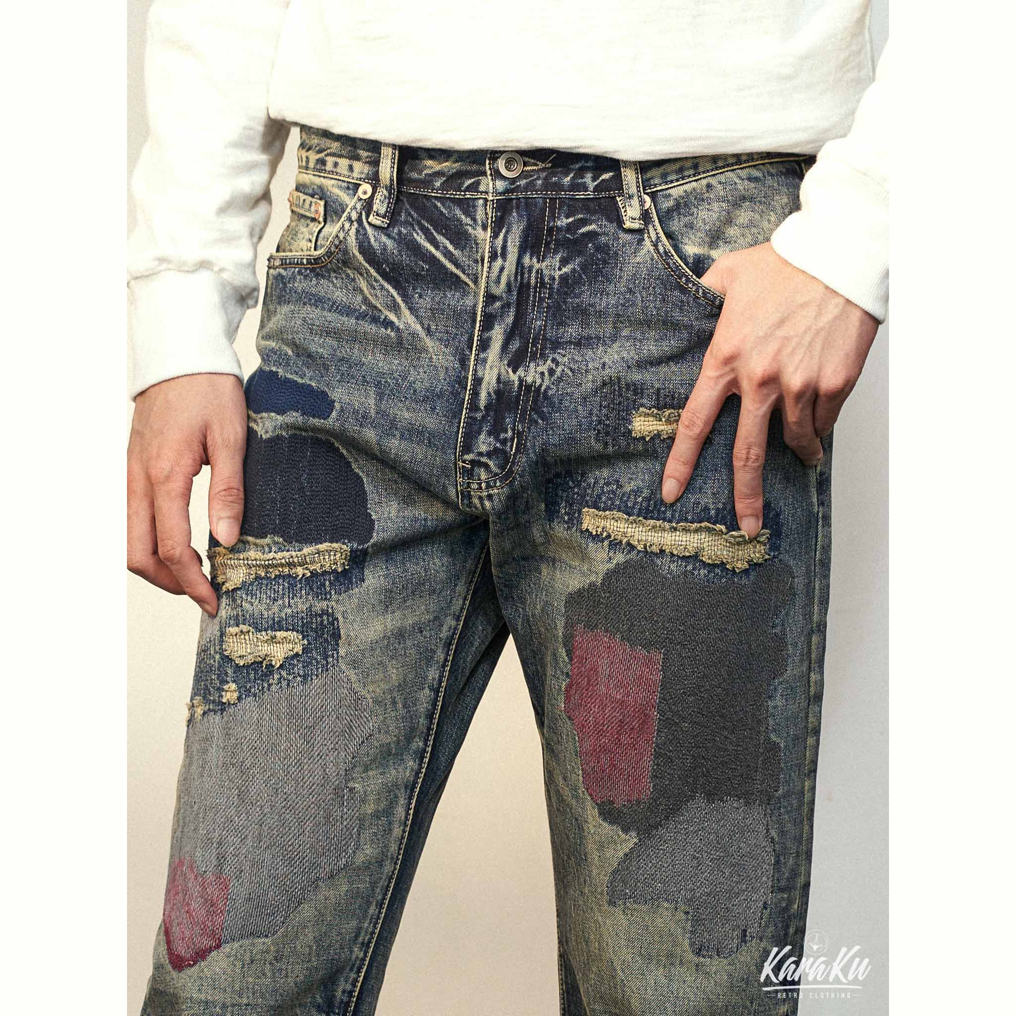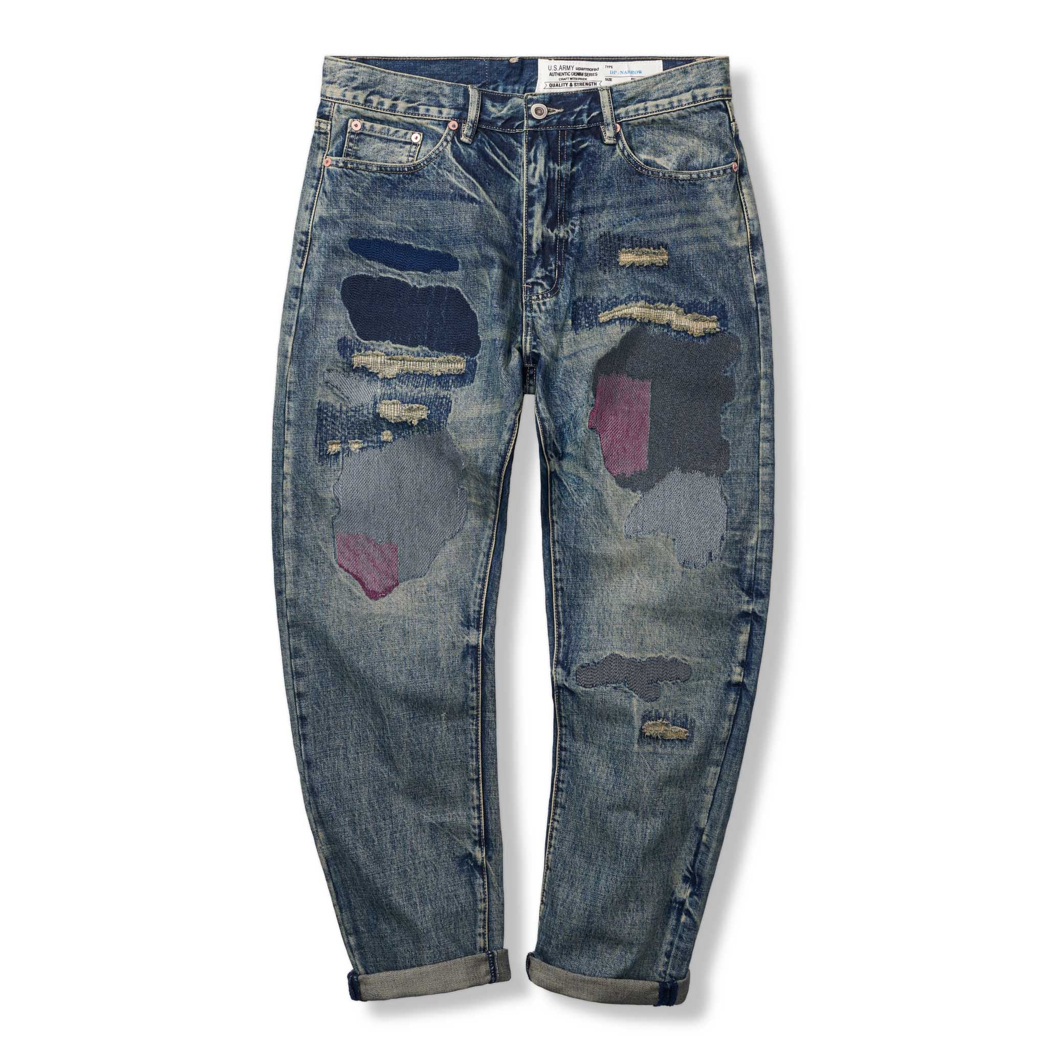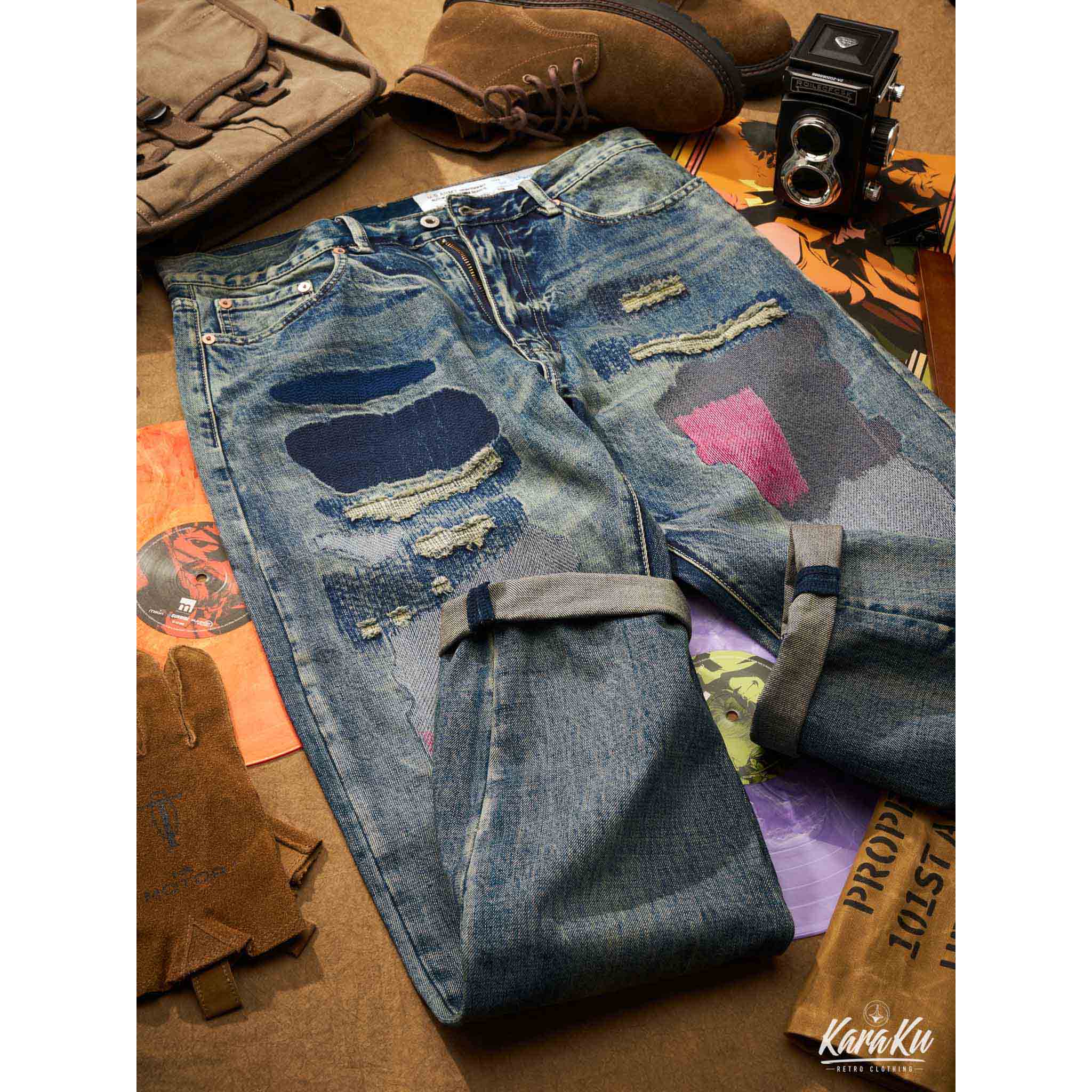 ヴィンテージ加工する事により、見た目の違う生地でパッチワークをし、アメカジ古着テイストを盛り込んだデニムパンツ。