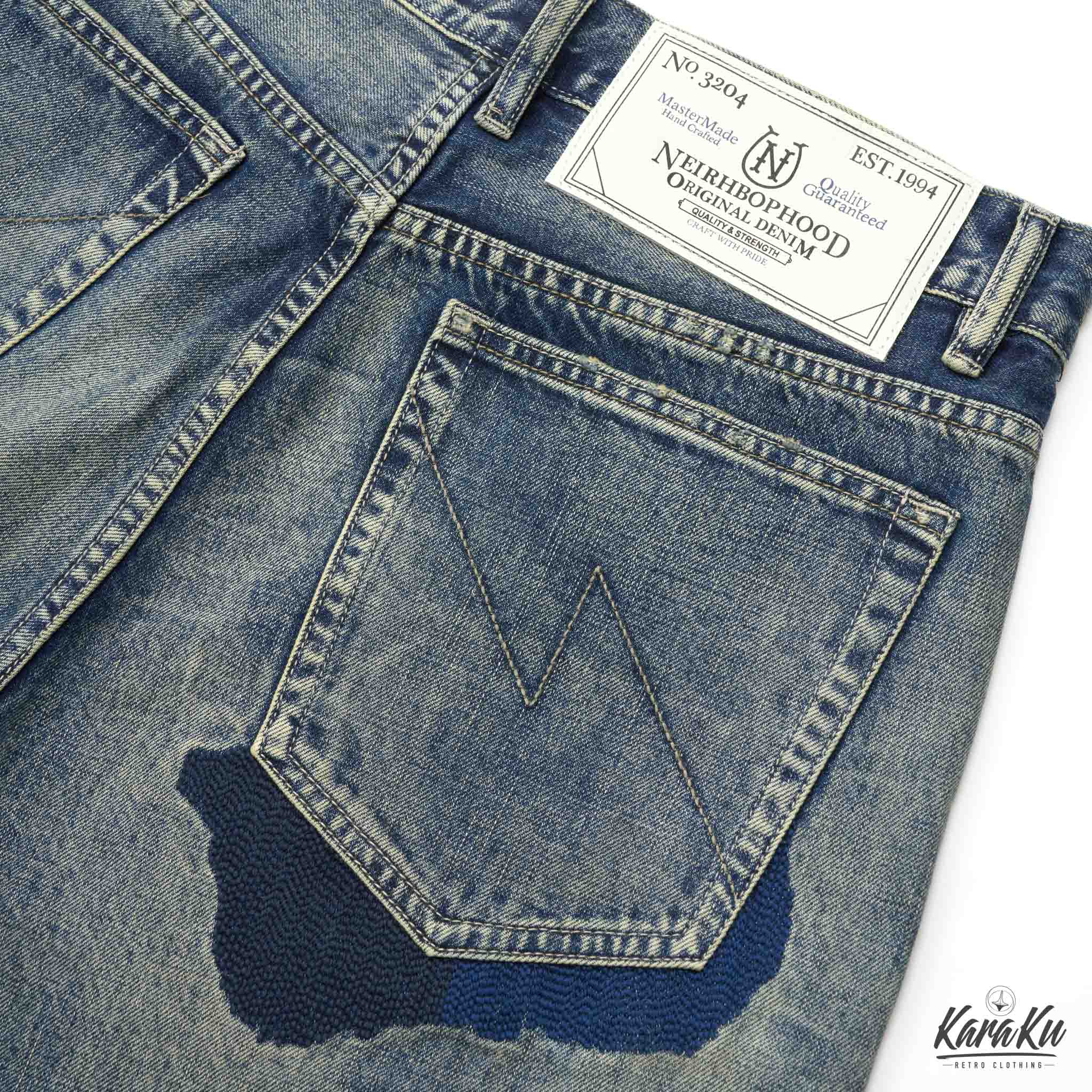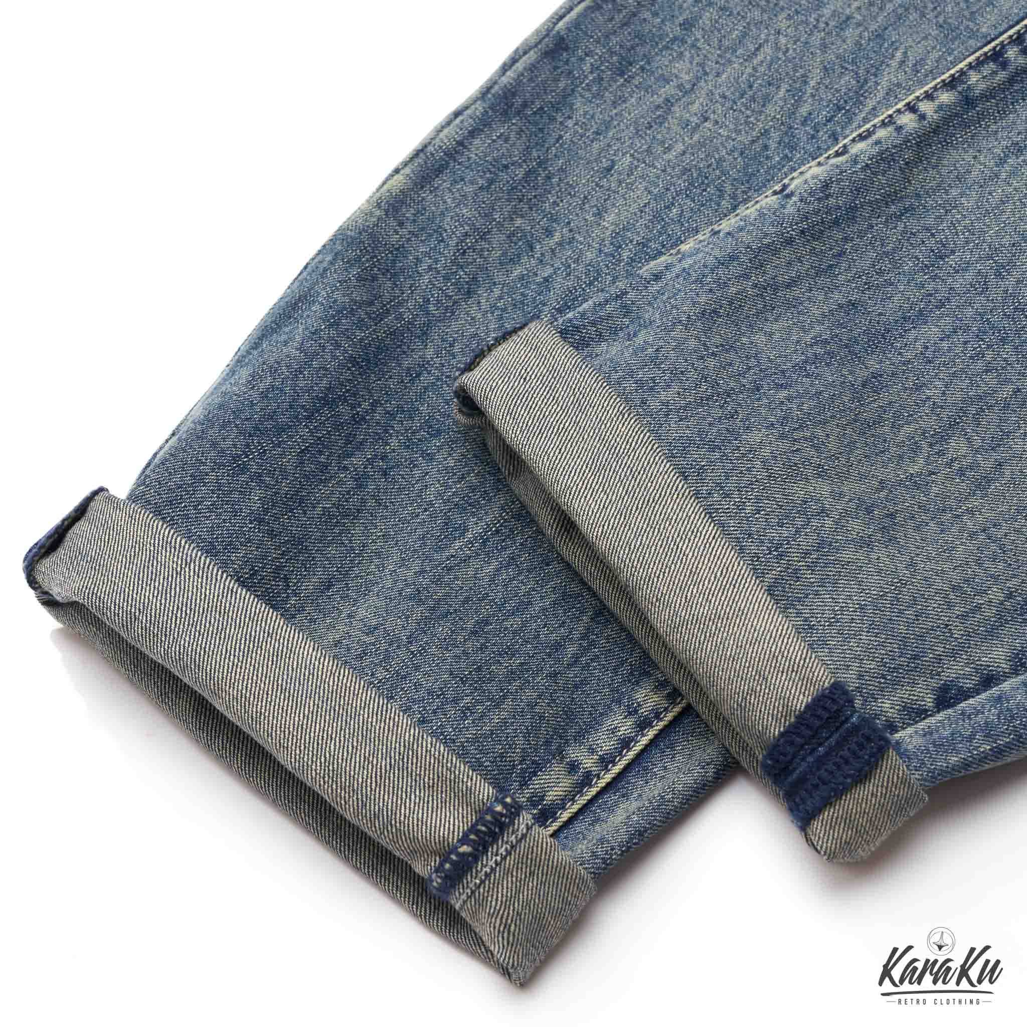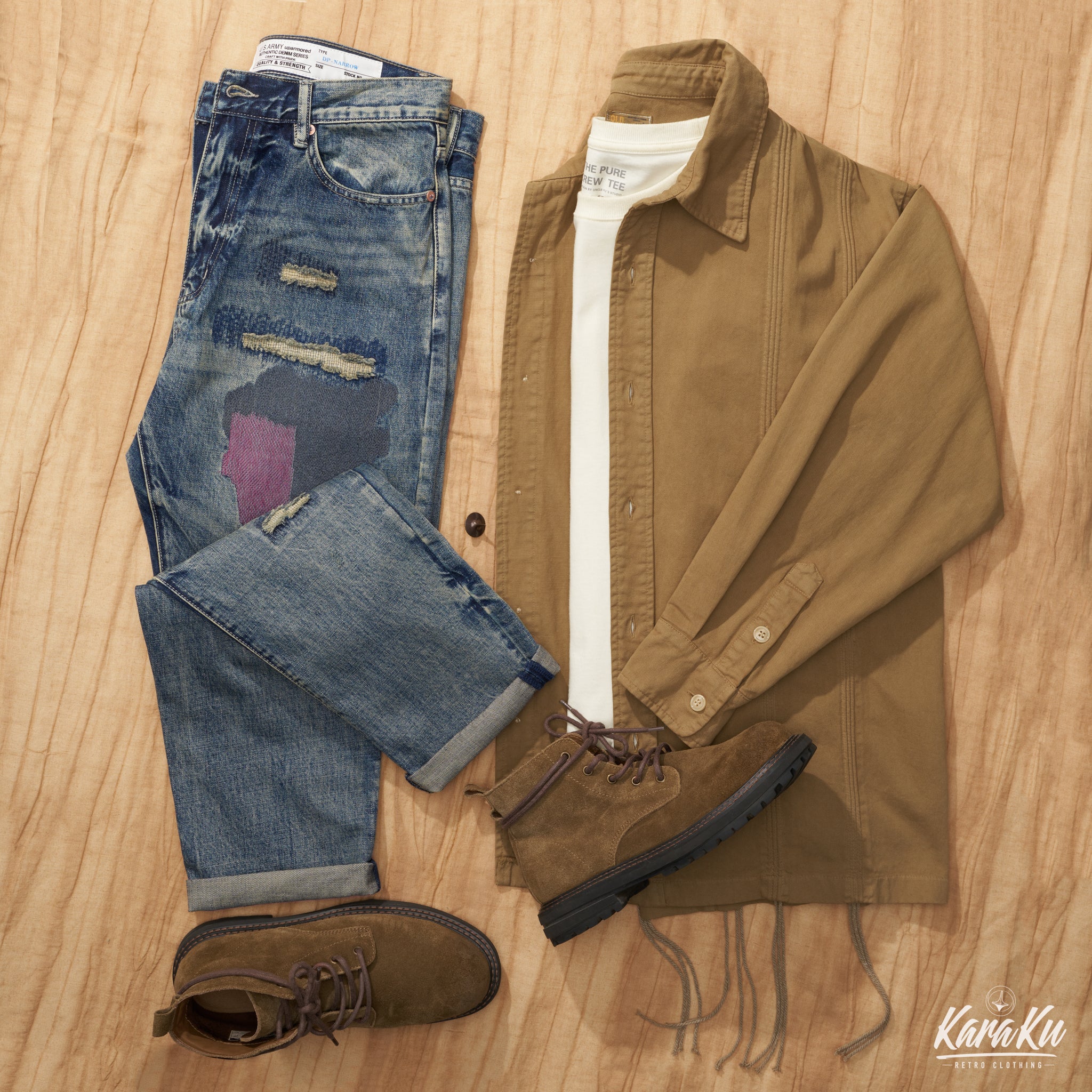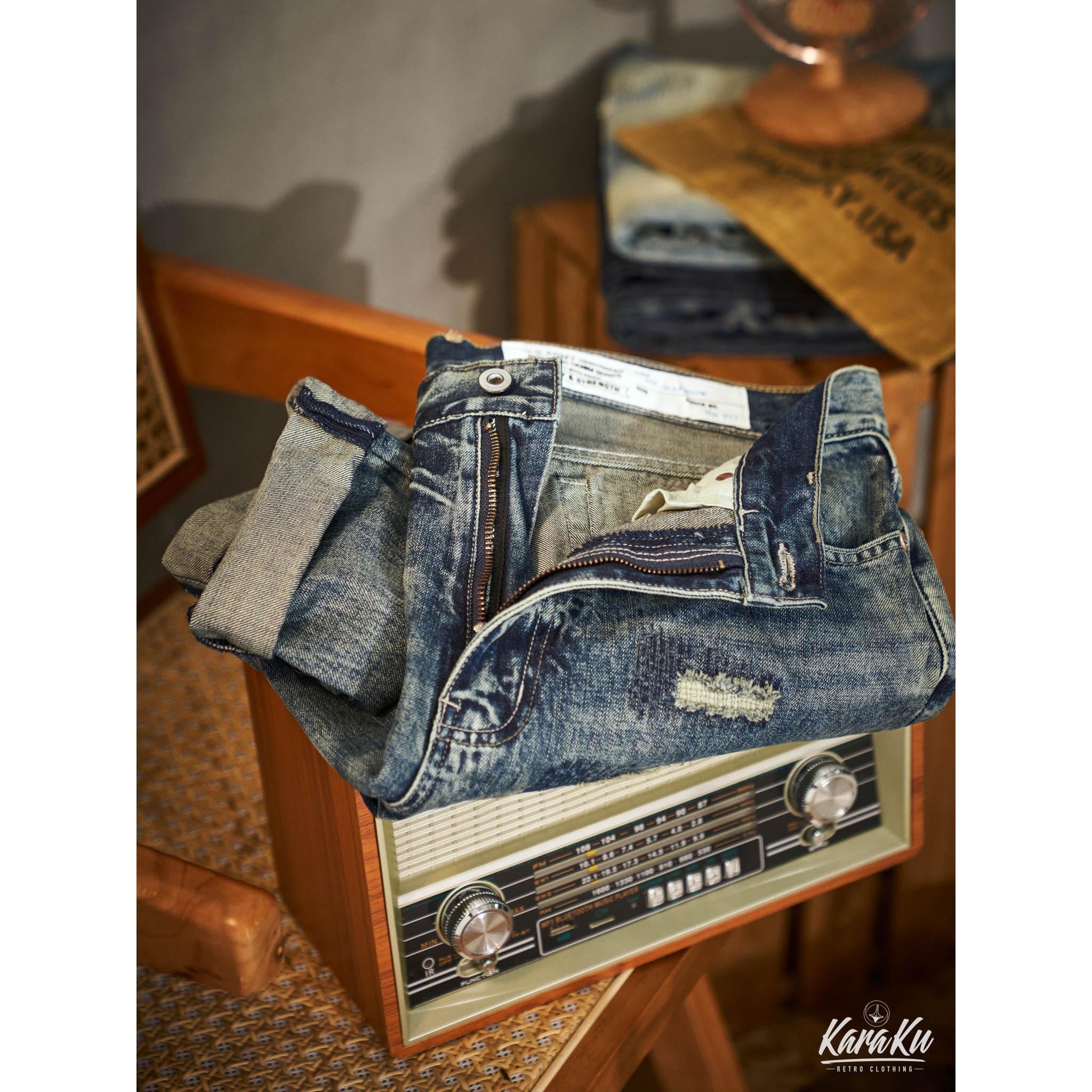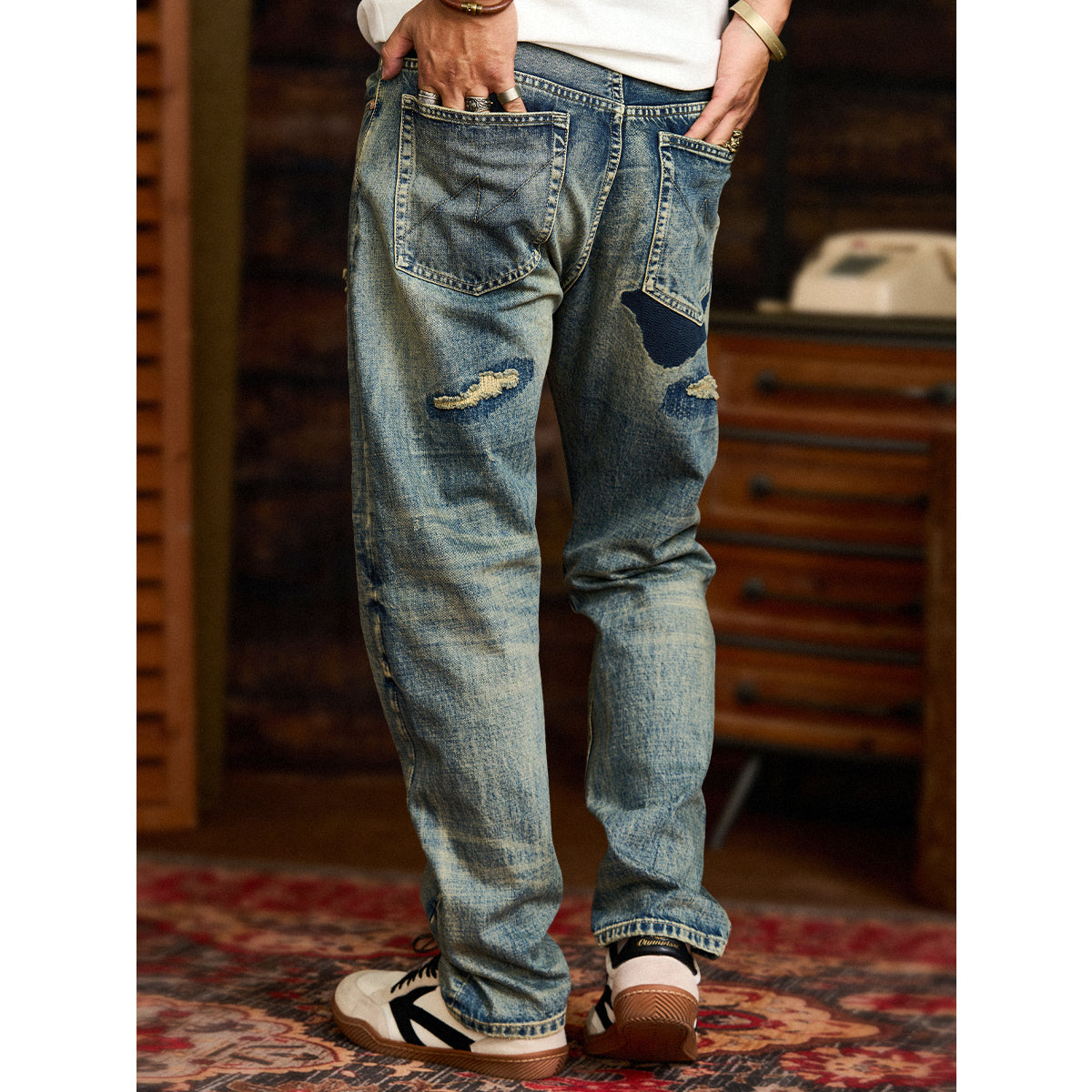 ヴィンテージ加工する事により、見た目の違う生地でパッチワークをし、アメカジ古着テイストを盛り込んだデニムパンツ。