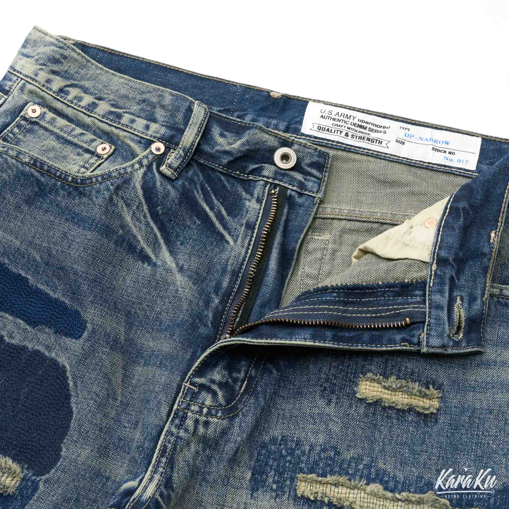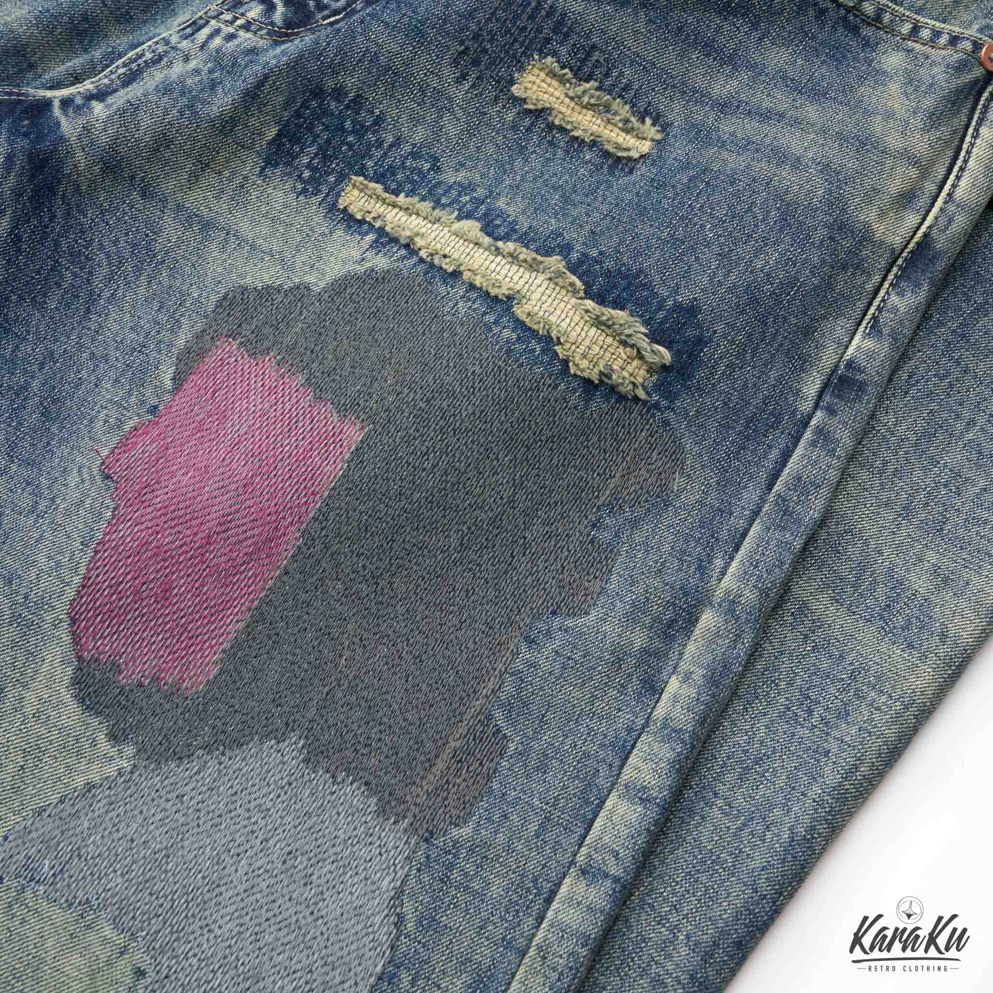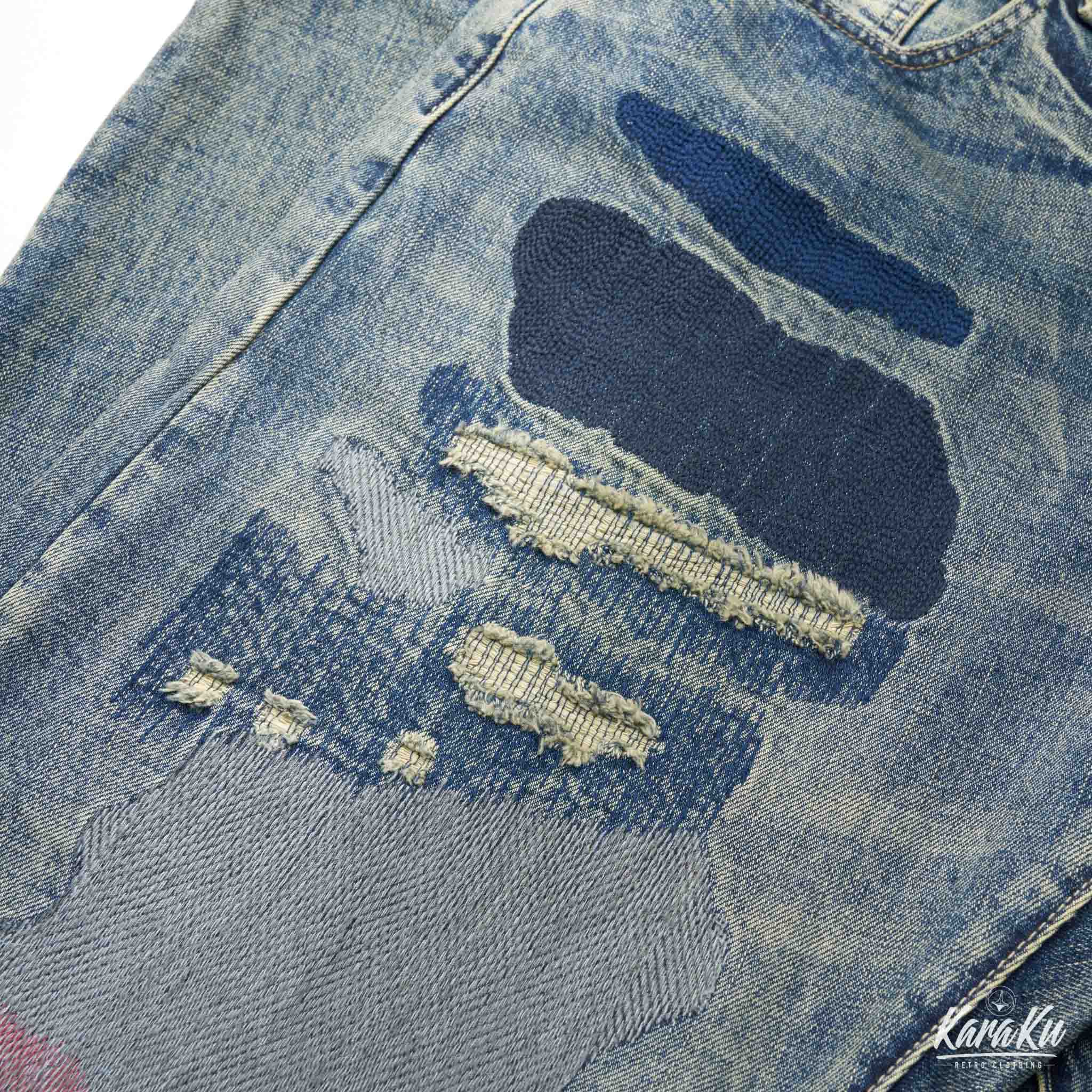 生地の上に重ねて縫いつけるやベースとなるデニムをカットオフしてそこに新たな生地を足す、更には生地にダメージを作り、生地をあてて白のステッチでたたきつけるなど複雑にパッチワーク。