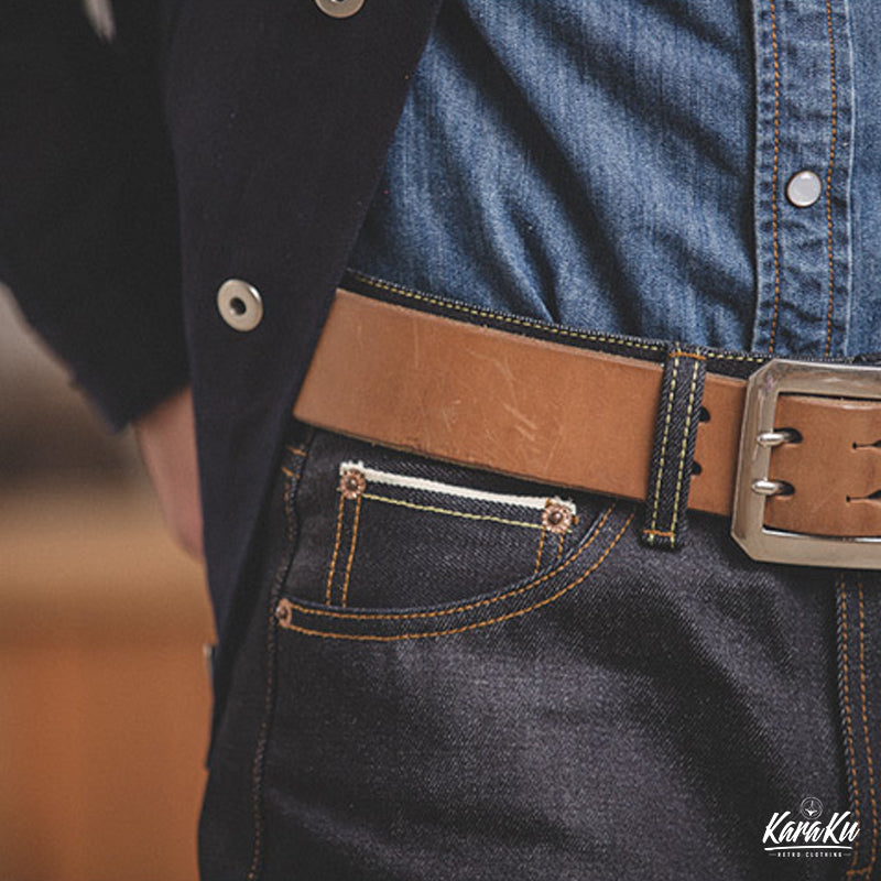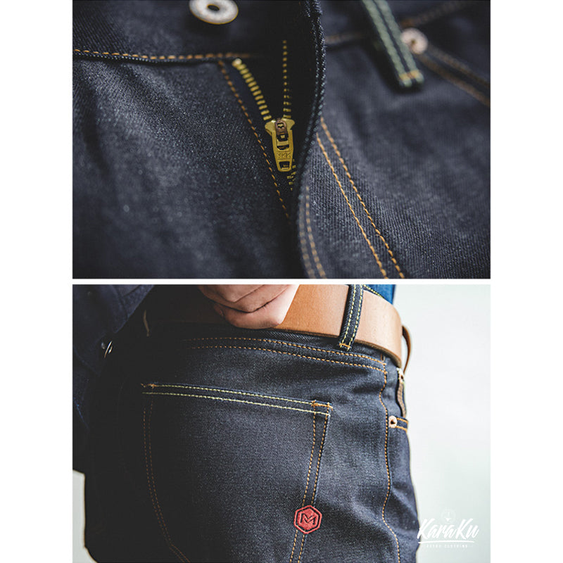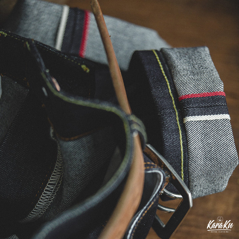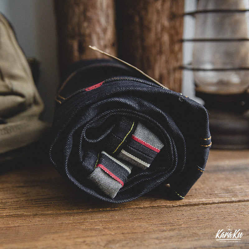 14.5ozのローデニムは、染色後一度も洗っていない、ネップ感のある生地感は穿きこむほどに変化が楽しめ。赤耳を付けることによりねじれにくくなり、縫い目の強度が増す。