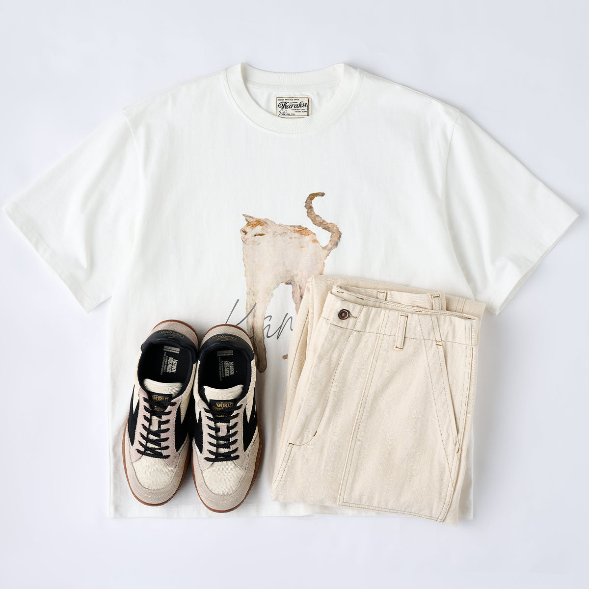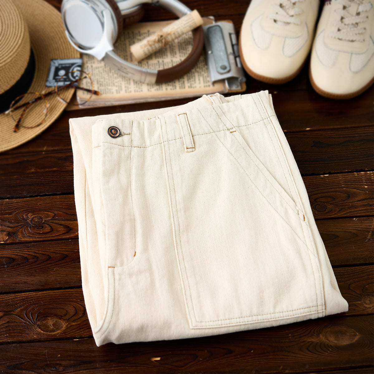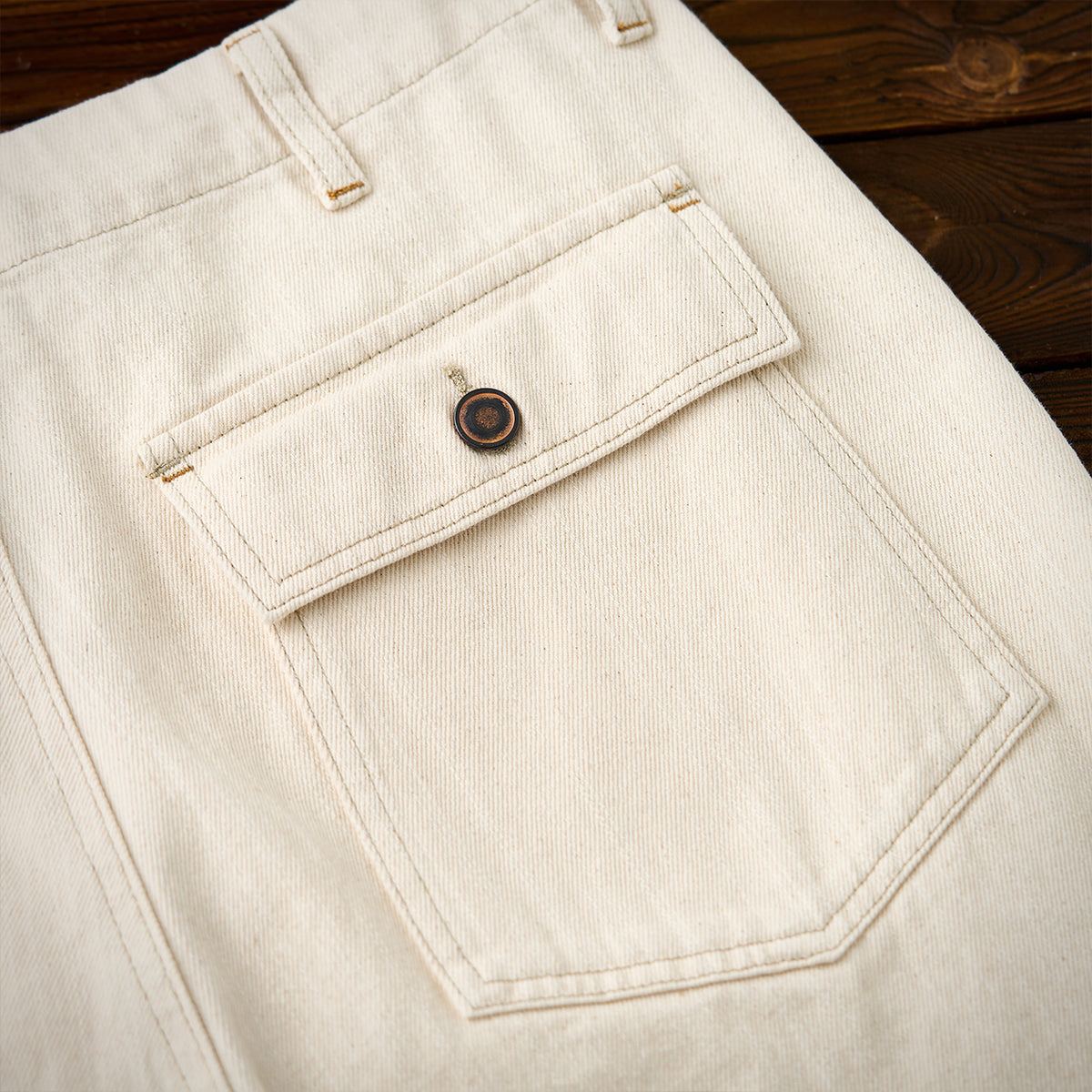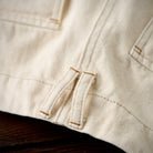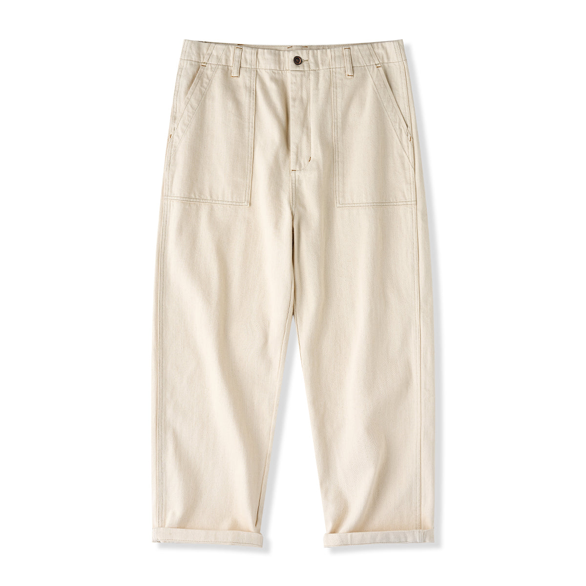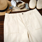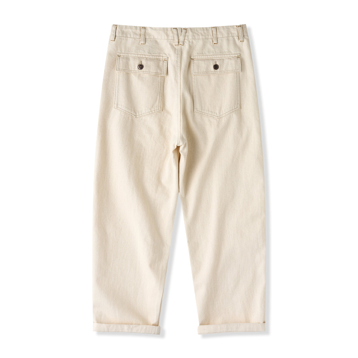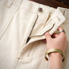 本アイテムはウォッシュト加工で仕上げられに加え、肌触りが良くシワになりにくい重量感がある。生地には肌触りが良く、ガッシリとした肉感のあるナチュラル綿帆素材を使用、コットンの殻や綿実が残っている一番オリジナルの状態で表現して、ムラ感のある独特な色合いと相まって、真っ白ではなくオフホワイトを使用し、絶妙なビンテージ感が溢れる。オーダーメイドしたジッパーとボタン付き、フロントにビッグポケット2つ、背面にパッチポケット2つを配置し、機能性が満載。ゆったりシルエット、ややテーパードするストレートに仕上げた。