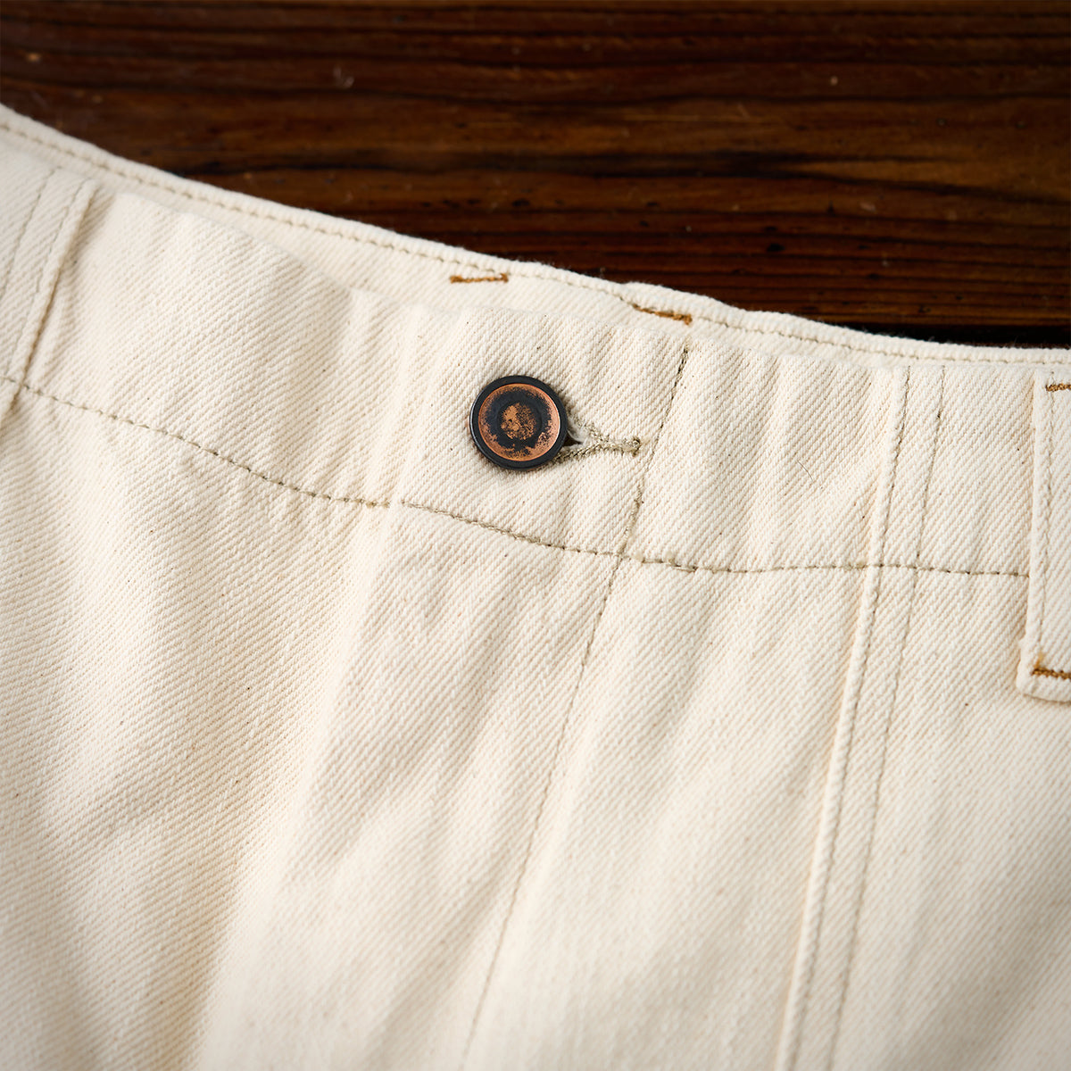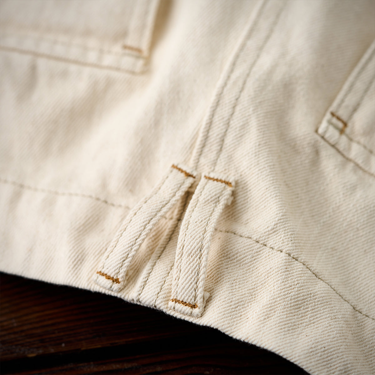 縦糸、横糸とも通常より太いムラのある糸を甘めに縒り旧型の力織機、シャトル織機で織ったセルビ ッチデニムは独特の凹凸感のある11.2ozナチュラル綿帆デニム。