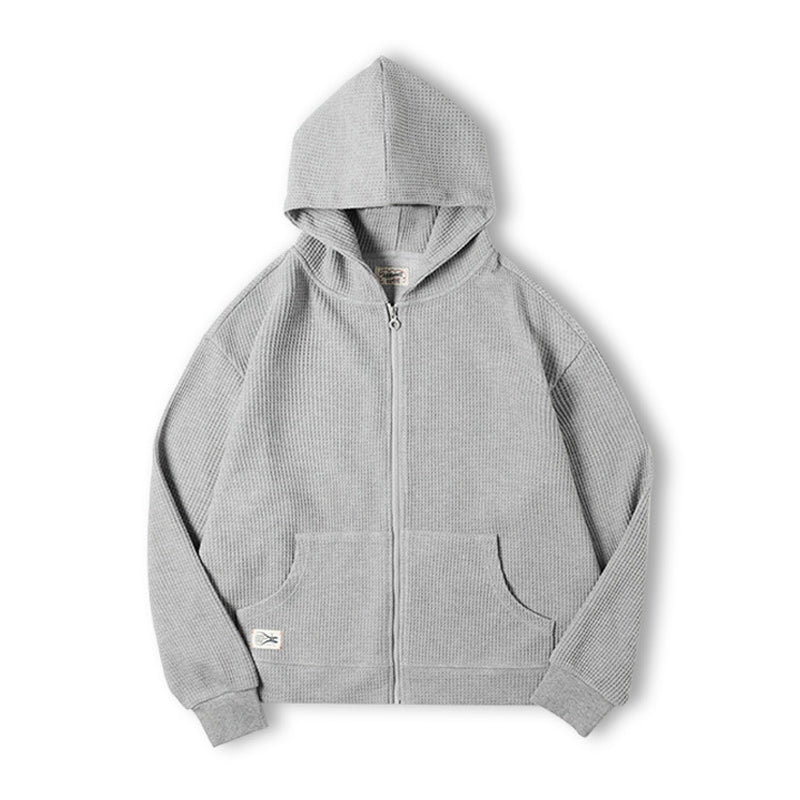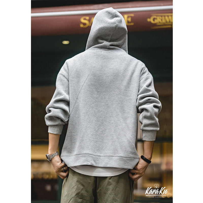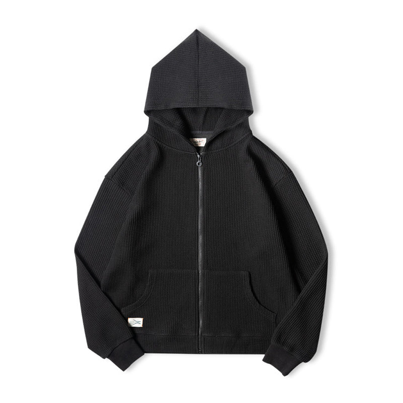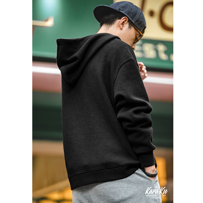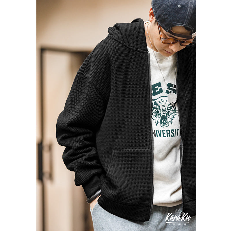 袖口や裾周りなどが切り替えリブとなっており細部までこだわりを感じる作りとなっている。フロントに大容量のカンガルーポケットを付き、実用性が欠かせなく、形も若さを出している。