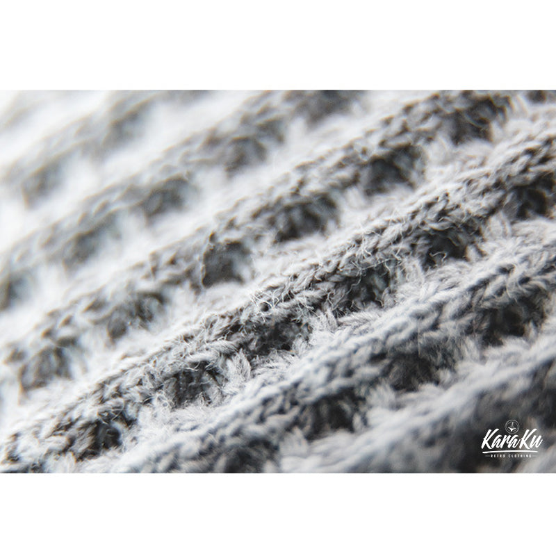 ワッフル編みはカジュアル要素が強いので、細身のスラックスなどと合わせてバラン スを取ったコーディネートがオススメ。
