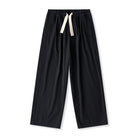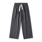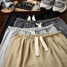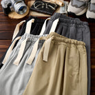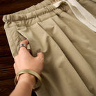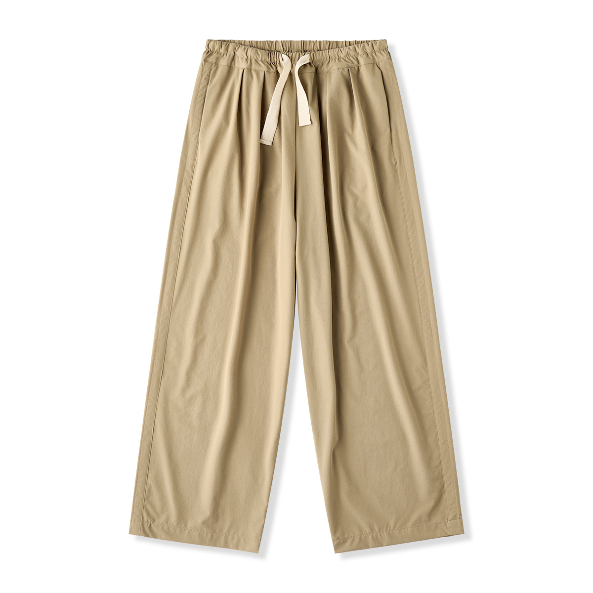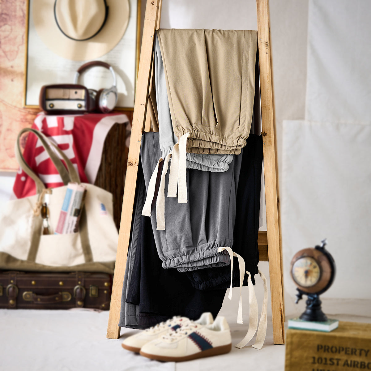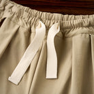 ウエストはゴム仕様で、紐が付いて、調整が可能。紐がアクセントとしてデザインされて、リラックス感とカジュアルさを演出しています。
