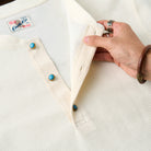 柔らかな肌触りと優れた通気性を兼ね備えたワッフル生地を使用し、快適な着心地を実現したヘンリーネックTシャツ。前たてには、ターコイズ風ストーンをあしらったメタルボタンを採用。ボタンの周囲はアンティークゴールドのフレームで囲まれ、さりげなくも存在感のあるアクセントに仕上げました。ベーシックながら細部にまでこだわったデザインで、一枚着としてもスタイリングが決まる一着。カジュアルやアメカジ、アウトドアスタイルとも好相性で、春夏はもちろん秋口のレイヤードにも活躍します。