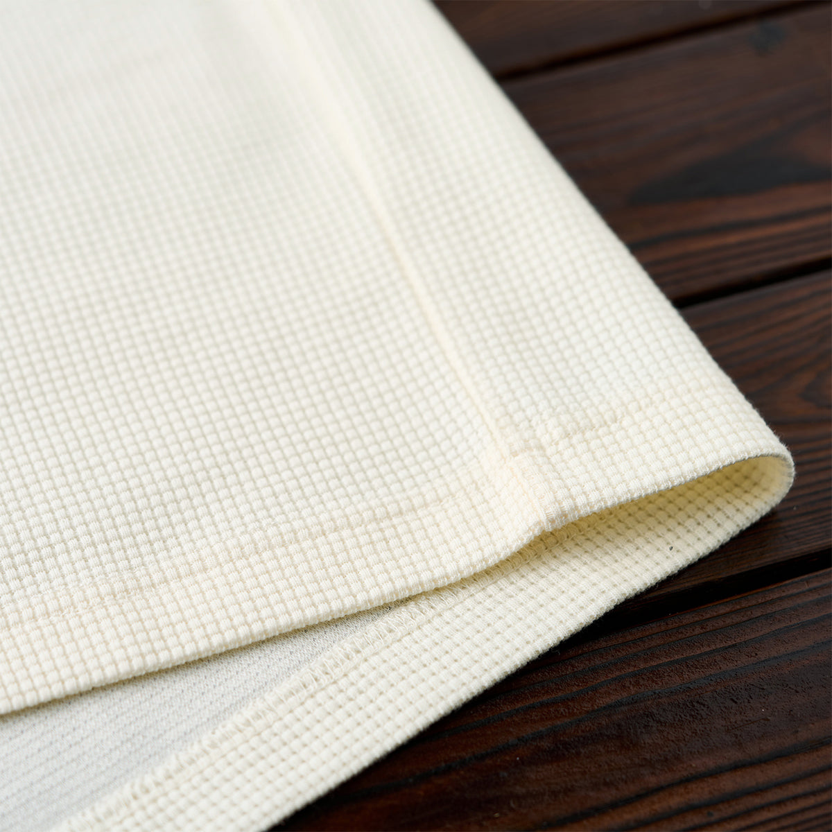 ワッフル編みの綿混紡生地が採用されて、柔らかさと通気性を提供するとともに、程よい立体感が高級感を演出。生地の厚さは中厚で、カジュアルかつリラックスした印象を与えている。