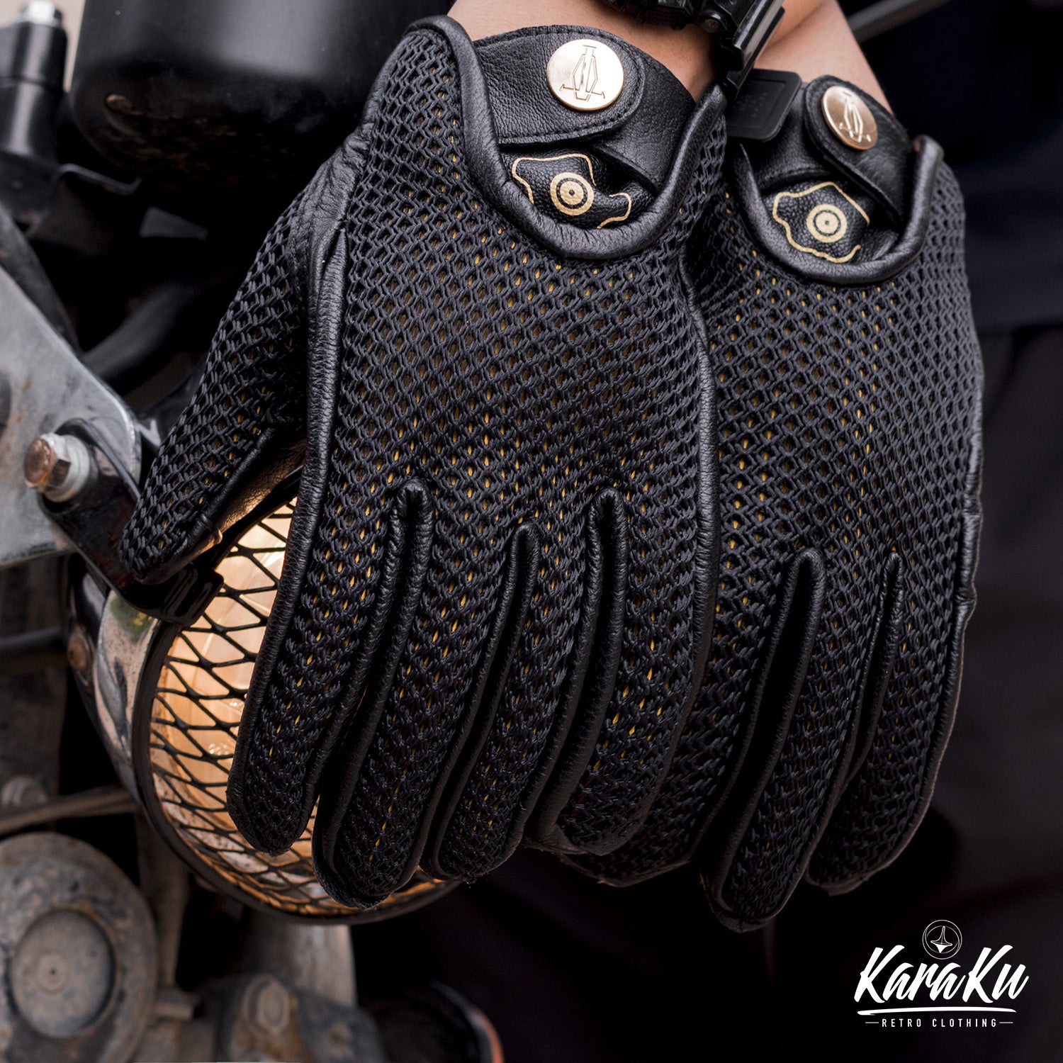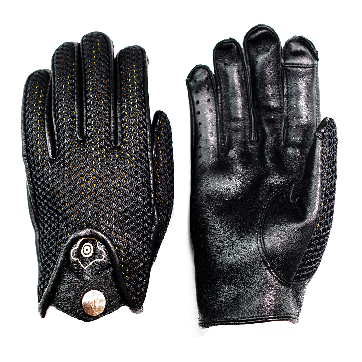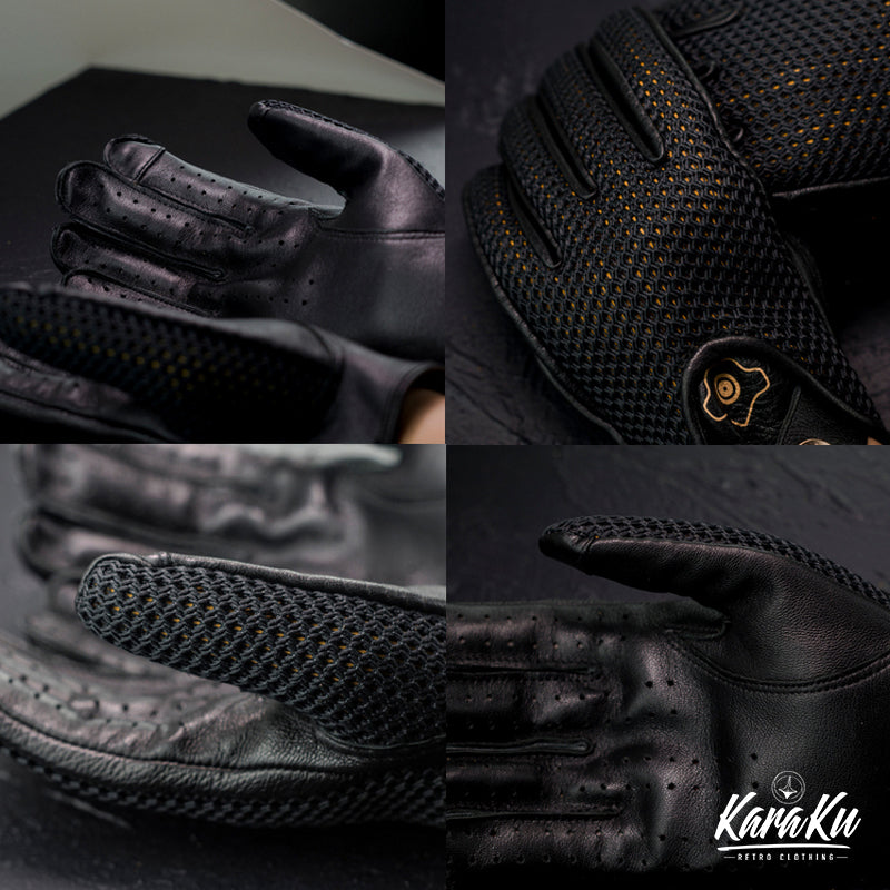 本アイテムはレザーとメッシュ素材を組み合わせのグローブ。牛の革からつくられており、耐久性が高いと同時に、手にしっかりフィットする伸縮性や、ハンドルを握るグリップ力も特徴です。手のひら部分のレザーには細かな穴がいくつも開いているため、着用時にも蒸れが少なく快適に感じられます。また、長く使い続けることで革の経年変化を楽しむこともできます。メッシュ素材の魅力は、通気性能の高さです。走行時の風をグローブの中に取り入れて、蒸れが気になる夏場でも快適に使えます。