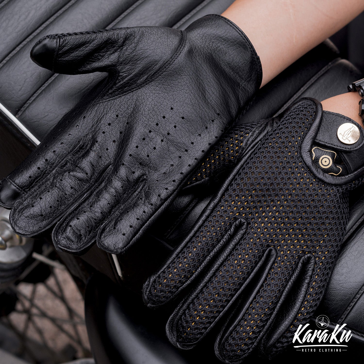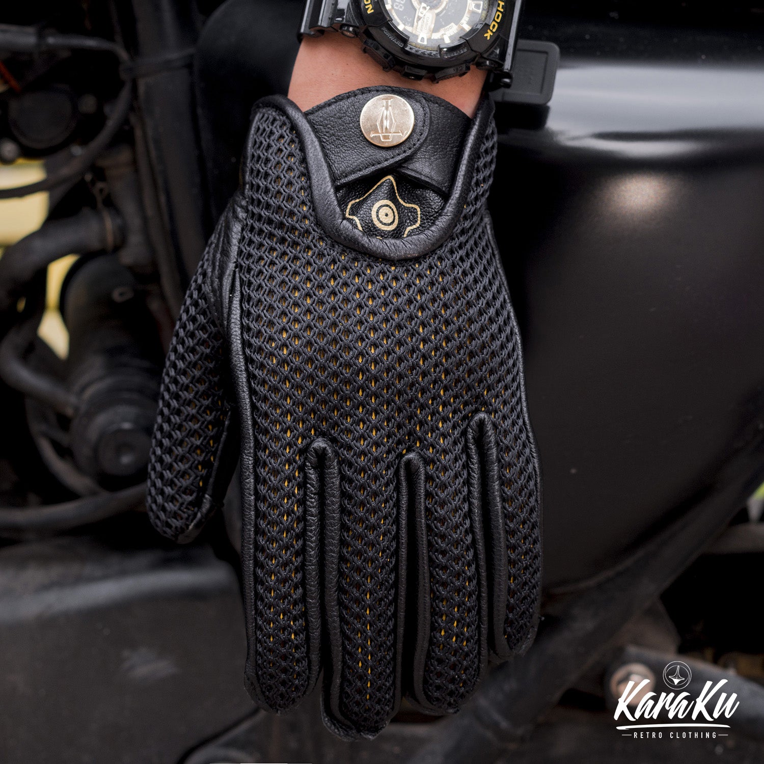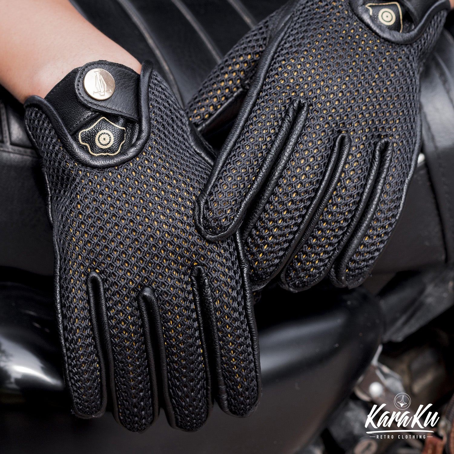 本アイテムはレザーとメッシュ素材を組み合わせのグローブ。牛の革からつくられており、耐久性が高いと同時に、手にしっかりフィットする伸縮性や、ハンドルを握るグリップ力も特徴です。手のひら部分のレザーには細かな穴がいくつも開いているため、着用時にも蒸れが少なく快適に感じられます。また、長く使い続けることで革の経年変化を楽しむこともできます。メッシュ素材の魅力は、通気性能の高さです。走行時の風をグローブの中に取り入れて、蒸れが気になる夏場でも快適に使えます。