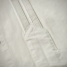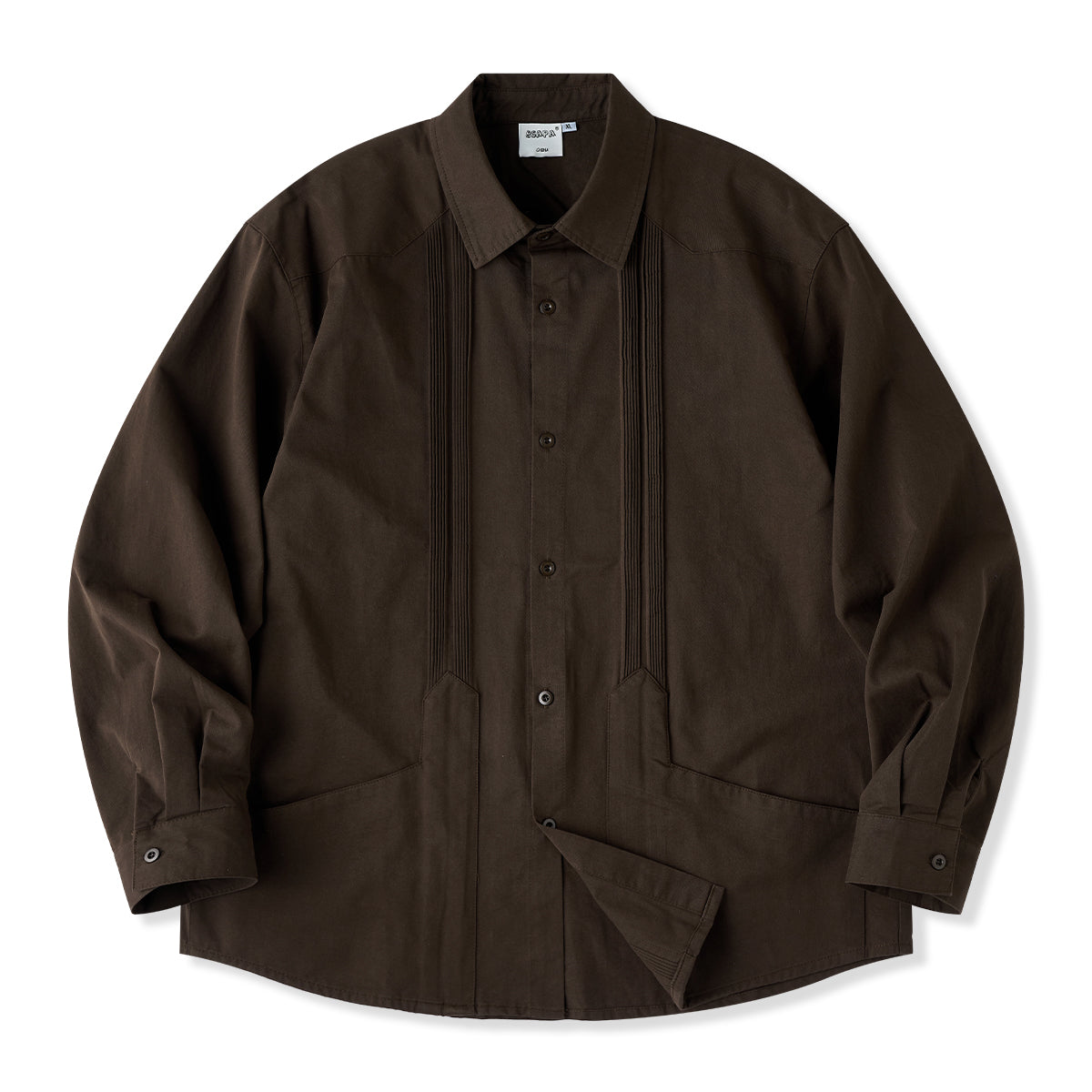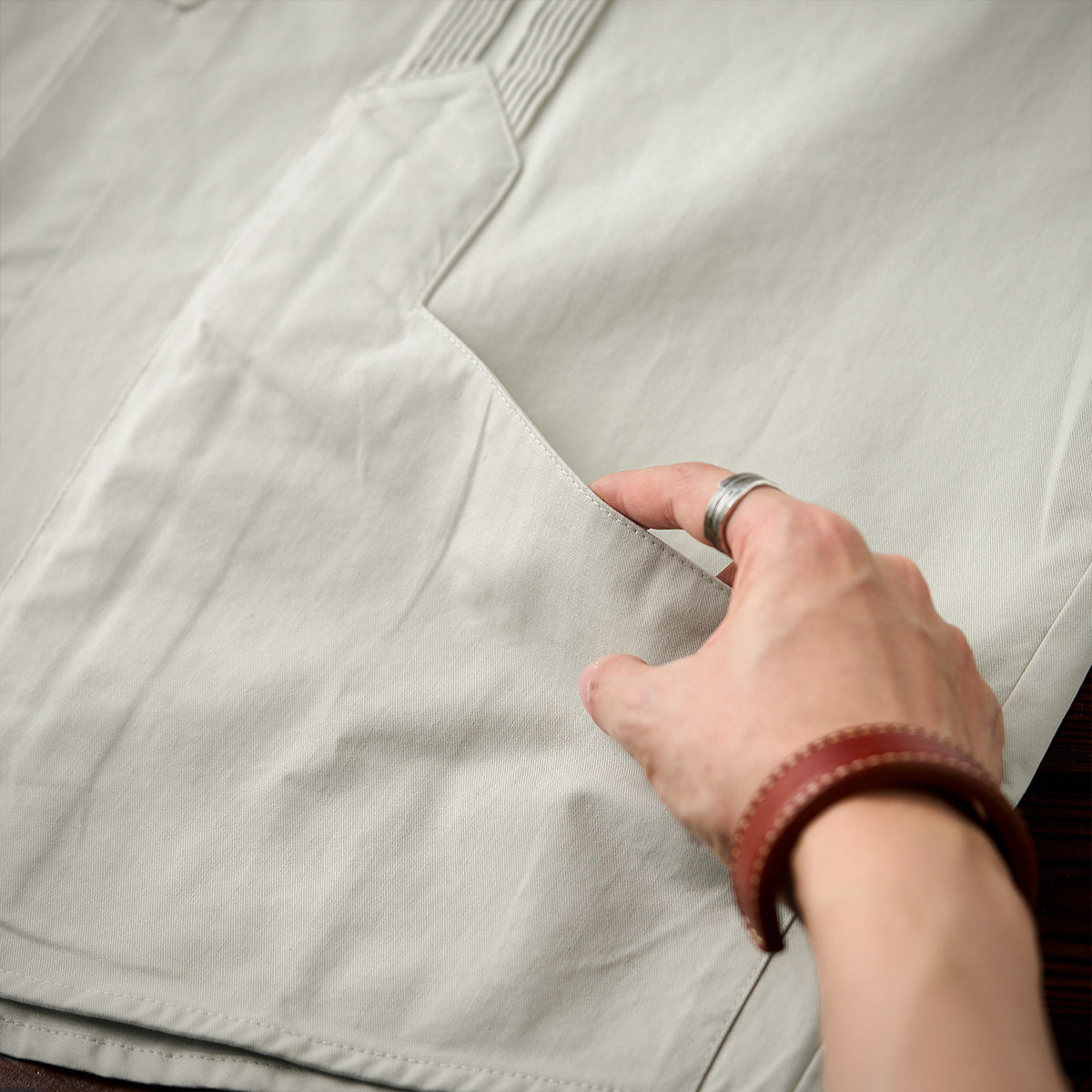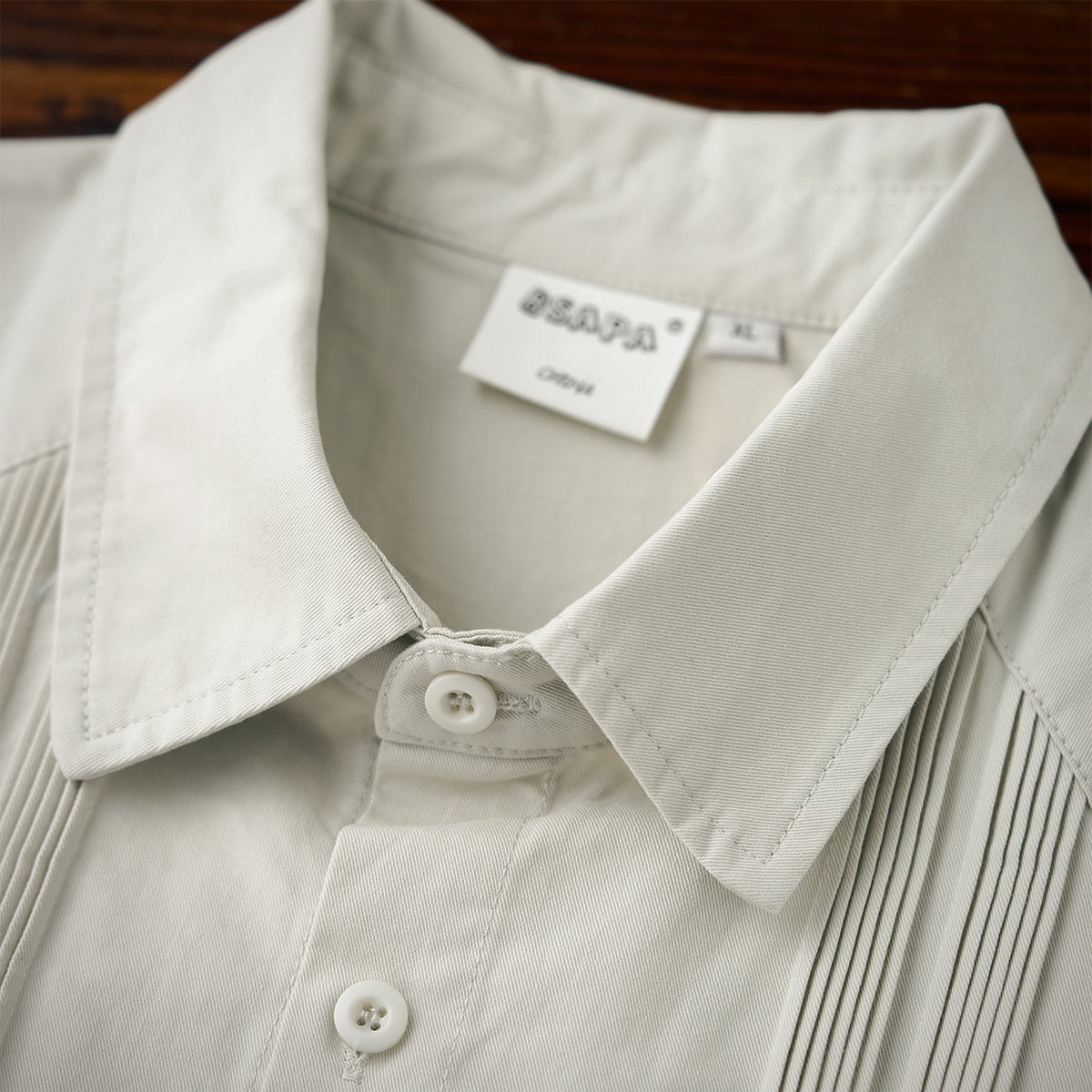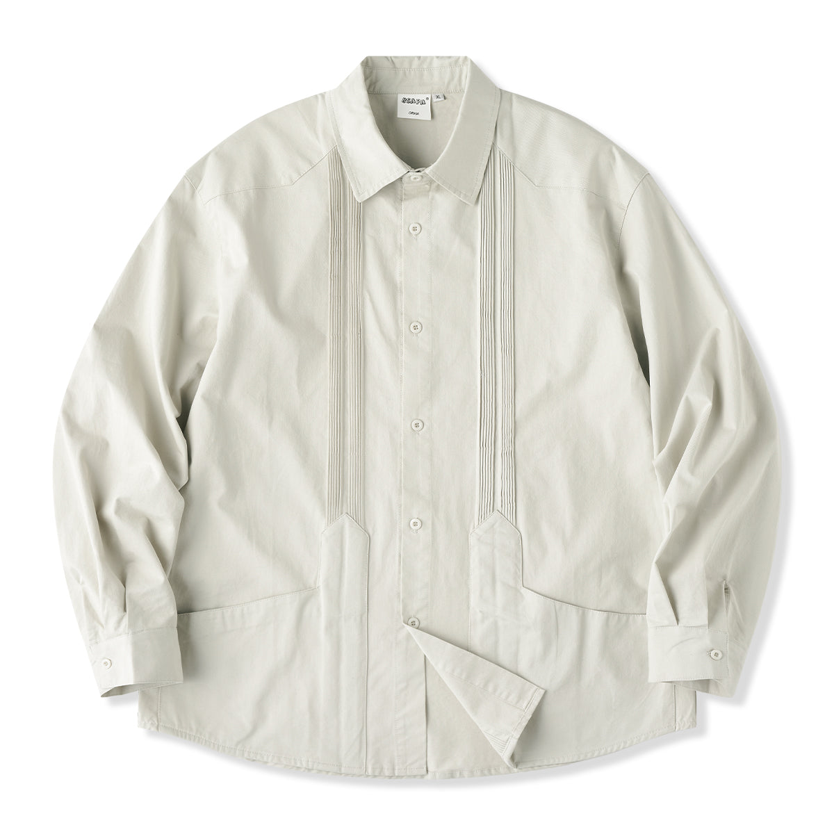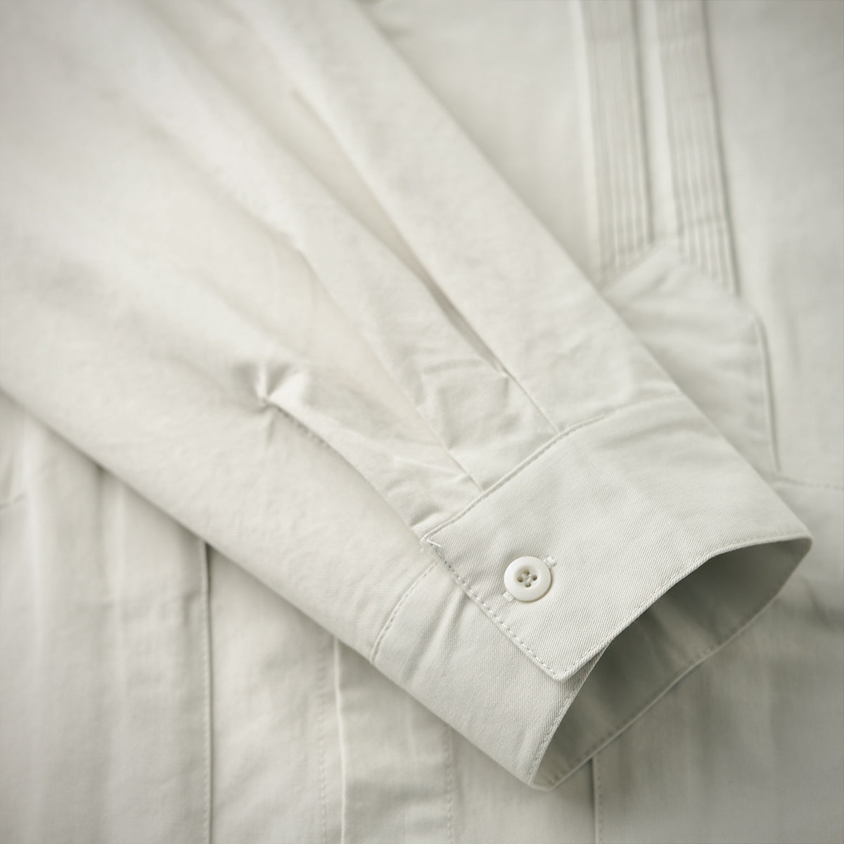 前面のピンタックや襟のデザインはクラシックなシャツの要素を取り入れつつ、全体的には直線的でクリーンな印象を与えるモダンなスタイルに仕上がっています。