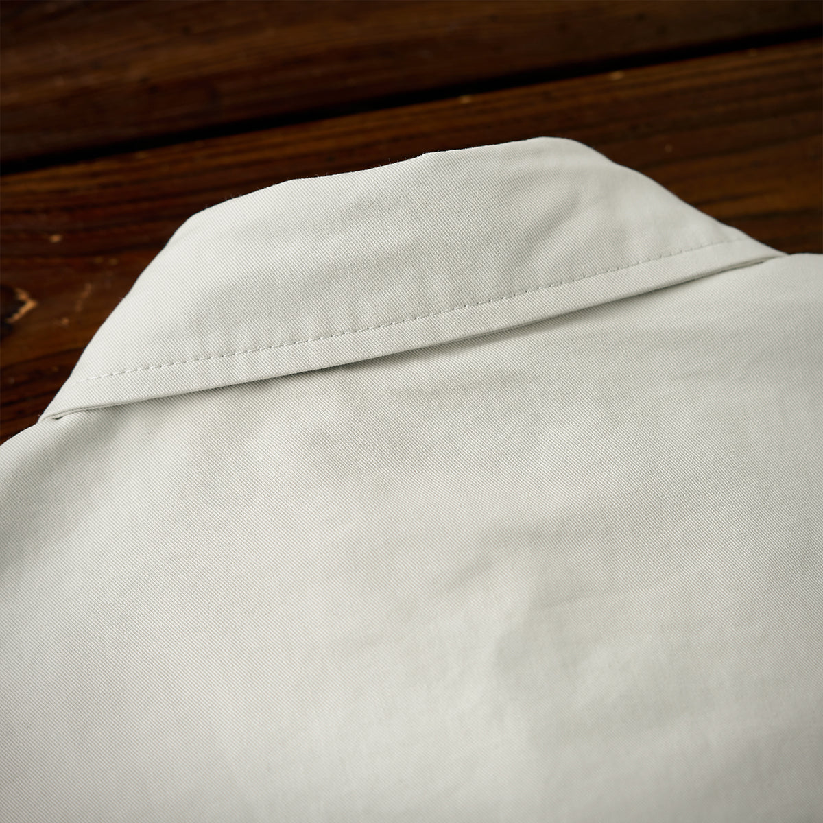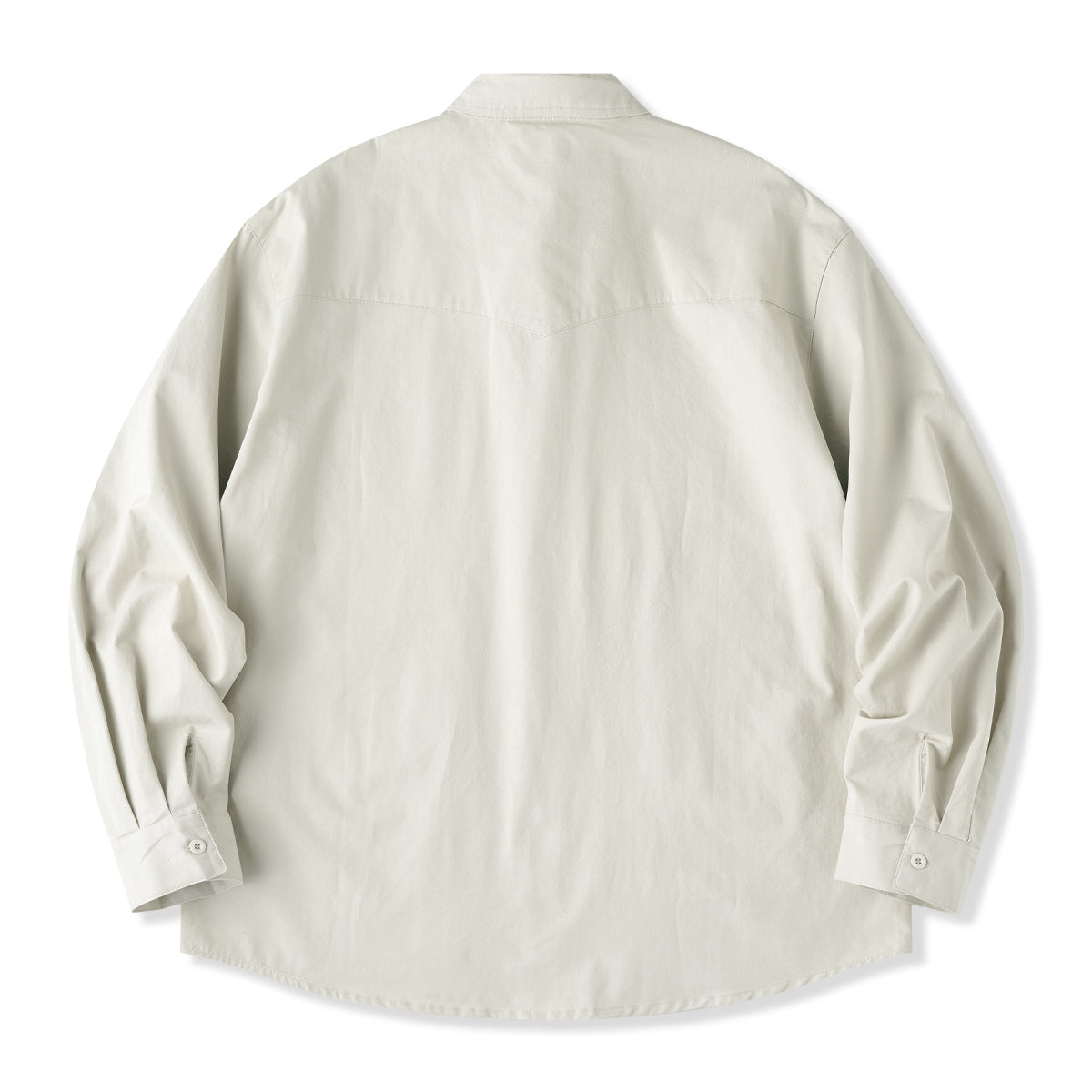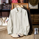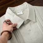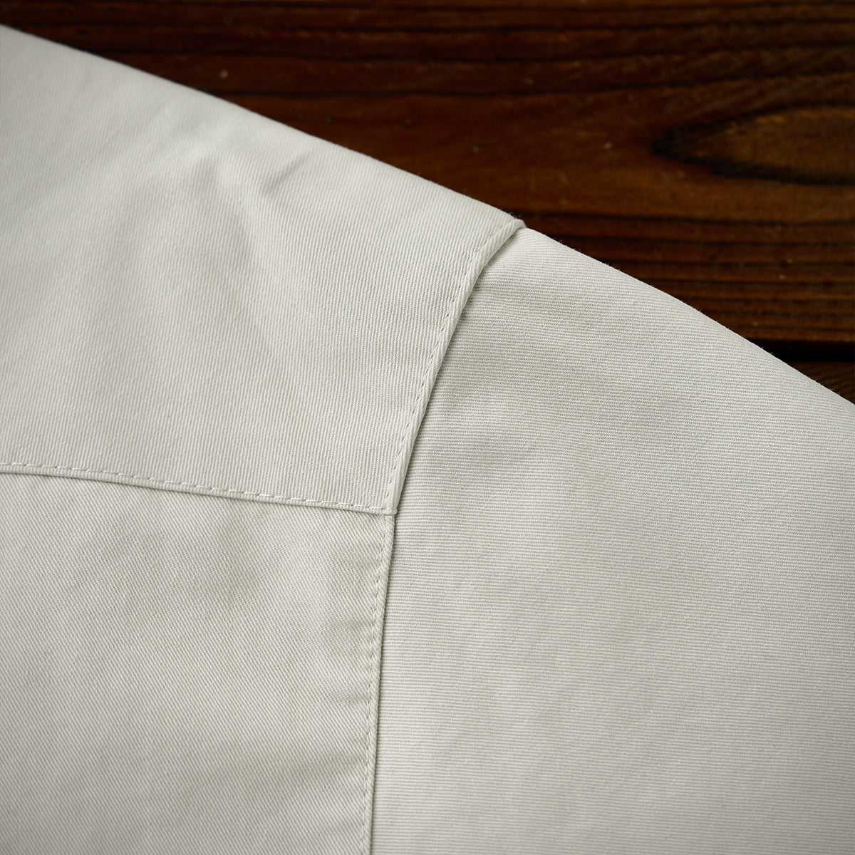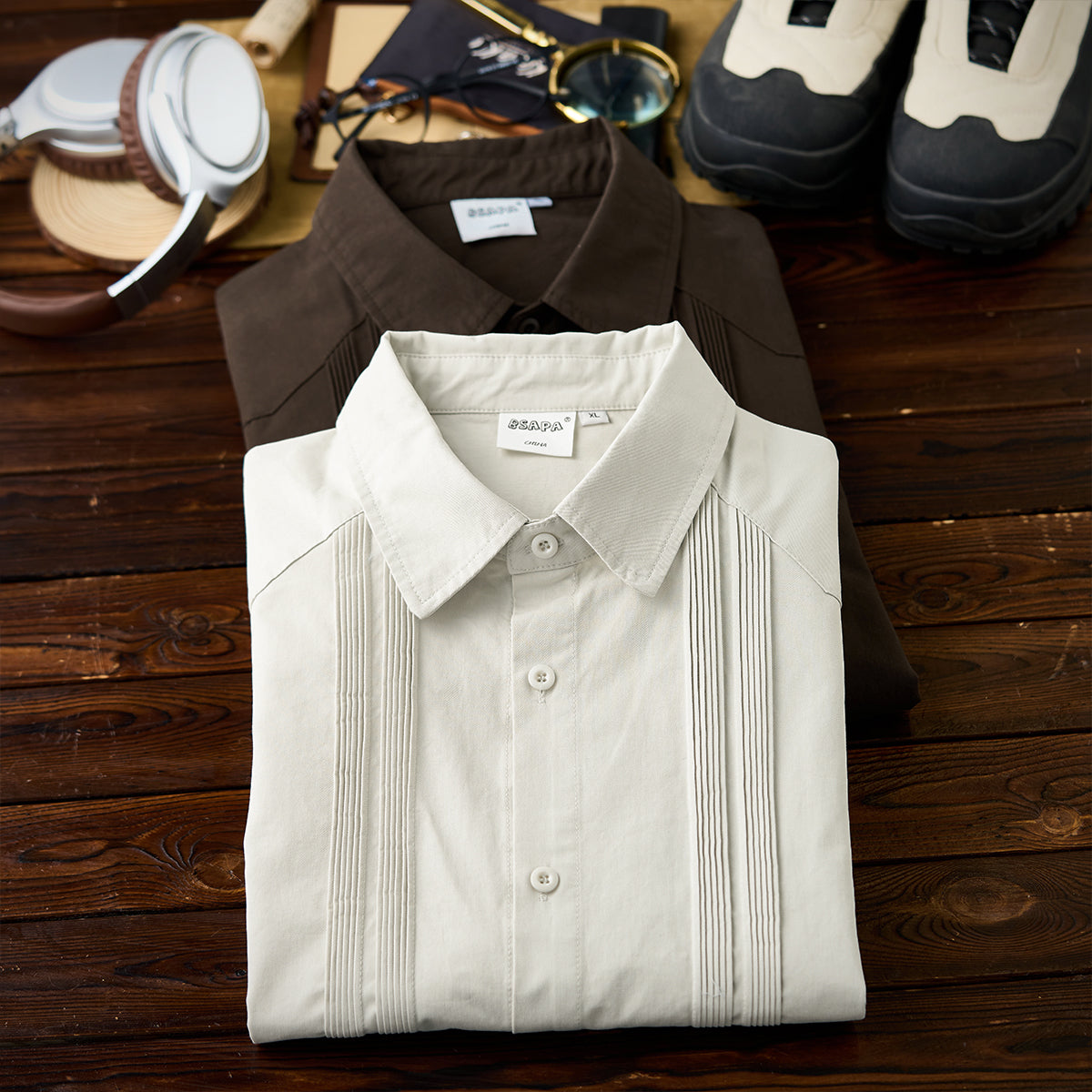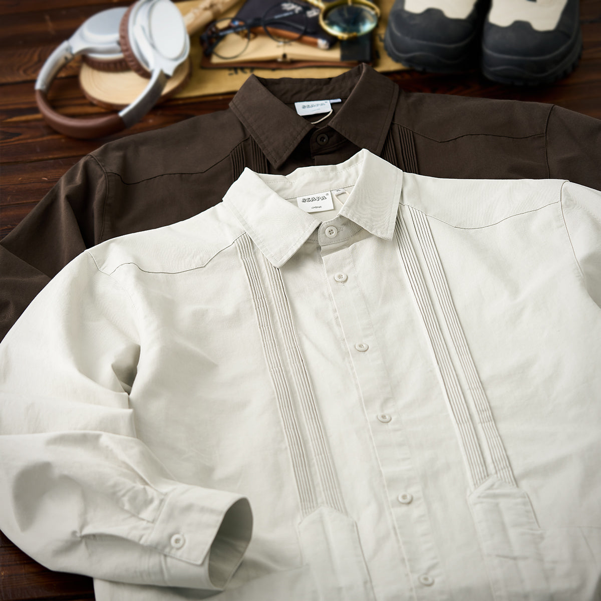 前面のピンタックや襟のデザインはクラシックなシャツの要素を取り入れつつ、全体的には直線的でクリーンな印象を与えるモダンなスタイルに仕上がっています。
