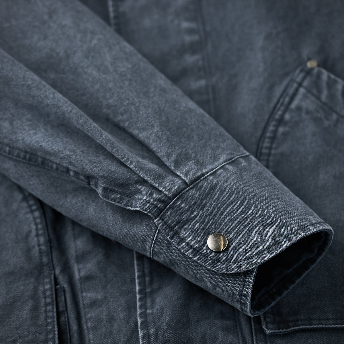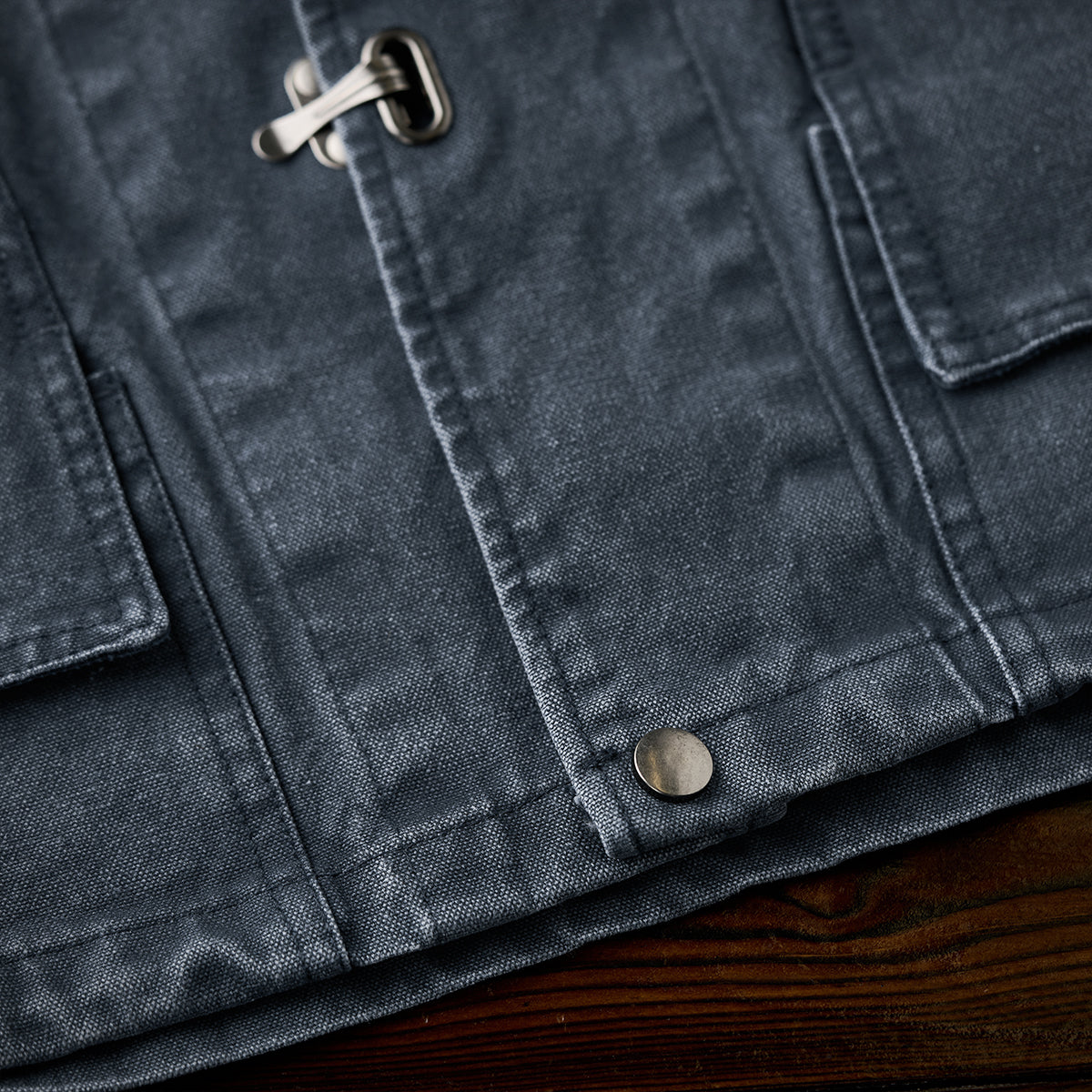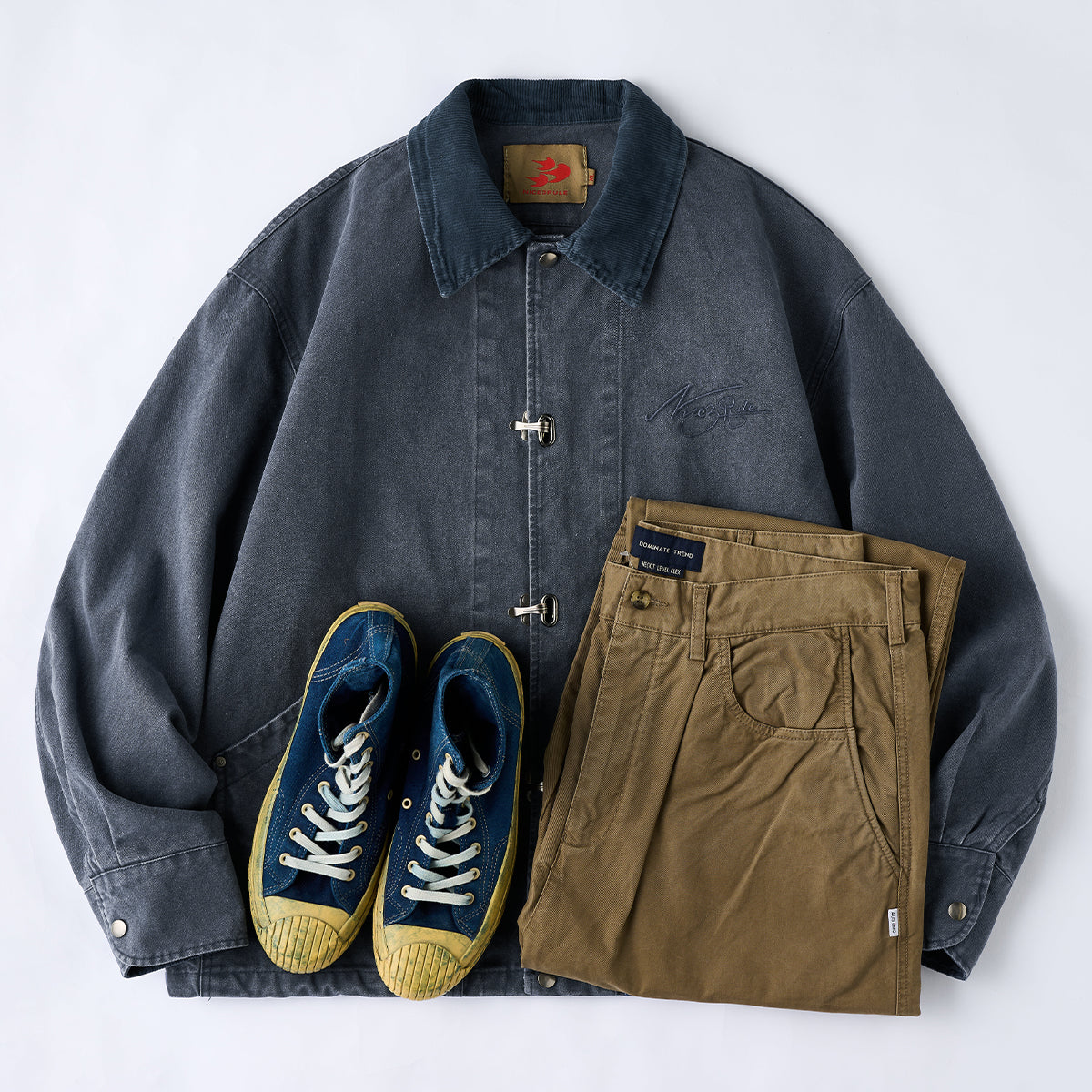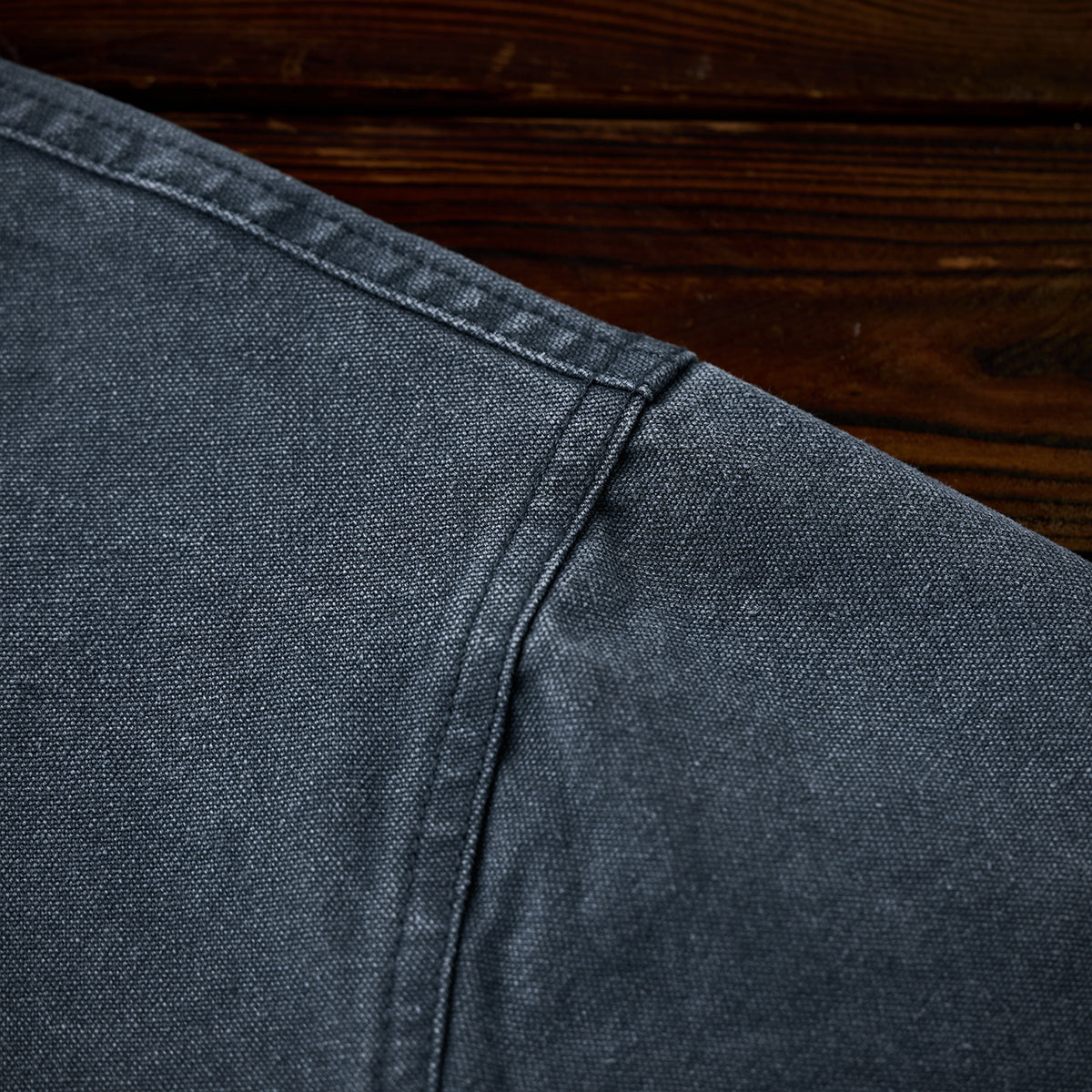 表面コットンキャンバスにややマットな質感があり、耐久性と快適性を両立しています。洗いをかけたようなフェード加工が施されており、ユーズド感と柔らかい印象を与えています。